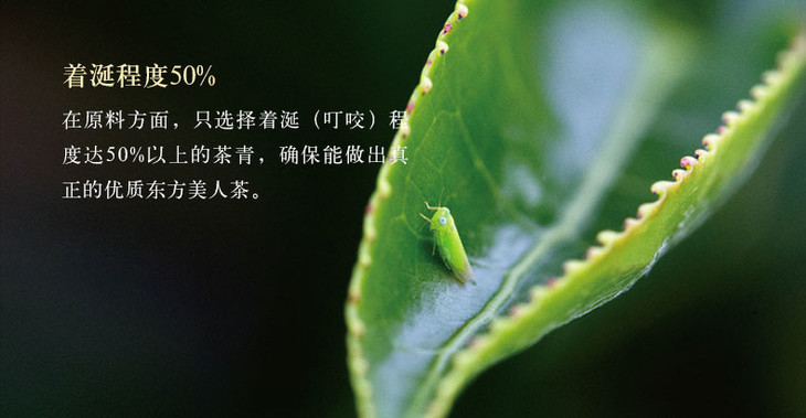 东方美人最大的特色就是需要经过小绿叶蝉的叮咬。被小绿叶蝉吸食的茶叶会启动自动防御反应,释放出以茉莉酸为基础的一系列的香味物质,昆虫的唾液与茶叶酵素混合,再经过自然发酵,才能具有独特的蜜香和果香。