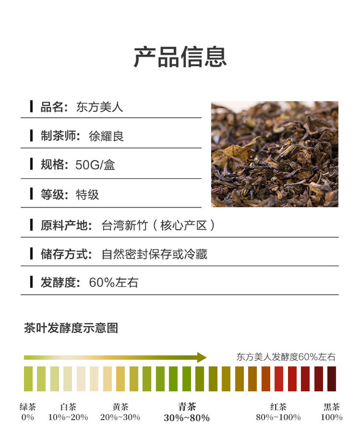 这一款东方美人茶,产自台湾新竹大名鼎鼎的徐氏茶园。徐家三代制茶,凭借“头水二香三外观”的独特的制茶技艺,独步天下。徐氏茶园环境优美,远离污染,碧水青山,造就了每一口好茶!