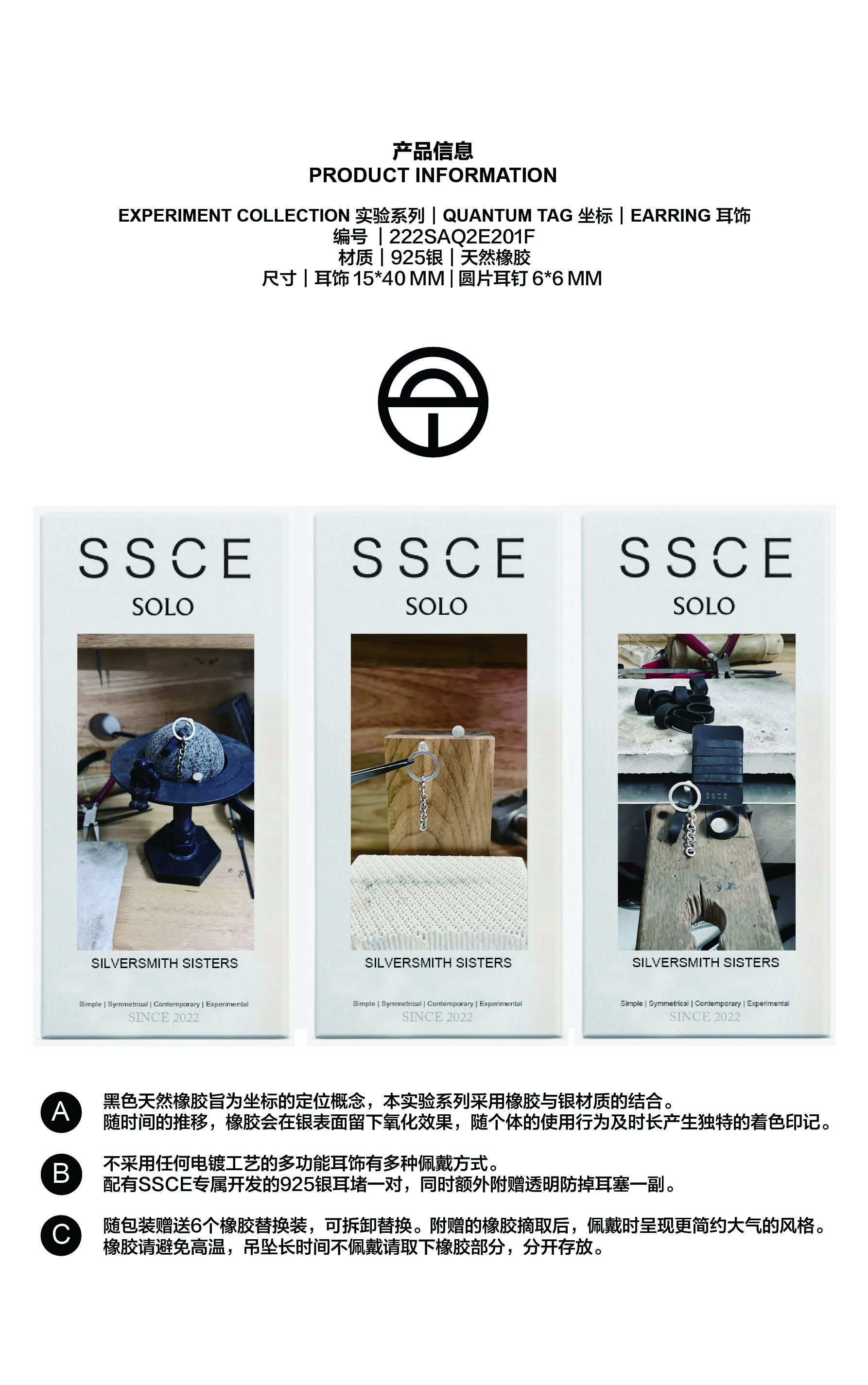 SSCE|222SAQ2E201F Earrings坐标不对称耳环15x40mm 6x6mm【QUANTUM TAG】