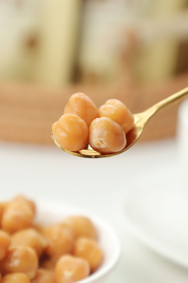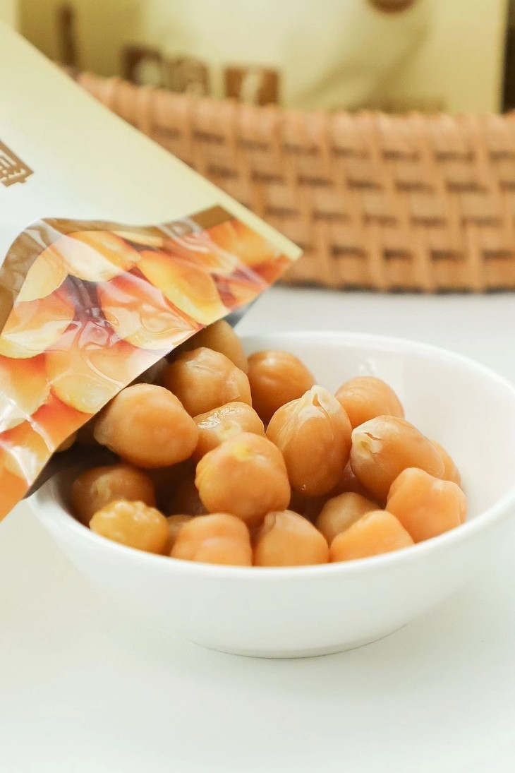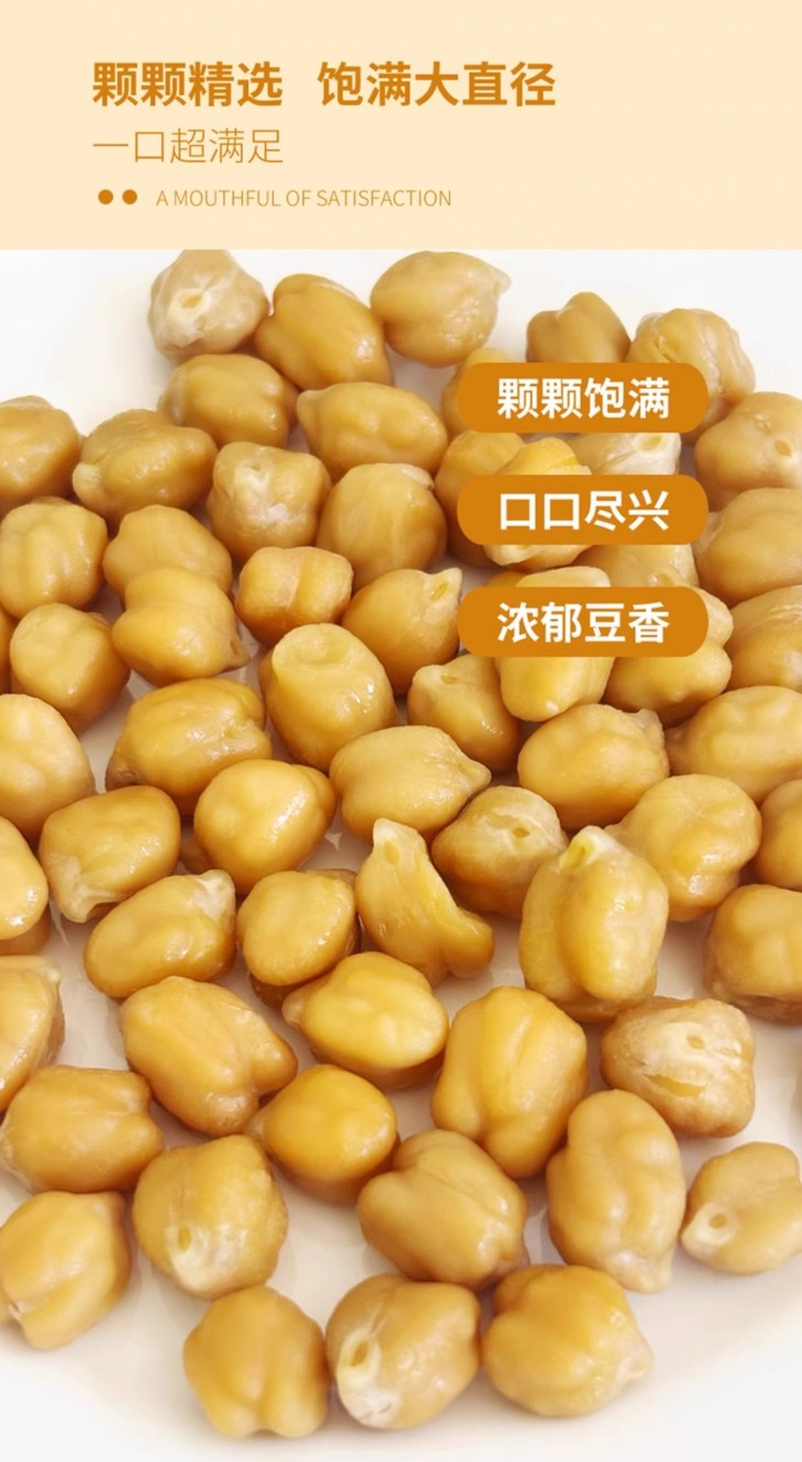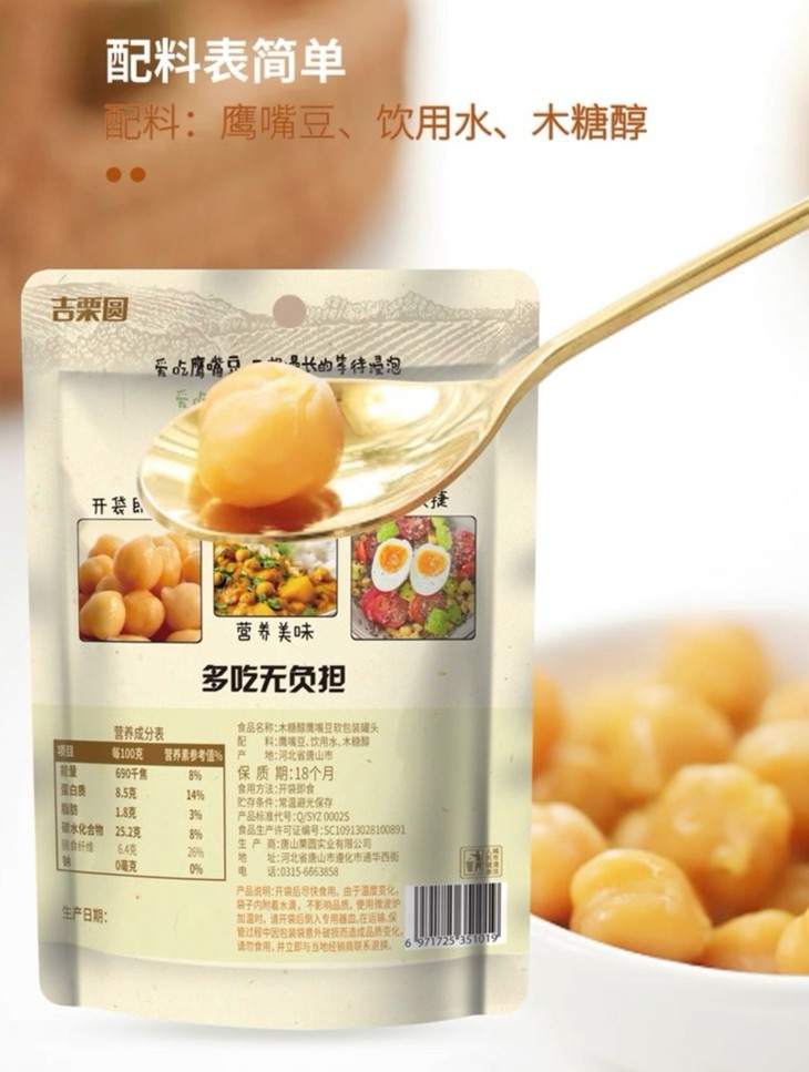 鹰嘴豆的原料选自新疆木垒县,这里被称为"中国鹰嘴豆之乡",我国83%的鹰嘴豆都来源于此。木垒地处天山北坡,种植土壤是肥沃的黑钙土,有机质积累丰富,肥力充足。而且这里海拔较高,炎热沙漠气候与冰川气候交替作用,十分符合鹰嘴豆耐旱喜凉的生长习性。每年四月至八月的鹰嘴豆生长期间,一望无际的百万亩鹰嘴豆田,景色颇为壮观。品牌采用人工挑选的优质鹰嘴豆,经过高温蒸煮杀菌后,再进行无菌封装并充入氮气,自然隔绝氧气。在无菌无氧的环境下,菌群难以生长,凭借这种先进的制作工艺,不添加任何防腐剂也能达到18个月的保质期。配料表里只有鹰嘴豆、饮用水、木糖醇,用木糖醇代替蔗糖,血糖高患者也可适量吃吃,老少皆宜哦!