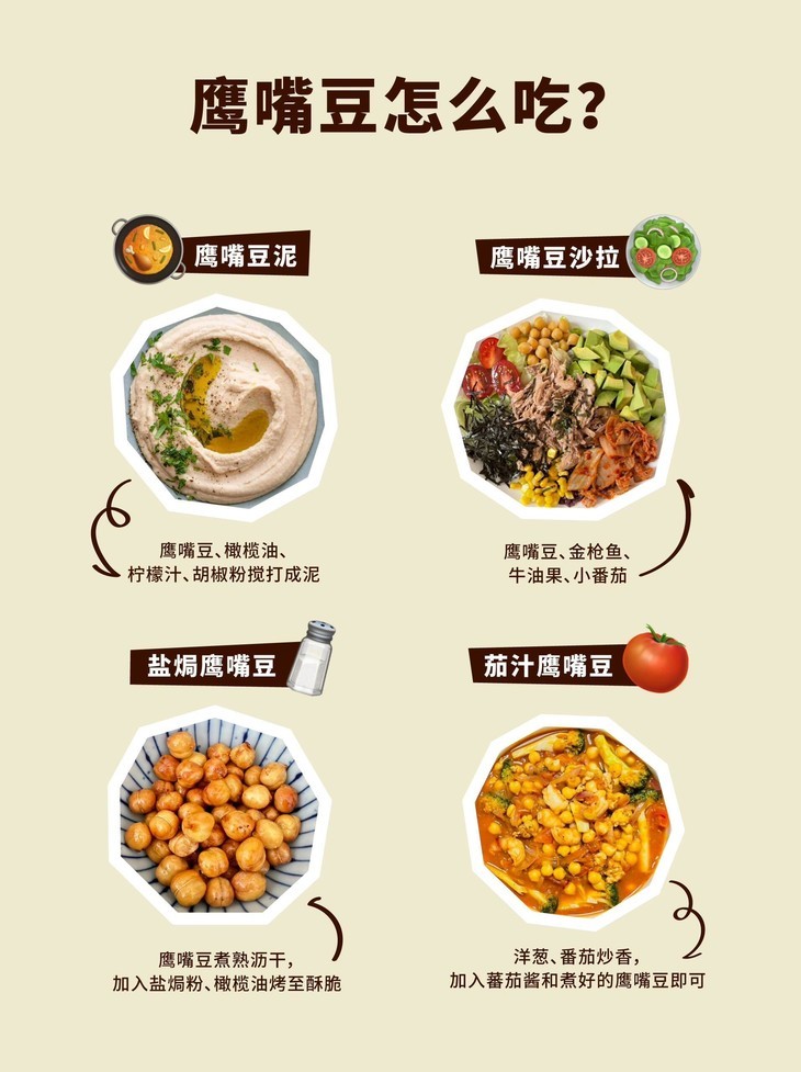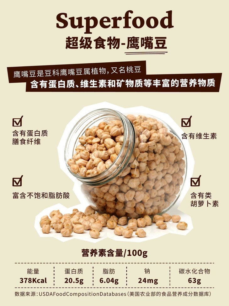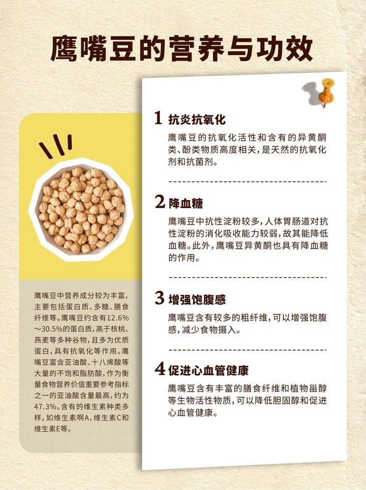鹰嘴豆之所以能成为21世纪爆火的"超级食物",还被称为"豆中之王",是因为它同时兼具了低脂肪、低升糖、高膳食纤维、高蛋白这4大优点。鹰嘴豆含有75%的不饱和脂肪,其中亚油酸比例就占到了总脂肪的43%,很适合作为"三高"群体的日常食品;鹰嘴豆的GI较低,属于低升糖指数食物,糖尿病患者也可适量食用;鹰嘴豆含有丰富的膳食纤维,约11.6克/百克,差不多是燕麦米的2倍、香蕉的10倍,能满足人体每日所需纤维的50%;每100克鹰嘴豆约含22克蛋白质,相当于牛奶的7倍、鸡蛋的2倍,而且它所含的蛋白质还和大豆蛋白一样,属于质量高的优质蛋白质。无论是老人小孩,或者是减脂控卡人,都可以放心吃起来!