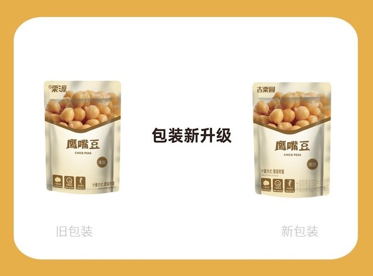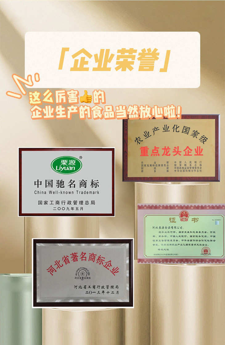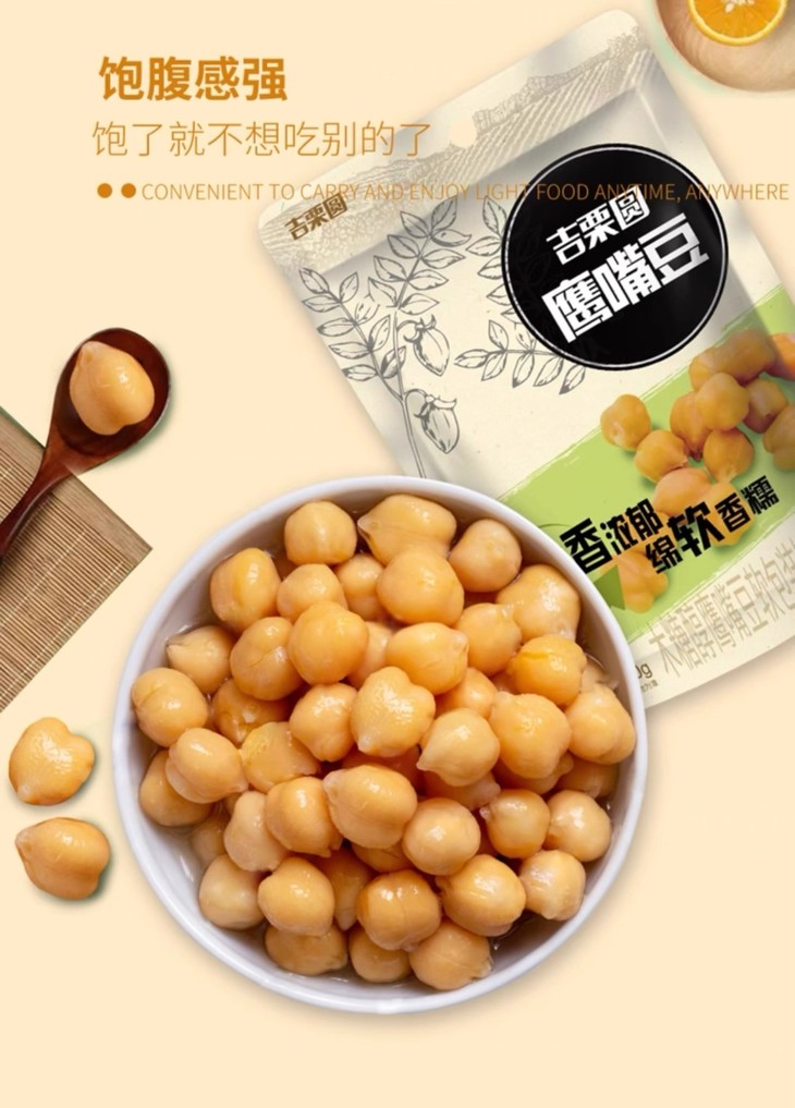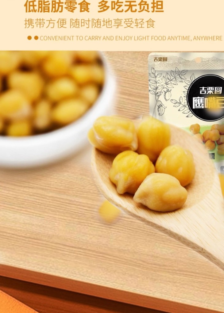 吉栗圆鹰嘴豆来自成立于1999年的河北栗源食品有限公司,这家公司可是中国第一袋小包装甘栗仁的诞生地。公司通过了ISO9001国际质量体系认证、绿色食品认证、HACCP验证,以及日本JAS有机食品认证、欧盟BCS认证、英国BRC认证、清真Halal认证和犹太OU认证,已形成完善的质量保证体系。其各项食品安全卫生指标均达到国际标准,并且严格把控"三同"标准,即同一生产线、按相同的标准生产,让国内市场和国外市场的产品质量水准保持一致,让我们吃得更放心。