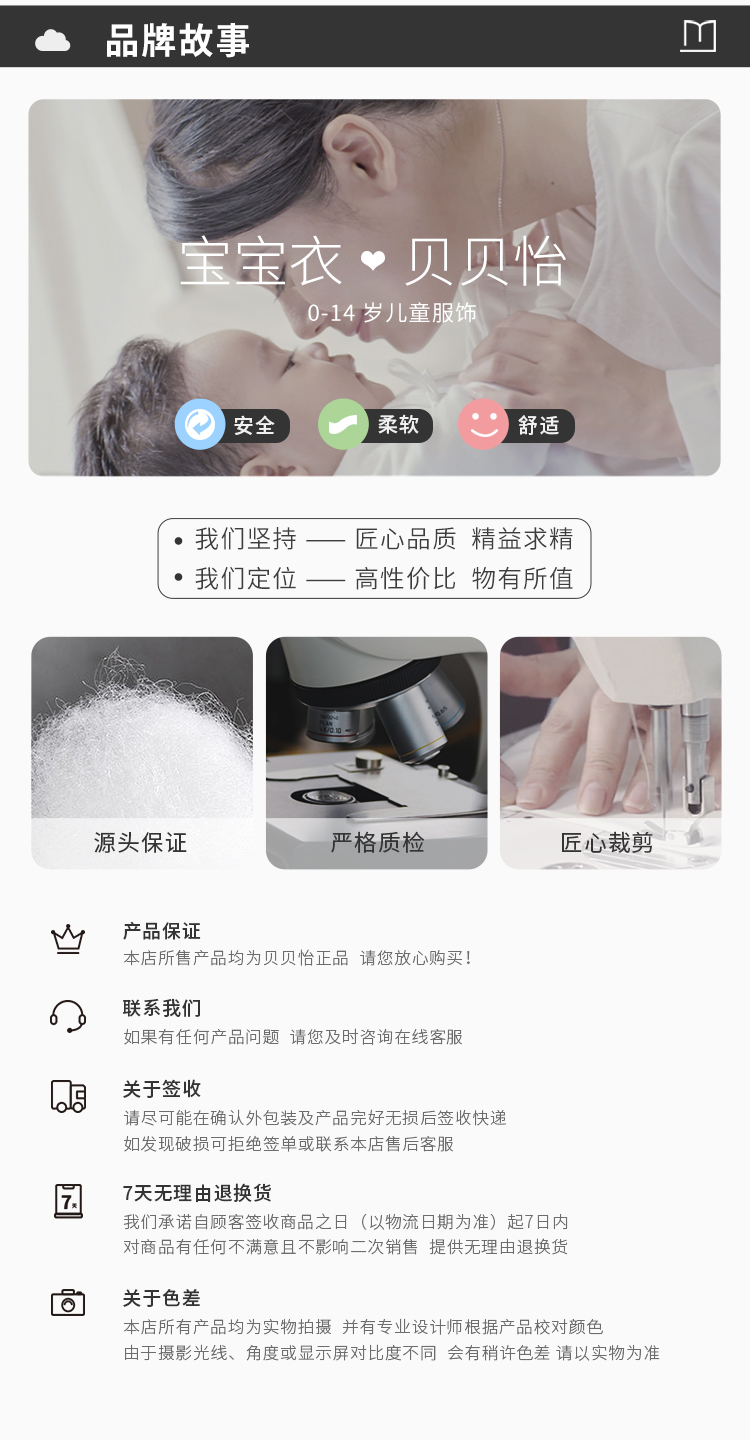 - 贝贝怡专注0-6岁婴幼儿服饰,坚持安全、柔软、舒适的产品理念,为千万中国家庭提供超高品质、安全可靠的婴幼儿服饰产品,妈妈放心,宝宝开心!