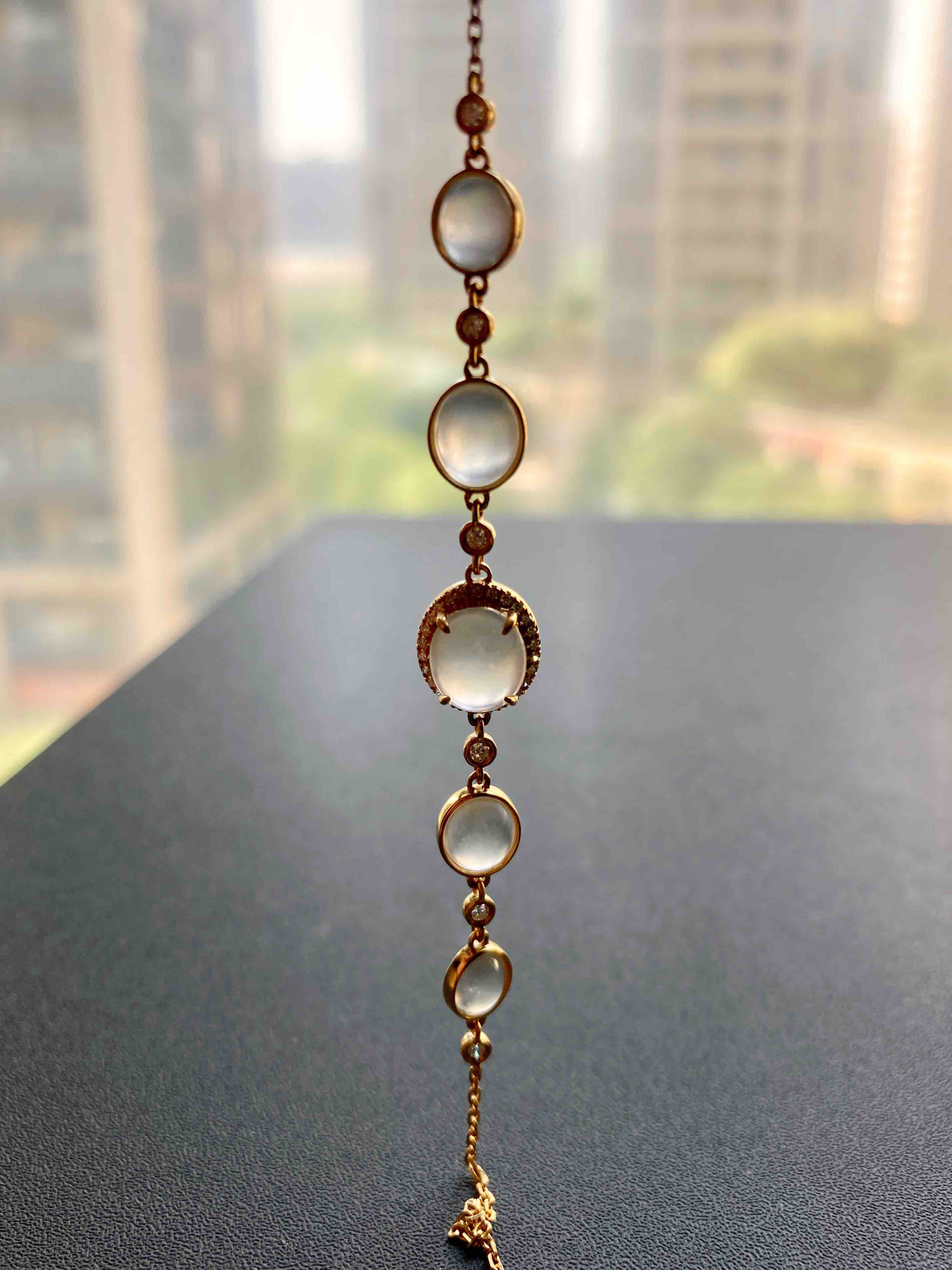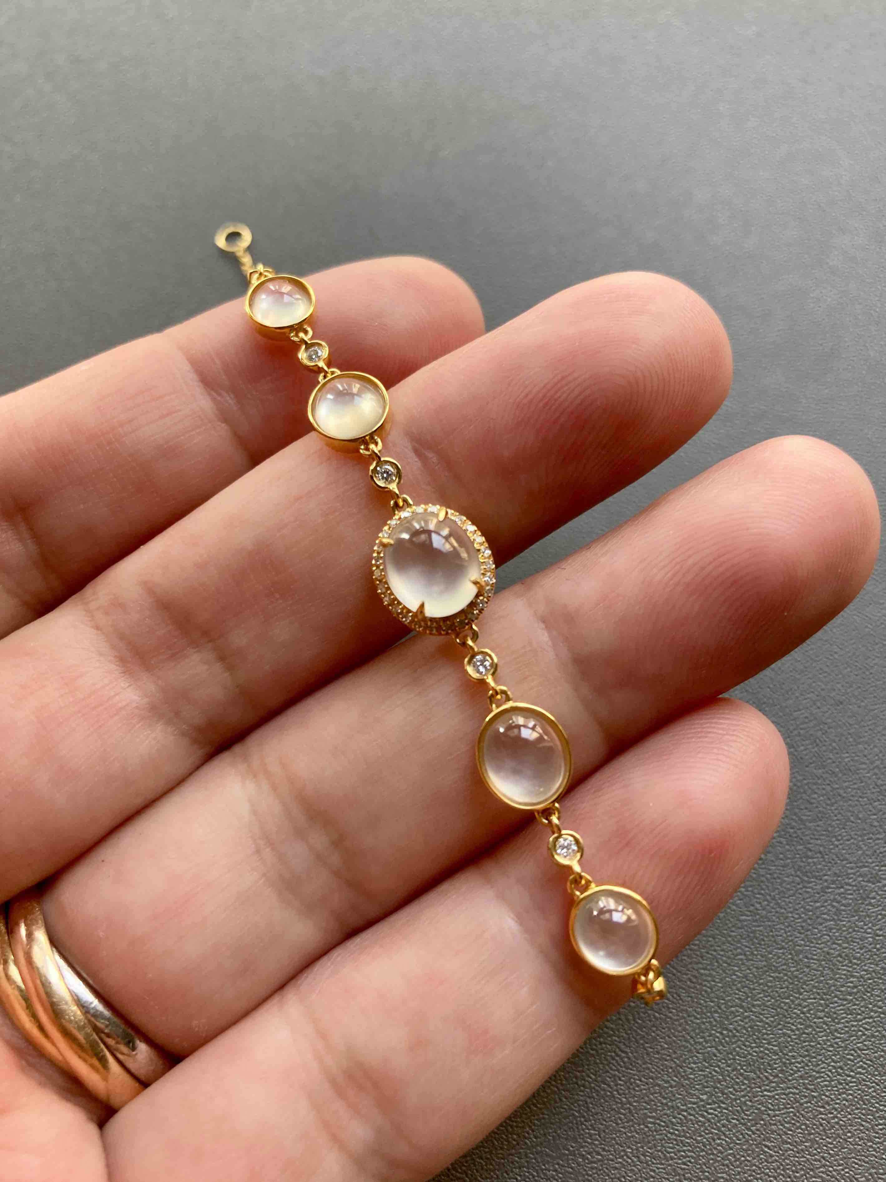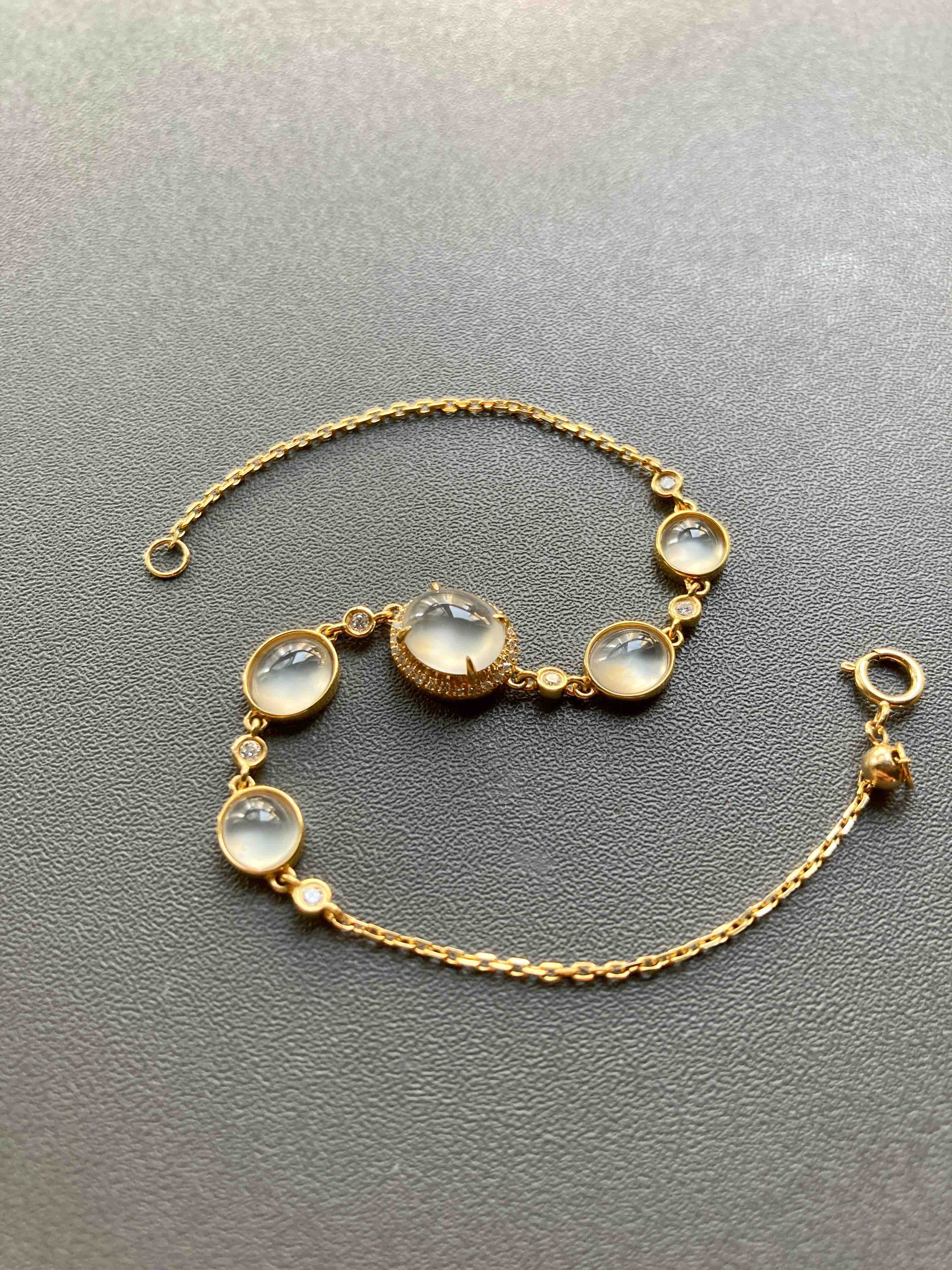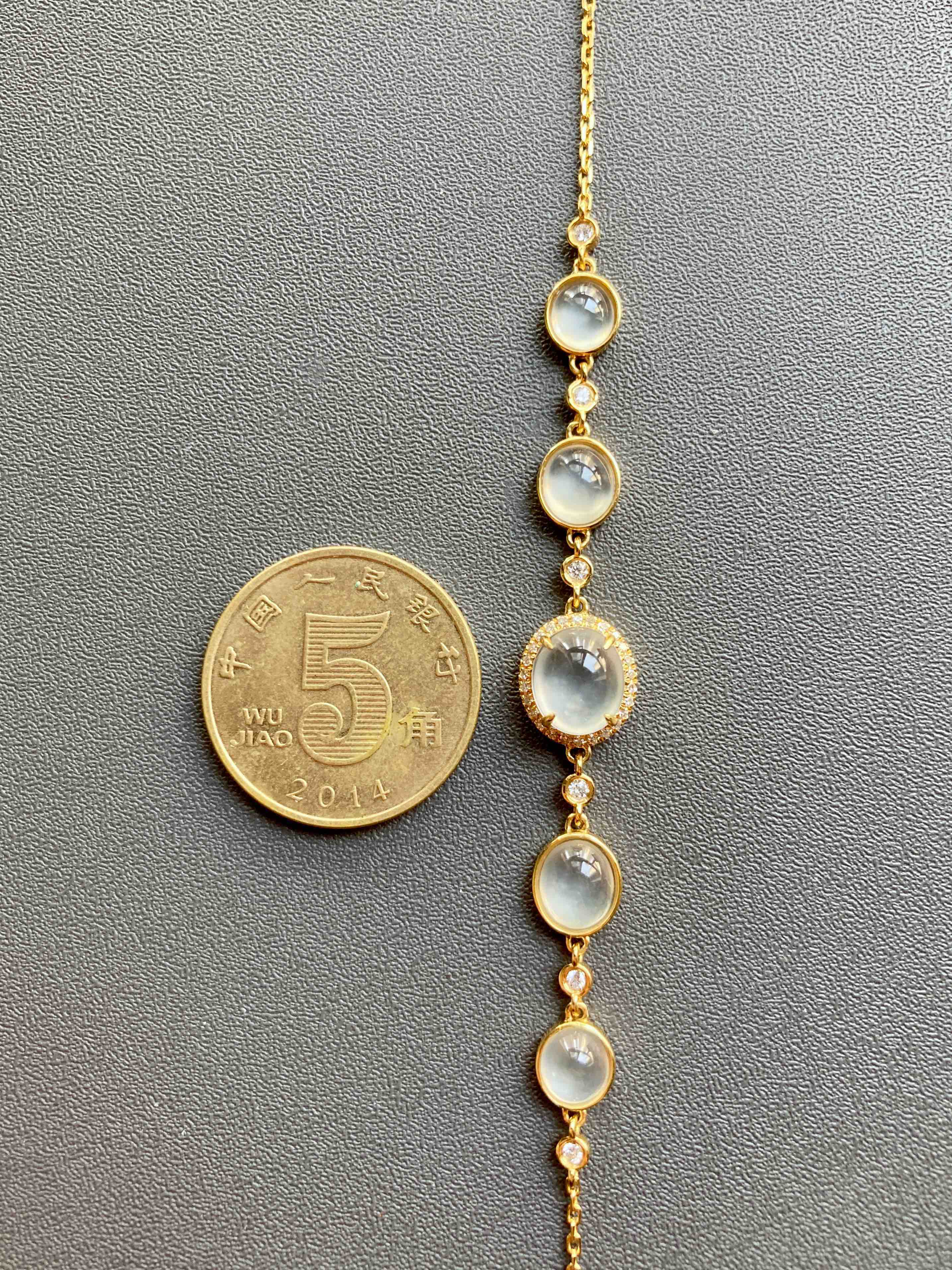 玻璃种大眼睛,上手太漂亮了,玻璃种翡翠蛋面手链,种水绝了,荧光四射,强刚性表现,18k黄金钻石镶嵌,时尚而又大气的款式,想想一颗玻璃种蛋面多少钱,我们五颗再加上金钻镶嵌还这么便宜,强烈推荐,蛋面从5.4mm到7.5mm,链长16cm,带无极长度调节。