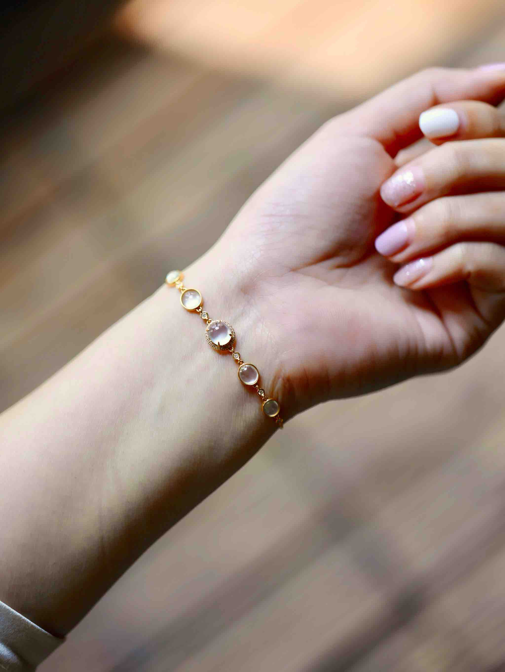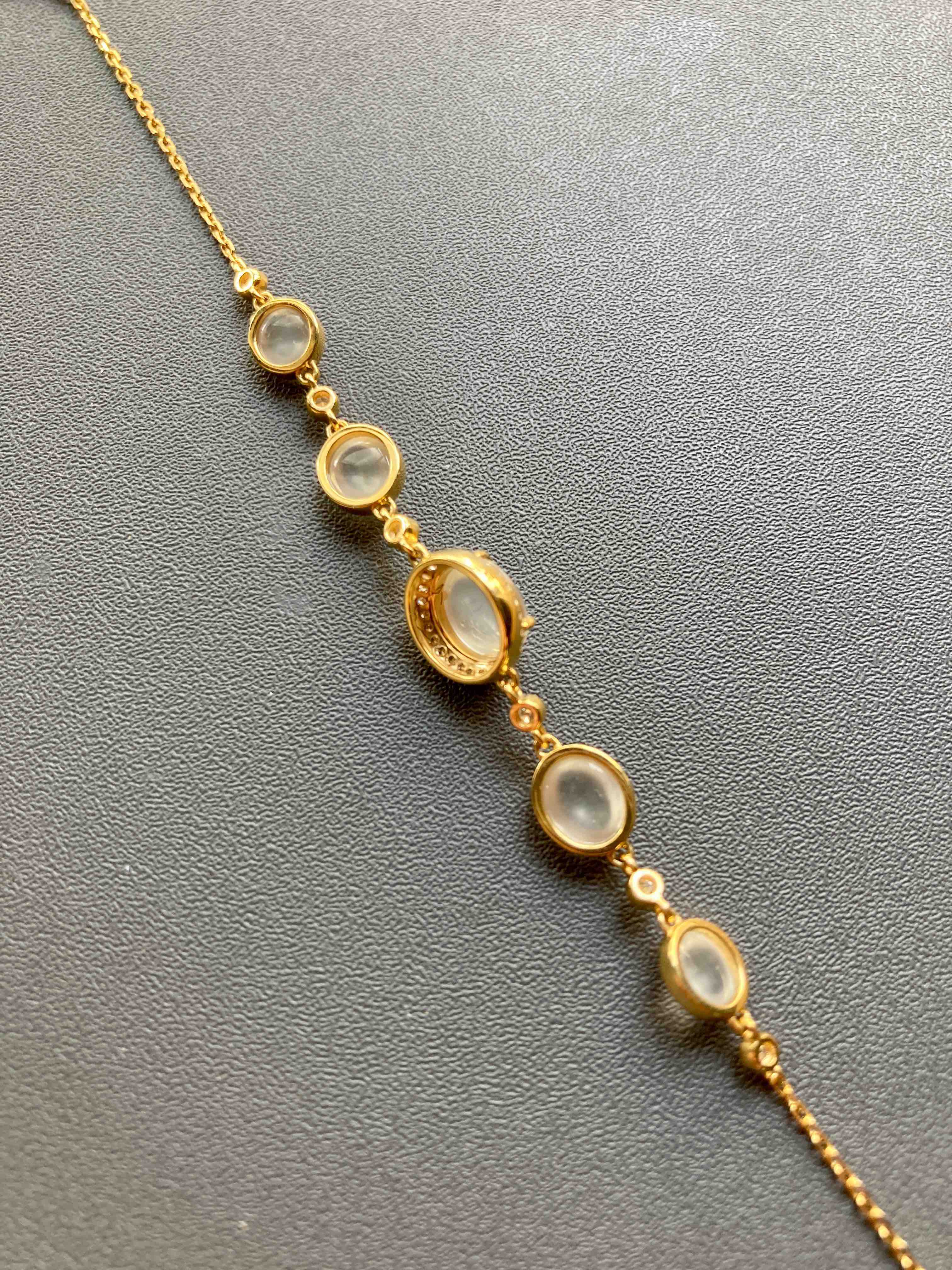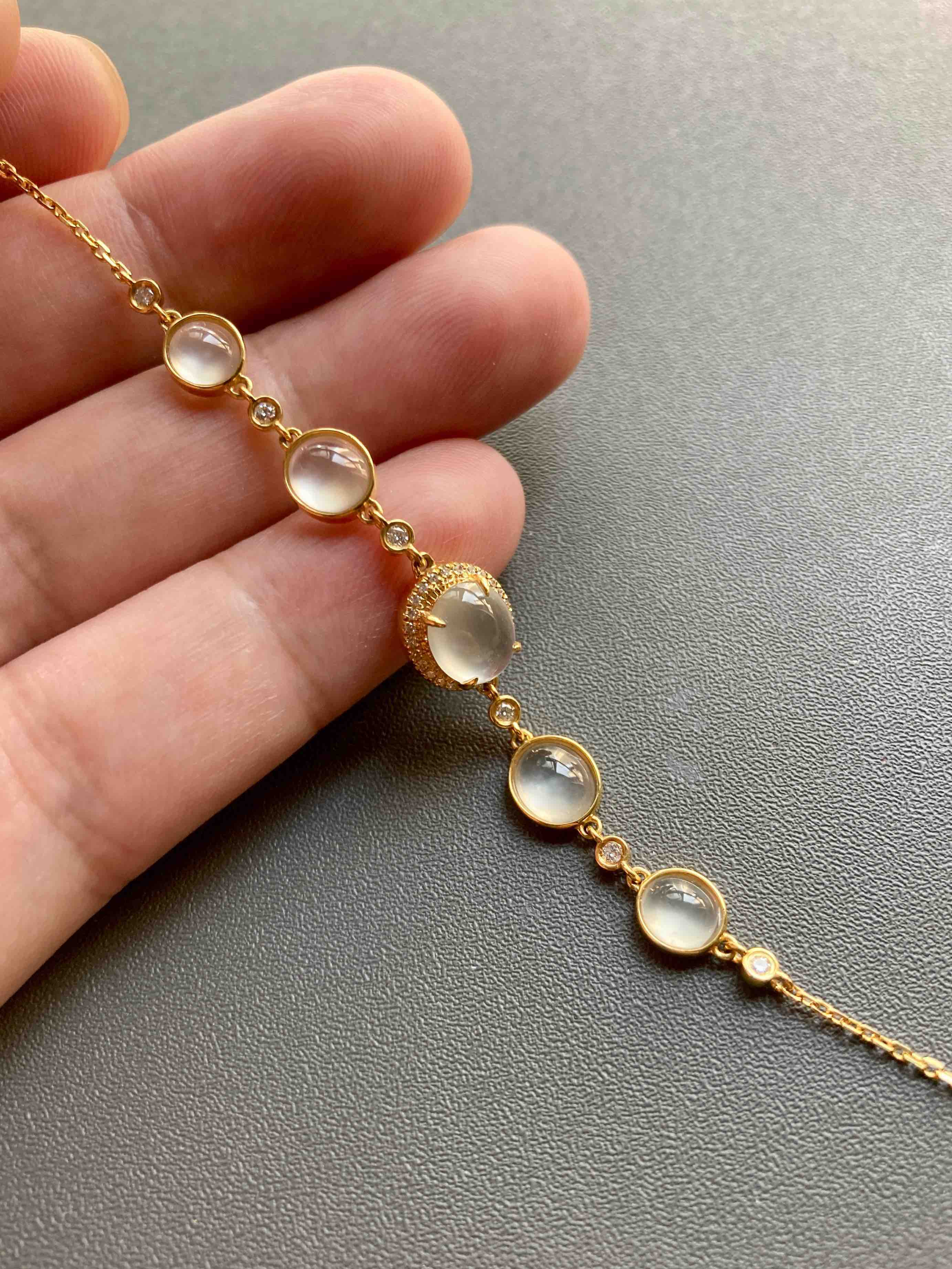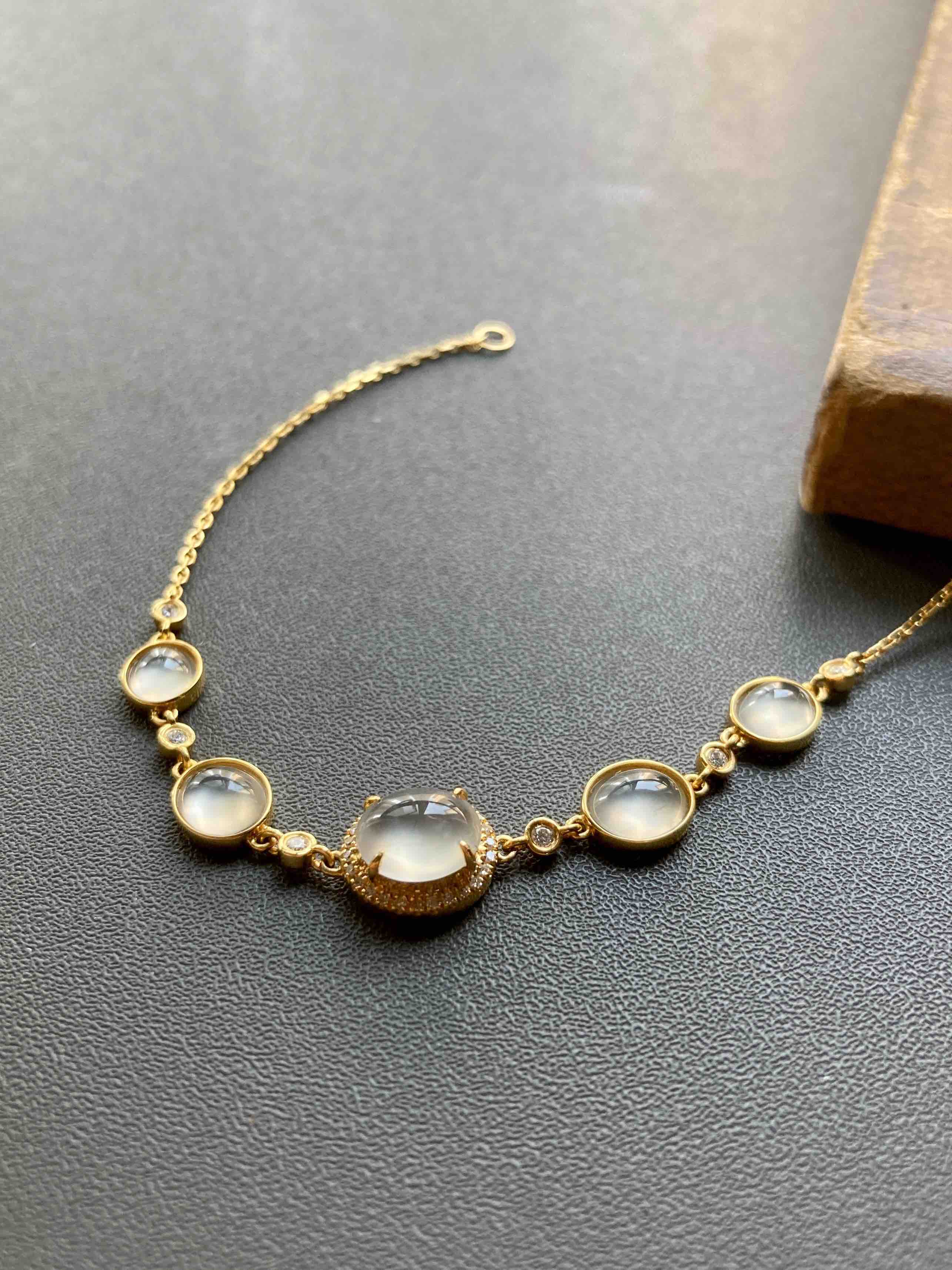 玻璃种大眼睛,上手太漂亮了,玻璃种翡翠蛋面手链,种水绝了,荧光四射,强刚性表现,18k黄金钻石镶嵌,时尚而又大气的款式,想想一颗玻璃种蛋面多少钱,我们五颗再加上金钻镶嵌还这么便宜,强烈推荐,蛋面从5.4mm到7.5mm,链长16cm,带无极长度调节。