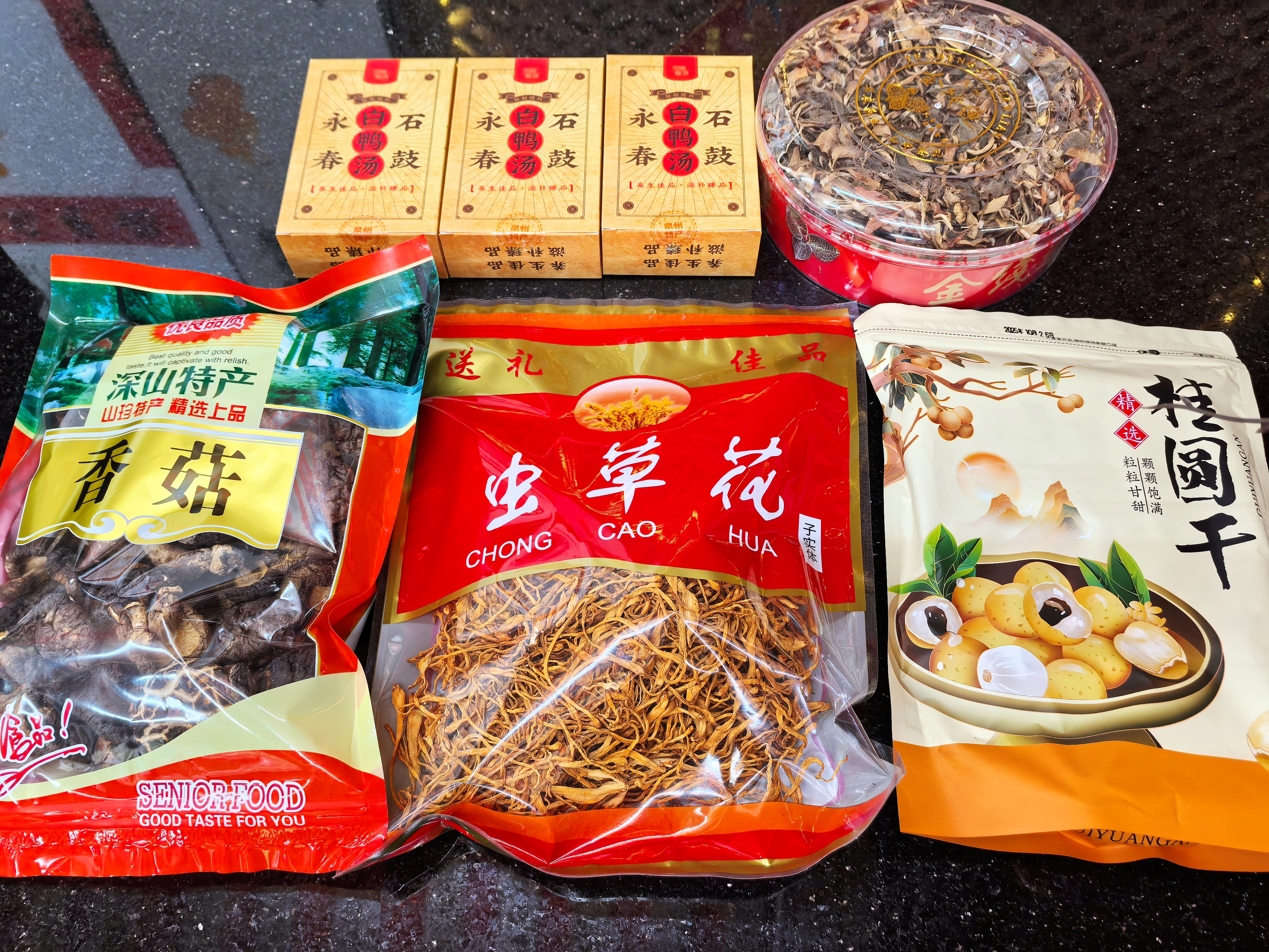 金线莲一盒50克,永春非遗白鸭汤包3份,高山香菇260克,精选虫草花250克,惠安涂岭12A级桂圆干250克。
