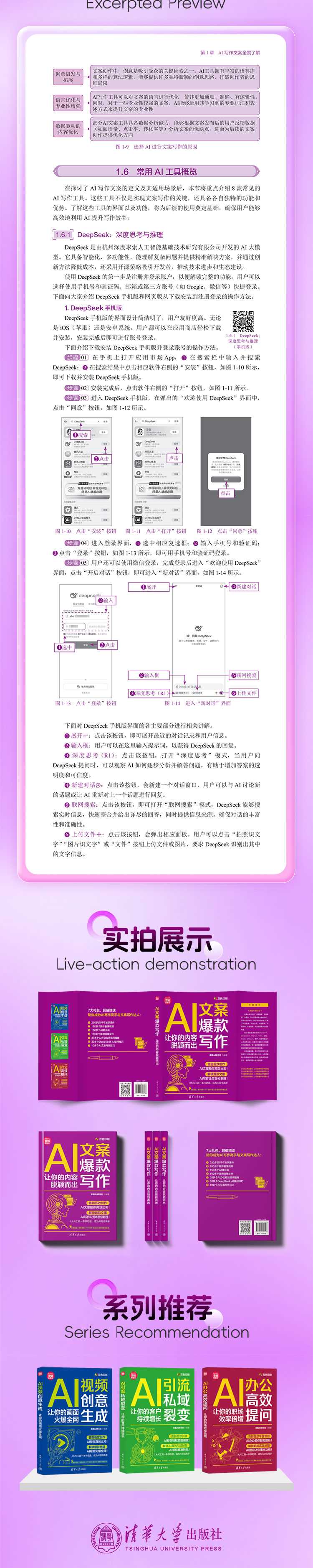 本书深入剖析AI技术在文案创作领域的创新应用,为读者呈现一套系统且实用的AI写作方法。通过学习本书,读者将能够熟练运用各类AI写作工具,深入洞察受众心理,精准定位内容方向,实现内容创作质的飞跃。1.深度解析AI写作工具本书对各类主流AI写作工具进行深度剖析,不仅介绍其功能特点,还通过丰富的实战案例,展示如何根据不同场景和需求选择合适的工具。同时,详细讲解如何运用提示词解构、动态优化、深度演进等方法论,让读者能够精准地向AI提出问题,获取高质量文案,从而在众多创作者中脱颖而出。2.系统构建文案创作知识体系本书从标题设计、需求分析、内容构建等基础技巧入手,逐步深入到文案优化、检查润色等进阶方法。通过实战演练,帮助读者掌握文案创作的逻辑流程和关键要点,提升文案的逻辑性、准确性和吸引力,为读者打造一套完整的文案创作知识体系,使文案创作不再只是灵感的偶然闪现,而是有章可循的专业技能。3.多领域实战案例全覆盖本书涵盖电商、新媒体、短视频、直播、广告、公文、小说等众多领域的文案创作实战案例。每个案例都详细展示了如何运用AI工具进行文案创作,包括从需求分析到文案生成、优化的全过程。读者可以通过这些案例,学习不同领域的文案创作技巧和规范,快速适应各种创作场景,满足不同行业和领域的文案需求。4.特色化文案优化策略本书不仅注重文案的创作过程,还特别强调文案的检查、修改与润色。通过独特的文案优化技巧,如添加过渡语、修饰语,更换案例,切换视角等,帮助读者对生成的文案进行精细化打磨,实现从“可用文案”到“精品文案”的华丽转变。