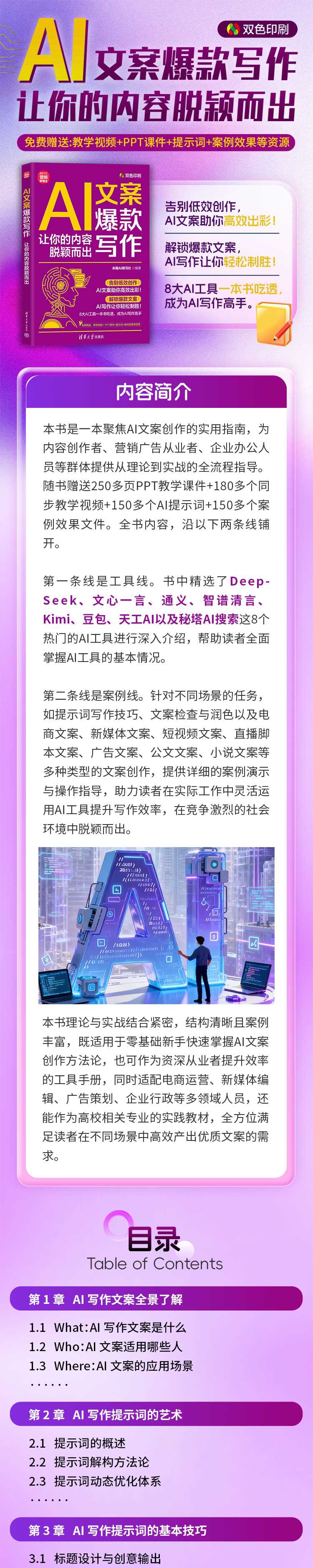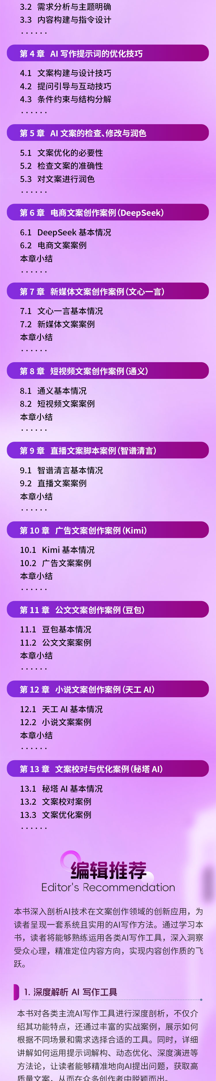 本书不仅注重文案的创作过程,还特别强调文案的检查、修改与润色。通过独特的文案优化技巧,如添加过渡语、修饰语,更换案例,切换视角等,帮助读者对生成的文案进行精细化打磨,实现从“可用文案”到“精品文案”的华丽转变。