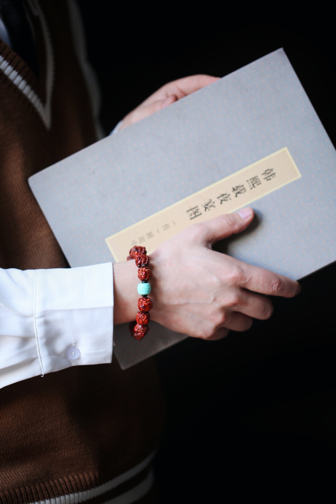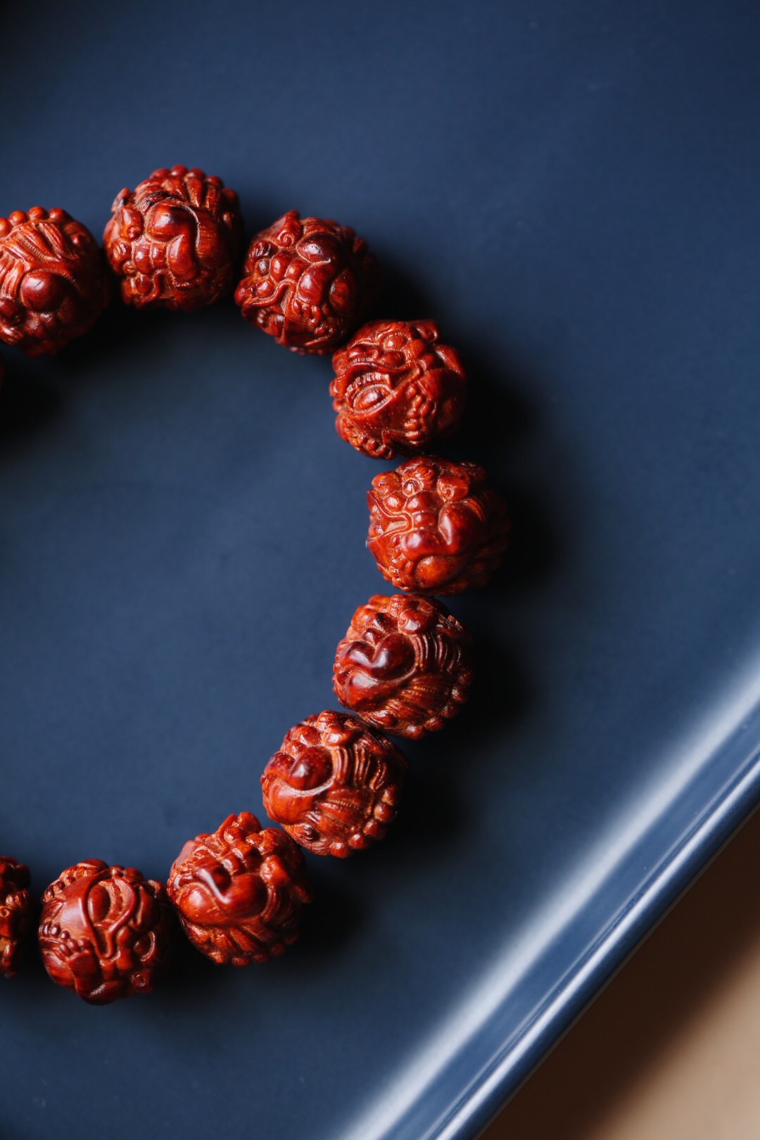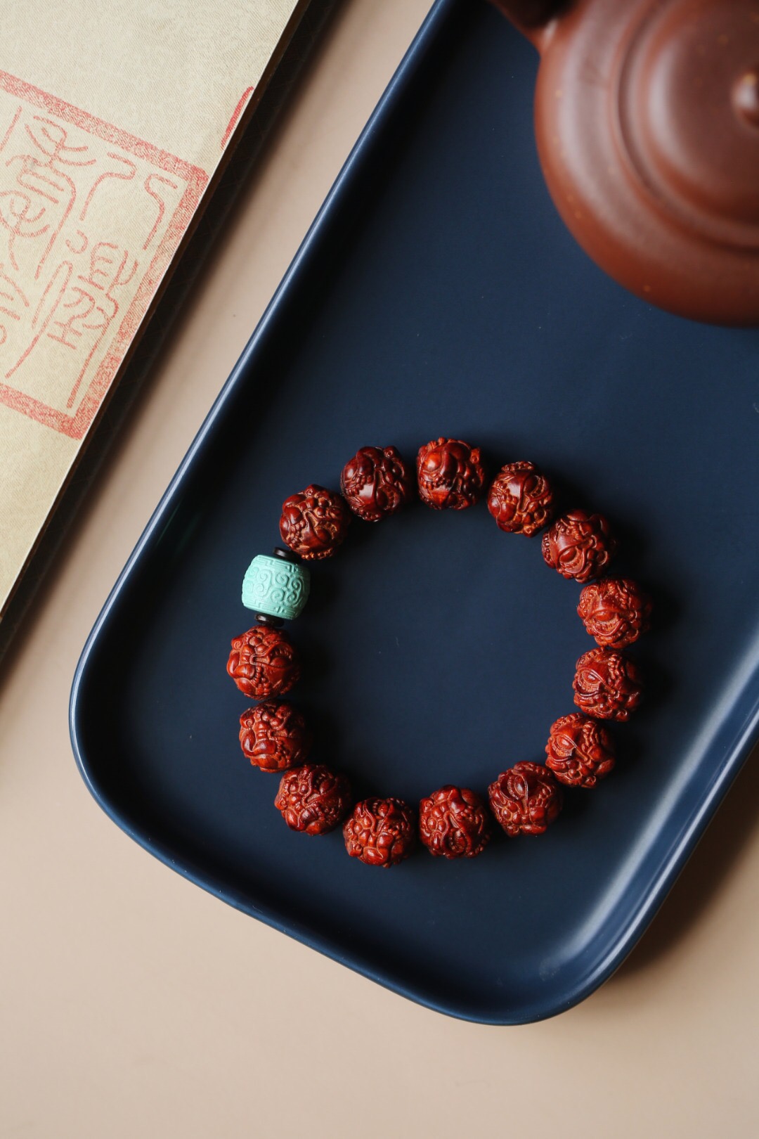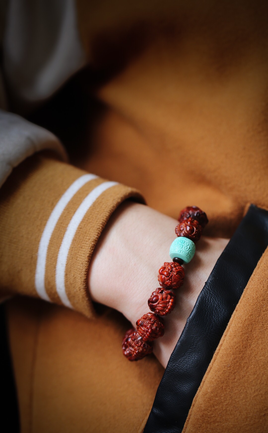 这款手串的颜值高,做工好,品质好,很有个性。优质的紫檀料,颜色红润,料质细腻,油性足,莹润感强。雕刻的貔貅非常可爱,抱着金元宝,寓意吉祥,搭配松石清新淡雅,非常耐看。简约大气,体现了一种自然的美感。价格划算,值得入手!