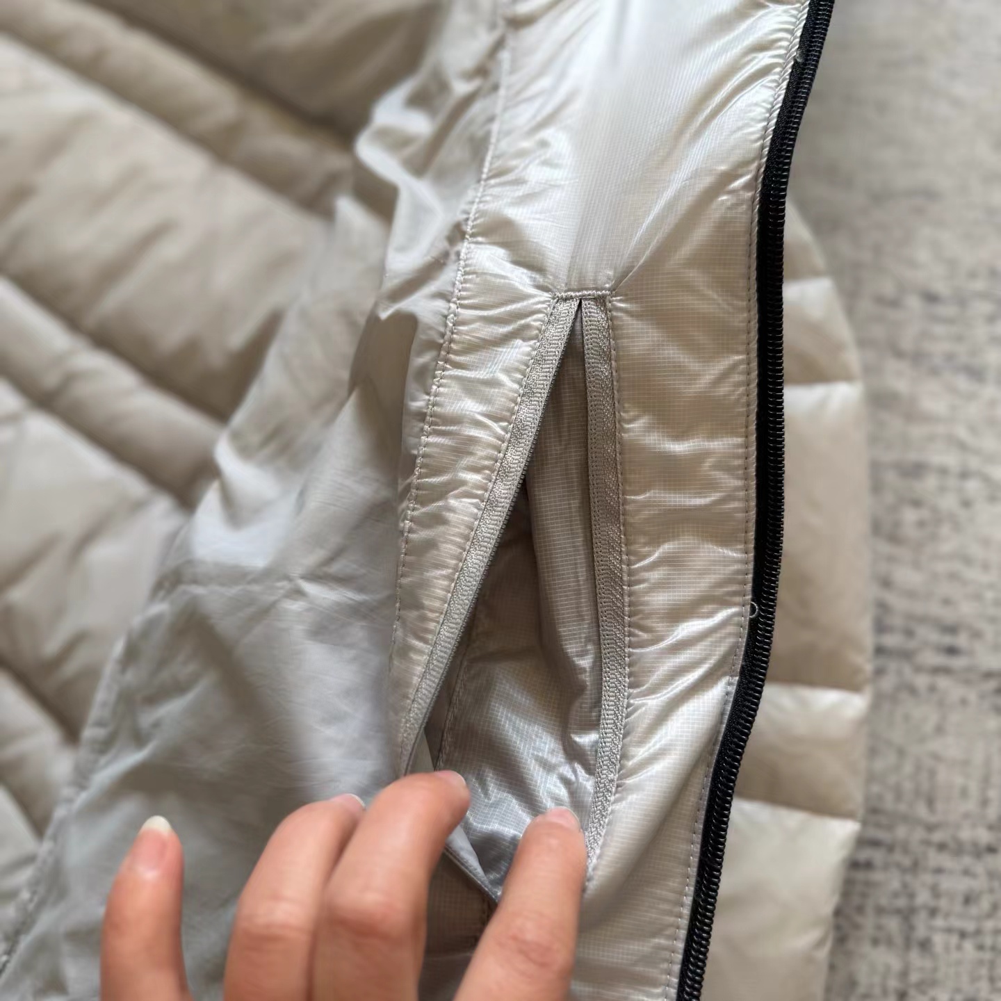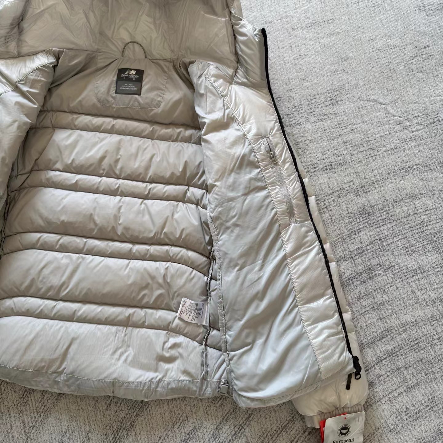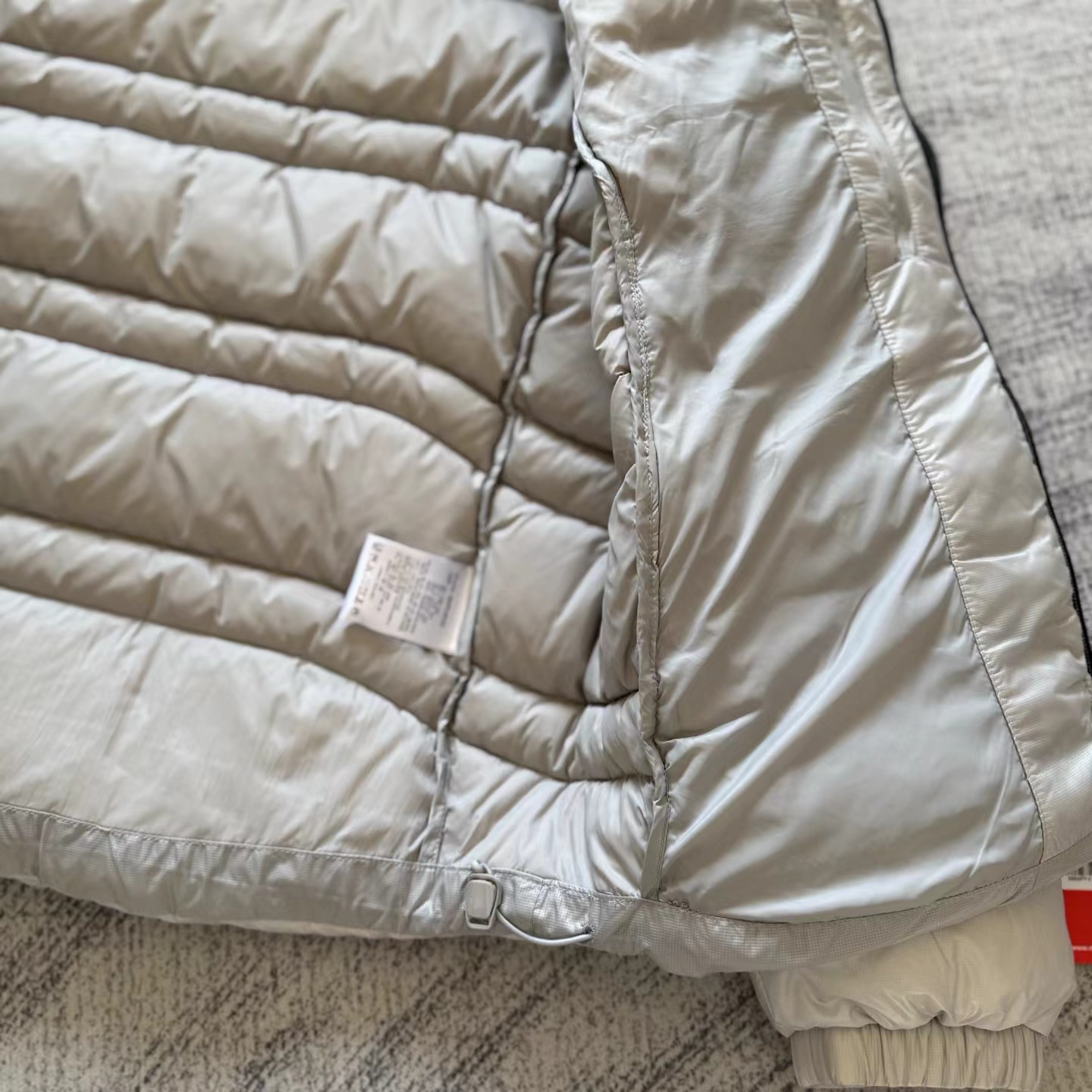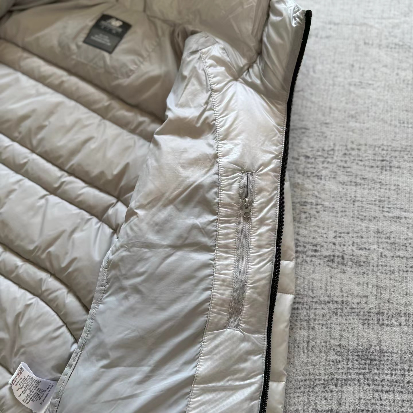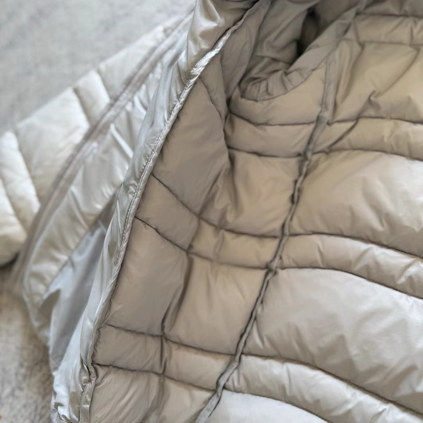 金冬天/郑秀晶同款 男女同款轻薄款连帽羽绒服填充纯白鹅绒,面料定制定染7D细格纹,银青灰金属光泽面料。软乎轻薄 独特不规则纹路排骨版珩线,特别有辨识度。前后反光磨砂银灰色印花,帽子+下摆有松紧抽绳,帽子不可拆卸。双层胆布,经久耐穿绝不跑绒漏绒。