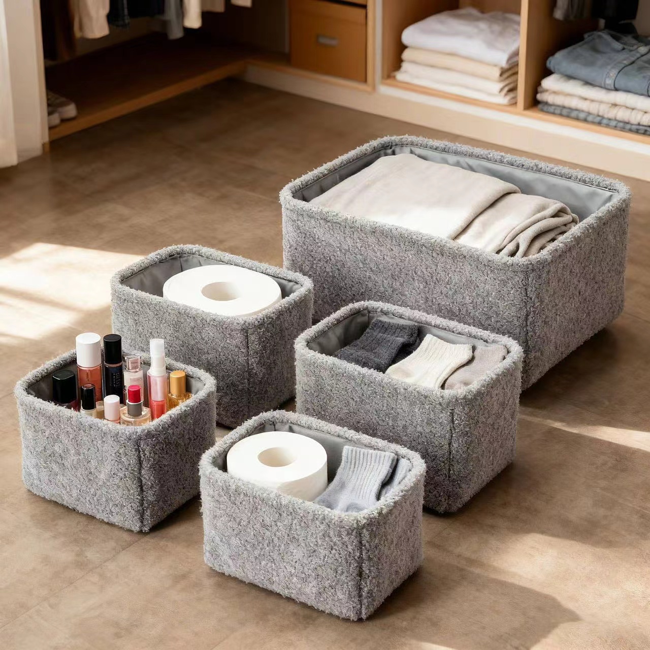 收纳四件套!一套4个颜色随机发!泰迪绒收纳四件套!软乎乎的质感+羔级色系,让乱糟糟的生活瞬间变治愈,4件套组合适配全家收纳需求~家里的小物件总是散落各处,抽屉里乱成一团?这款收纳四件套正是您的收纳救星!采用柔软泰迪绒面料,触感温暖亲肤,搭配EVA支撑结构不易变形。一套包含三个小号与一个大号收纳篮,轻松分类收纳化妆品、文具或生活小物。让杂乱无处遁形,立刻拥有治愈系收纳体验!