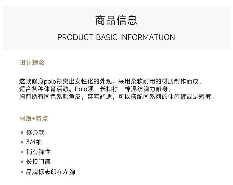 瑕疵Lacoste 女士夏季款修身纯色五分袖隐藏扣POLO衫PF6969