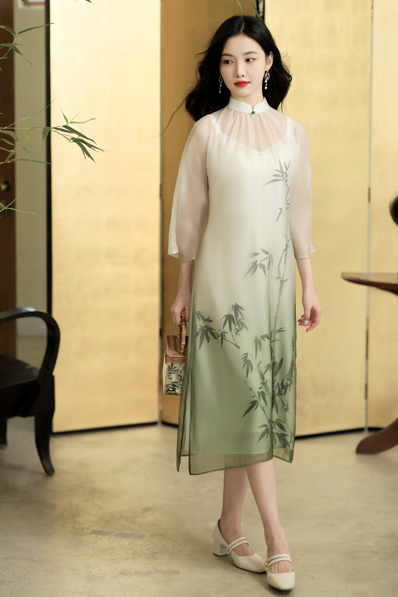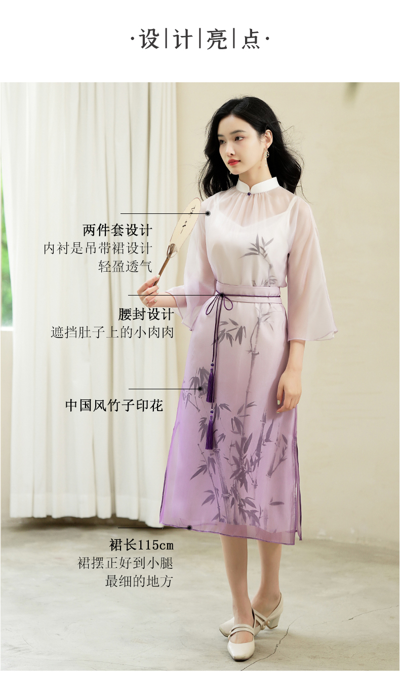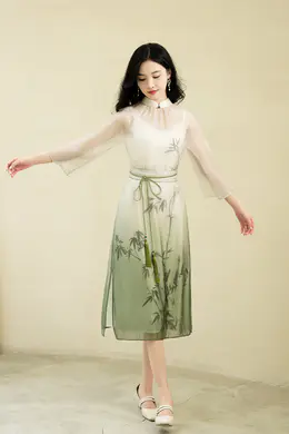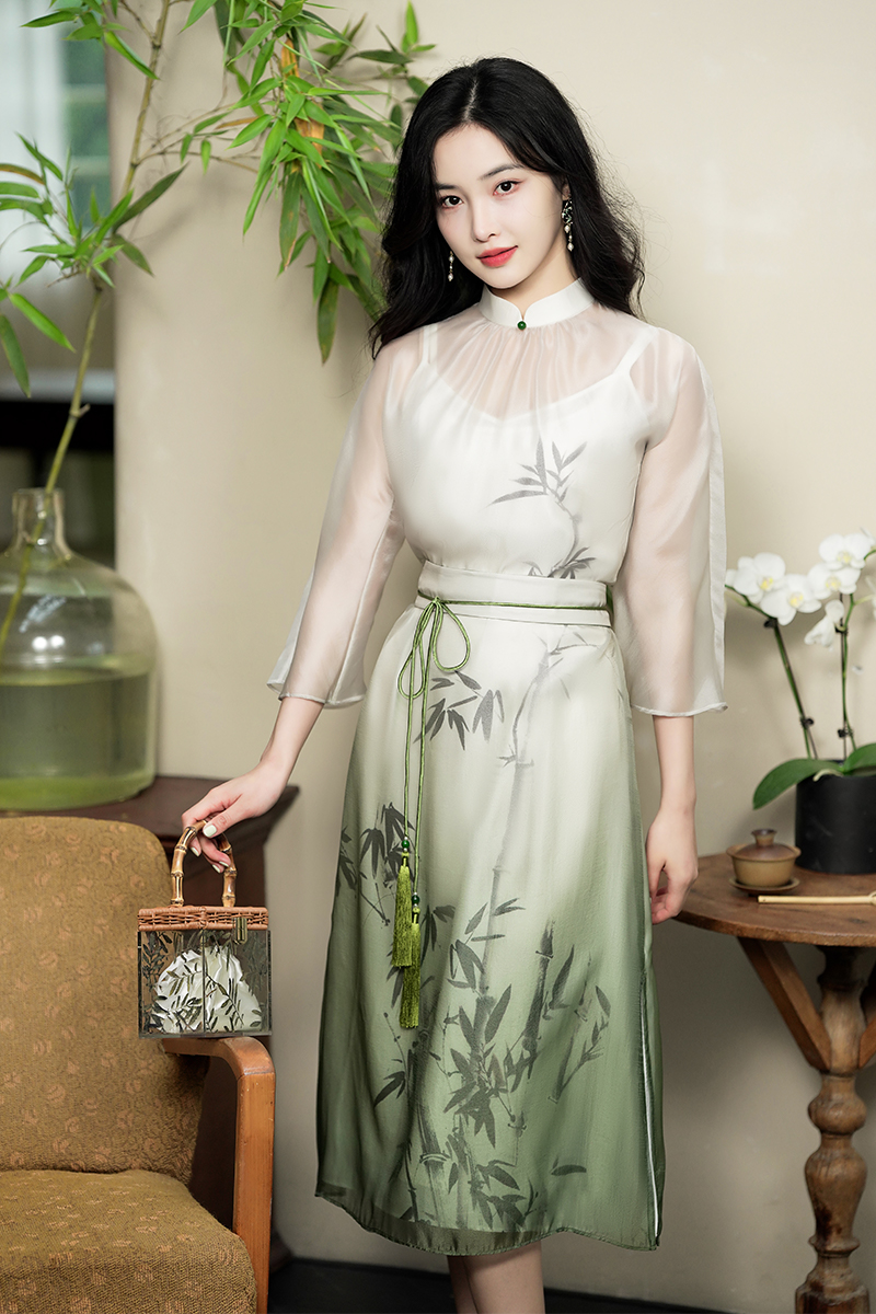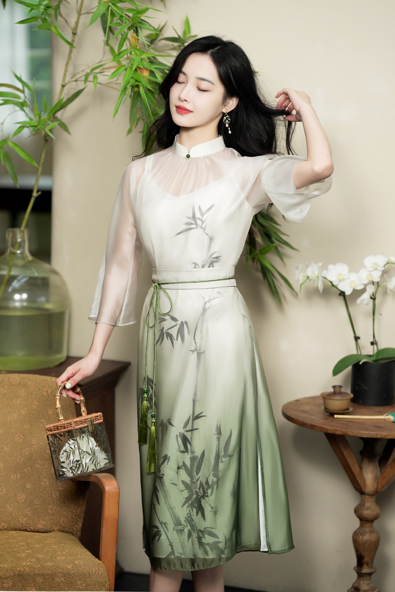 渐变色“绿竹”雪纺丁香皱新中式国风立领连衣裙两件套,自带仙气唯美的氛围感!