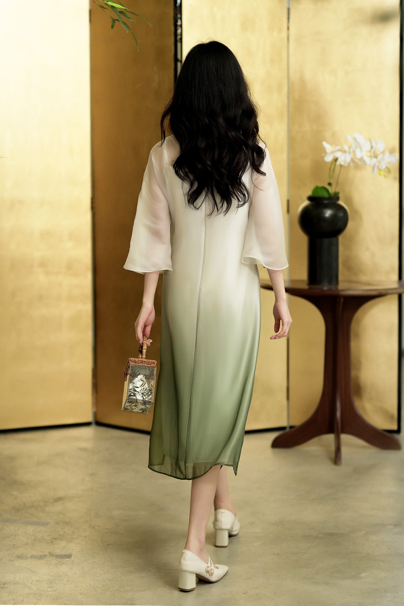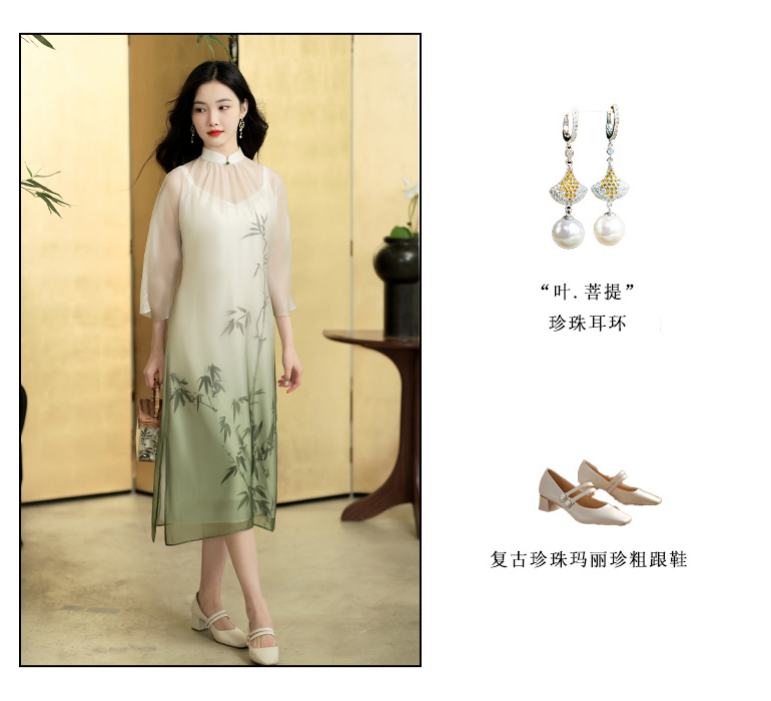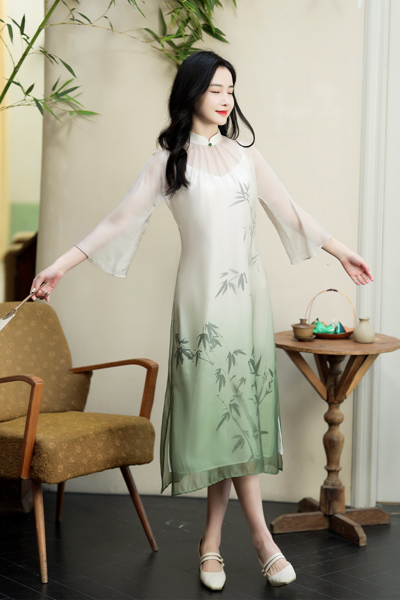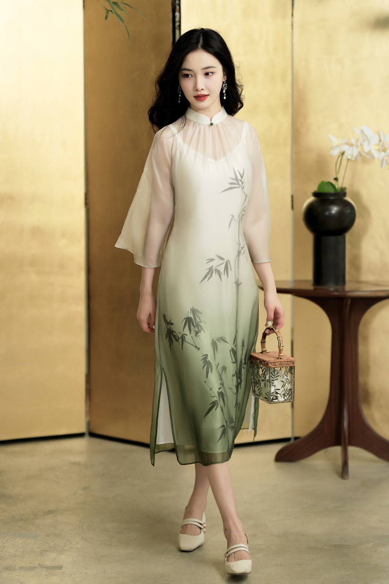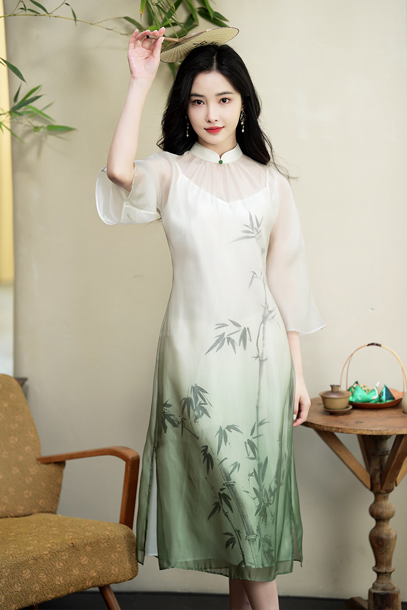 渐变色“绿竹”雪纺丁香皱新中式国风立领连衣裙两件套,自带仙气唯美的氛围感!