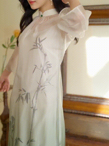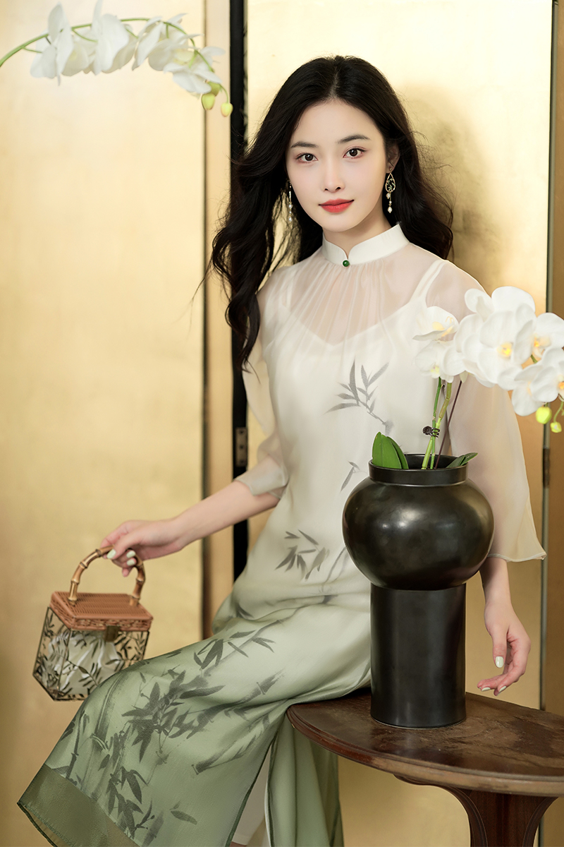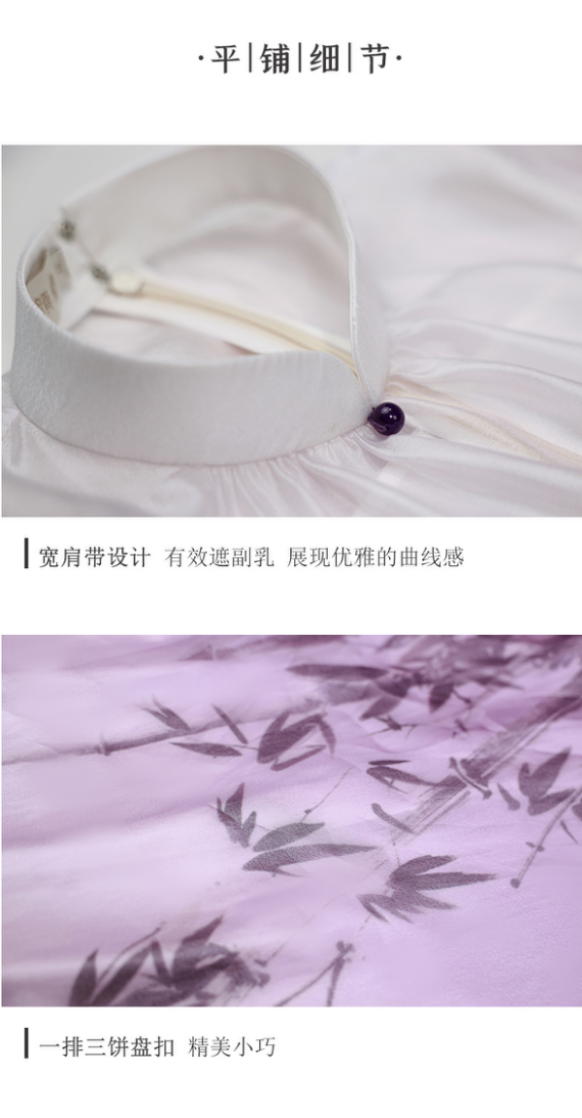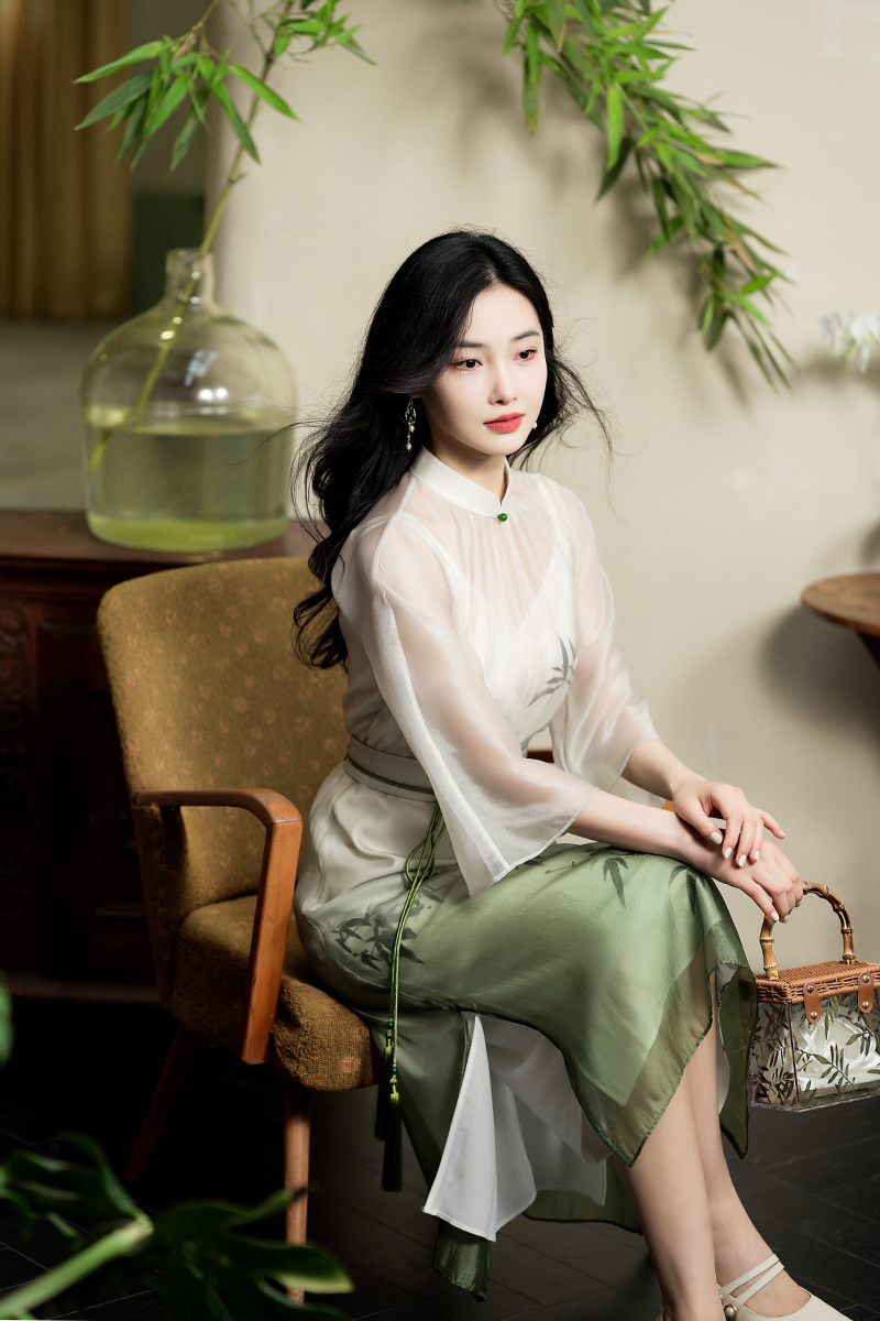 选用丁香皱来展现竹林幻影,林间朦胧雾感,渐变的绿色似仙境般飘渺清幽。里布为定位印花竹子雪纺,舒适透气,亲肤凉爽。整体上身雅致仙气,宛如林中仙子。