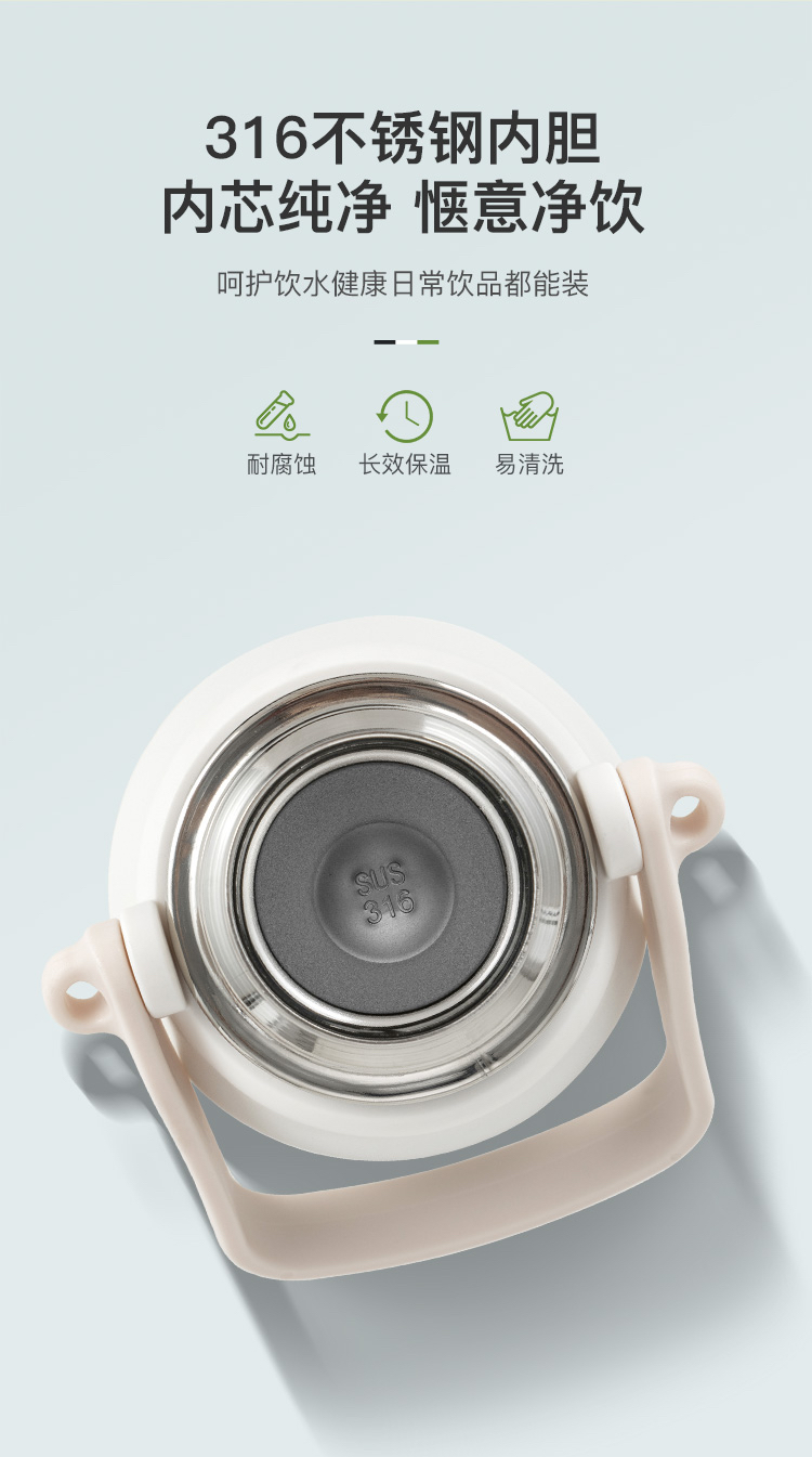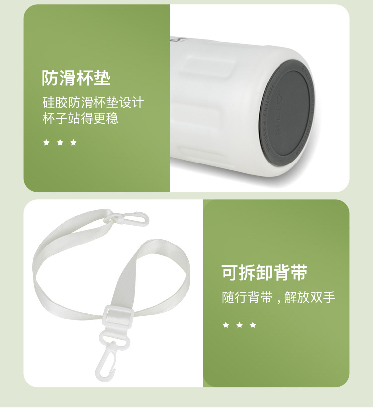 绿色、黑色、白色三色,送可拆卸背带,就是有品牌logo,我个人不是很喜欢,大家可以自己去买喜欢的款式来搭配,但手提的相当可以,还有一定弧度,握起来很是舒适!整个杯身是磨砂漆面,满满高级感,出门旅行游玩时随身携带,不光消除路上干渴,背在身上更是一件时髦单品,密封性也帮大家测过啦,装水后倒置保温杯,都不会漏水,安心!