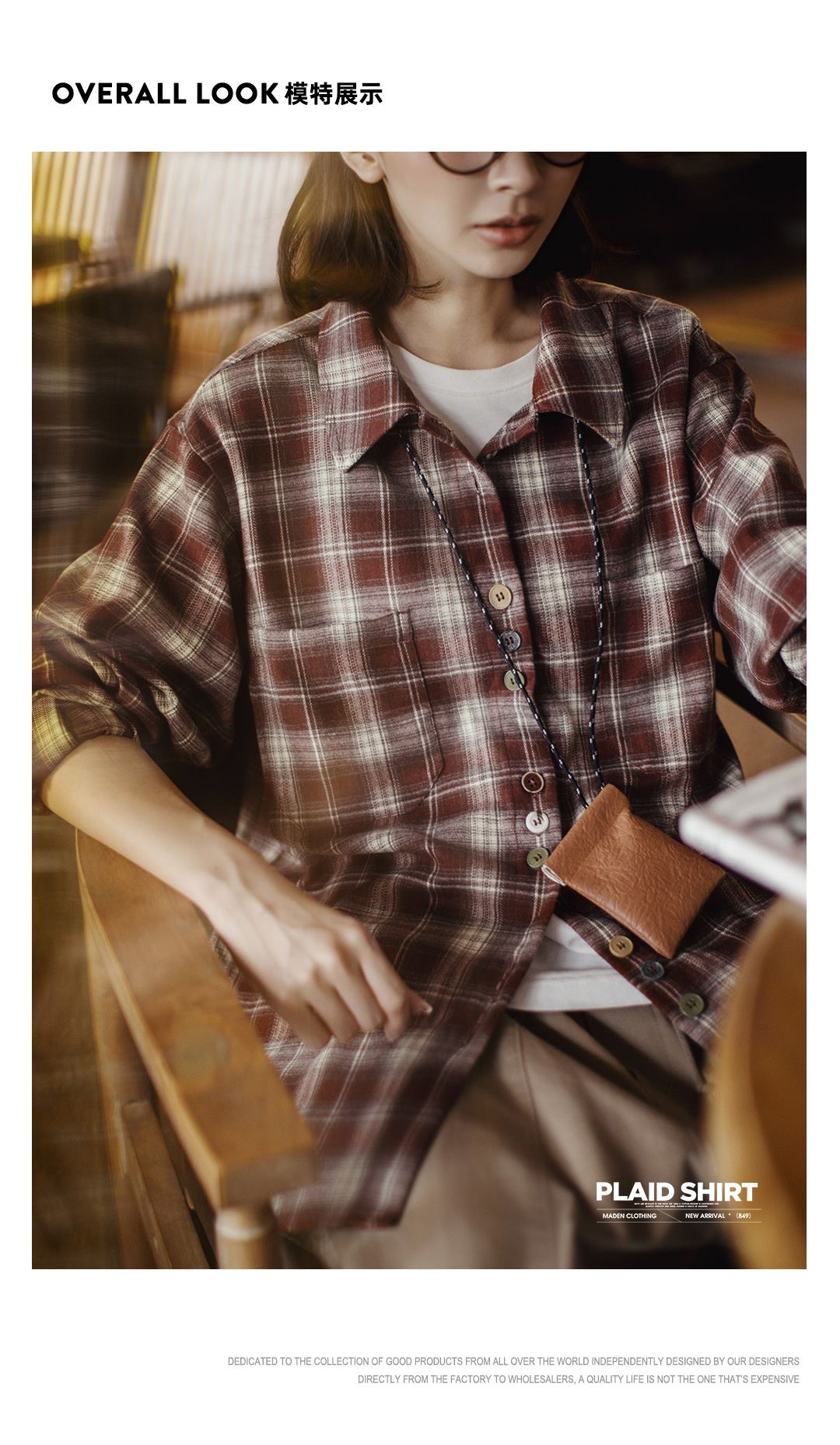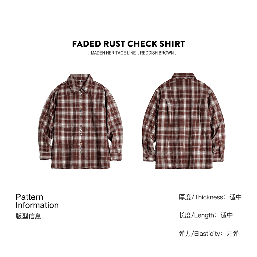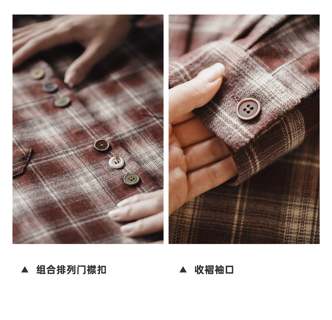 马登美拉德棕咖色系磨毛格子纹长袖衬衫宽松衬衣外套上衣女士秋季