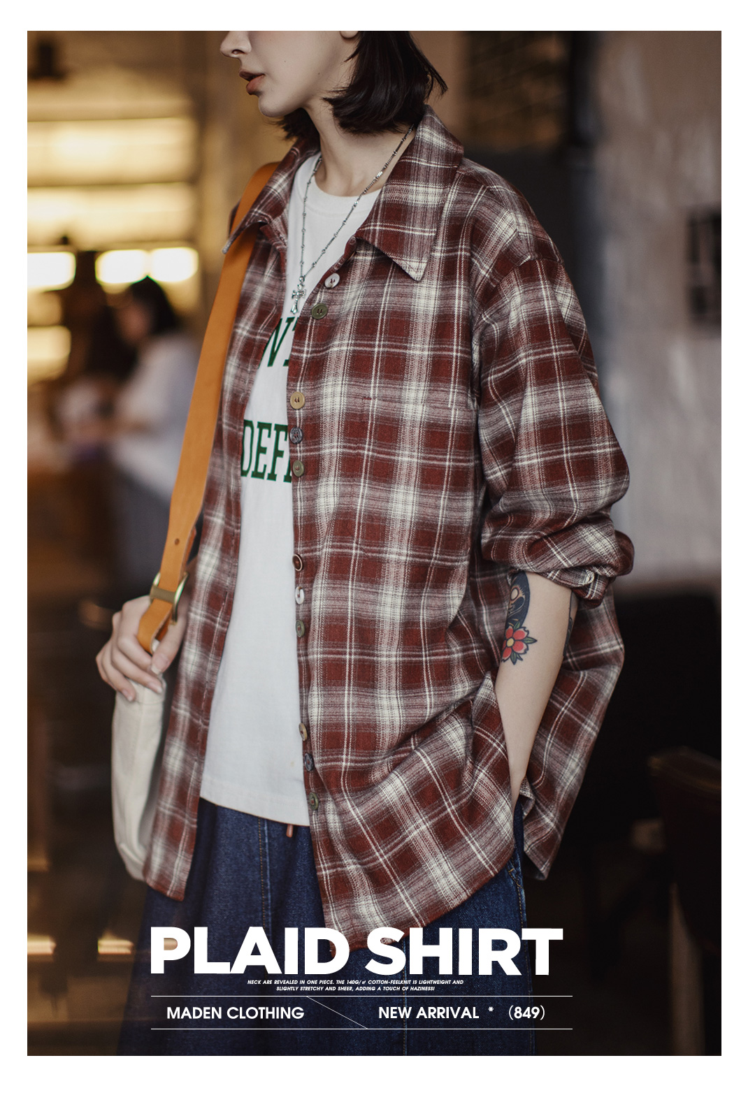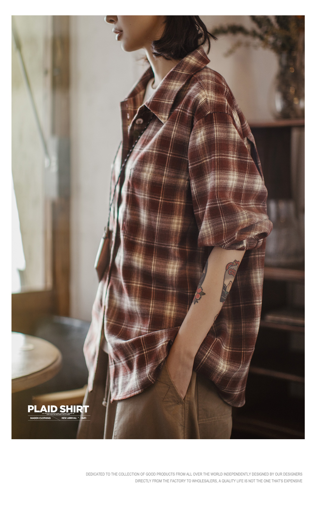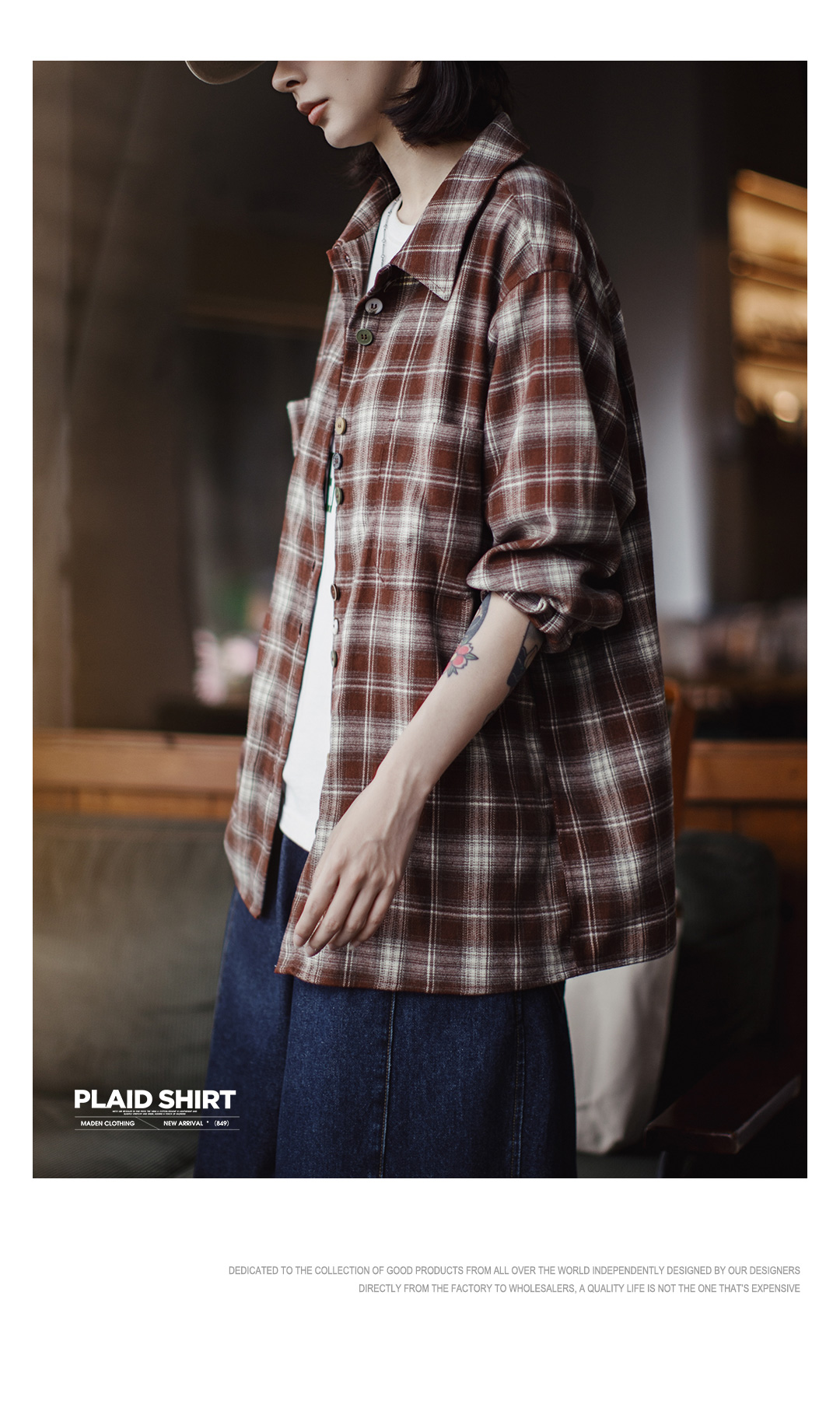 马登美拉德棕咖色系磨毛格子纹长袖衬衫宽松衬衣外套上衣女士秋季