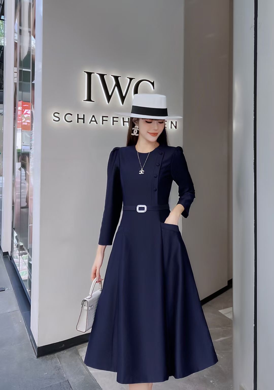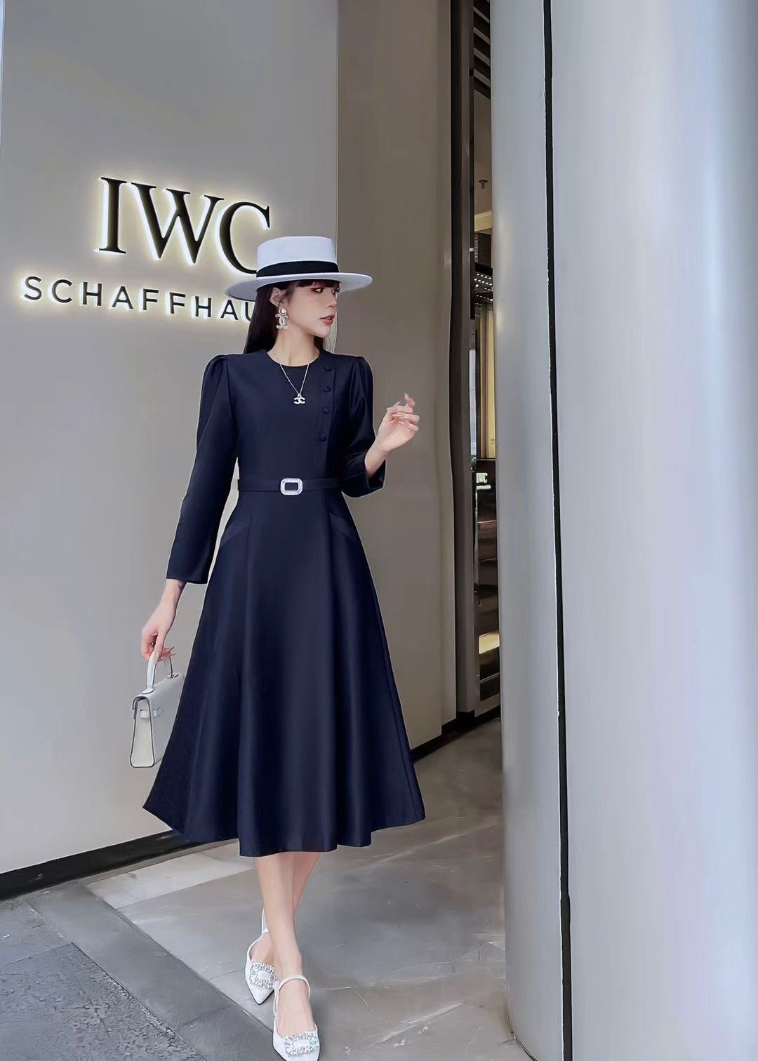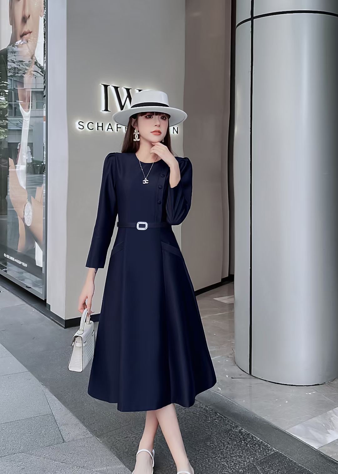 伯妮斯茵 | 复古优雅 藏青色A 字摆礼服裙 立体剪裁 侧襟纽扣装饰 气质通勤款 SZ3S58-帝释青连衣裙