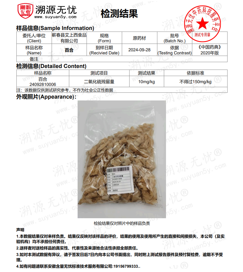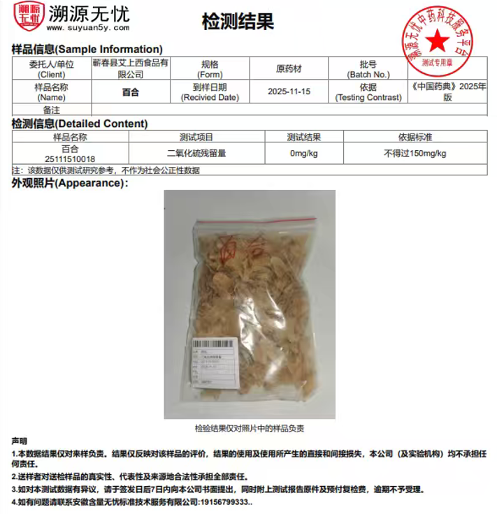 我们的百合,按照国家药典标准检测:二氧化硫残留物含量为:10毫克/公斤。国家标准为,每公斤不得超过150毫克。