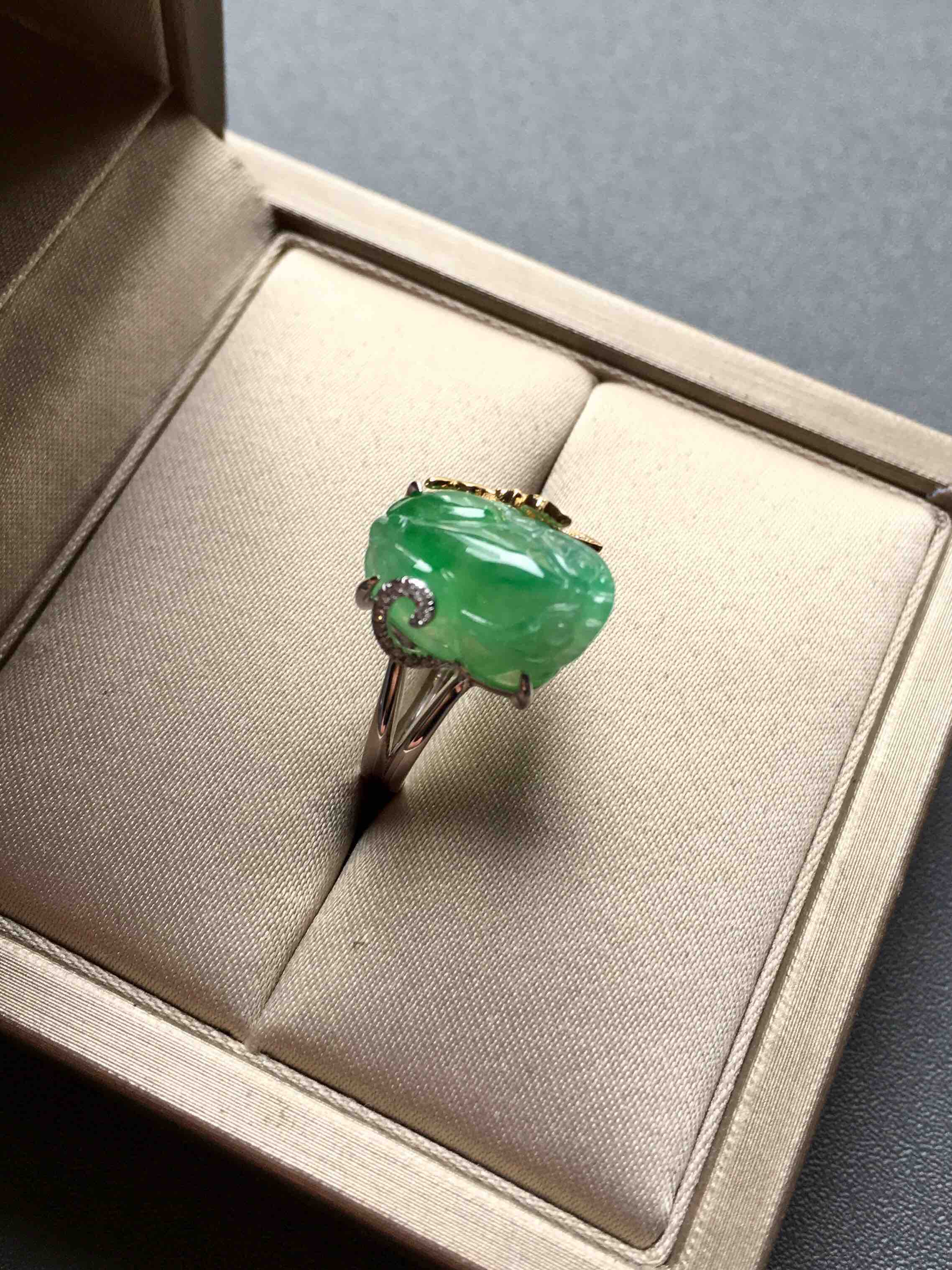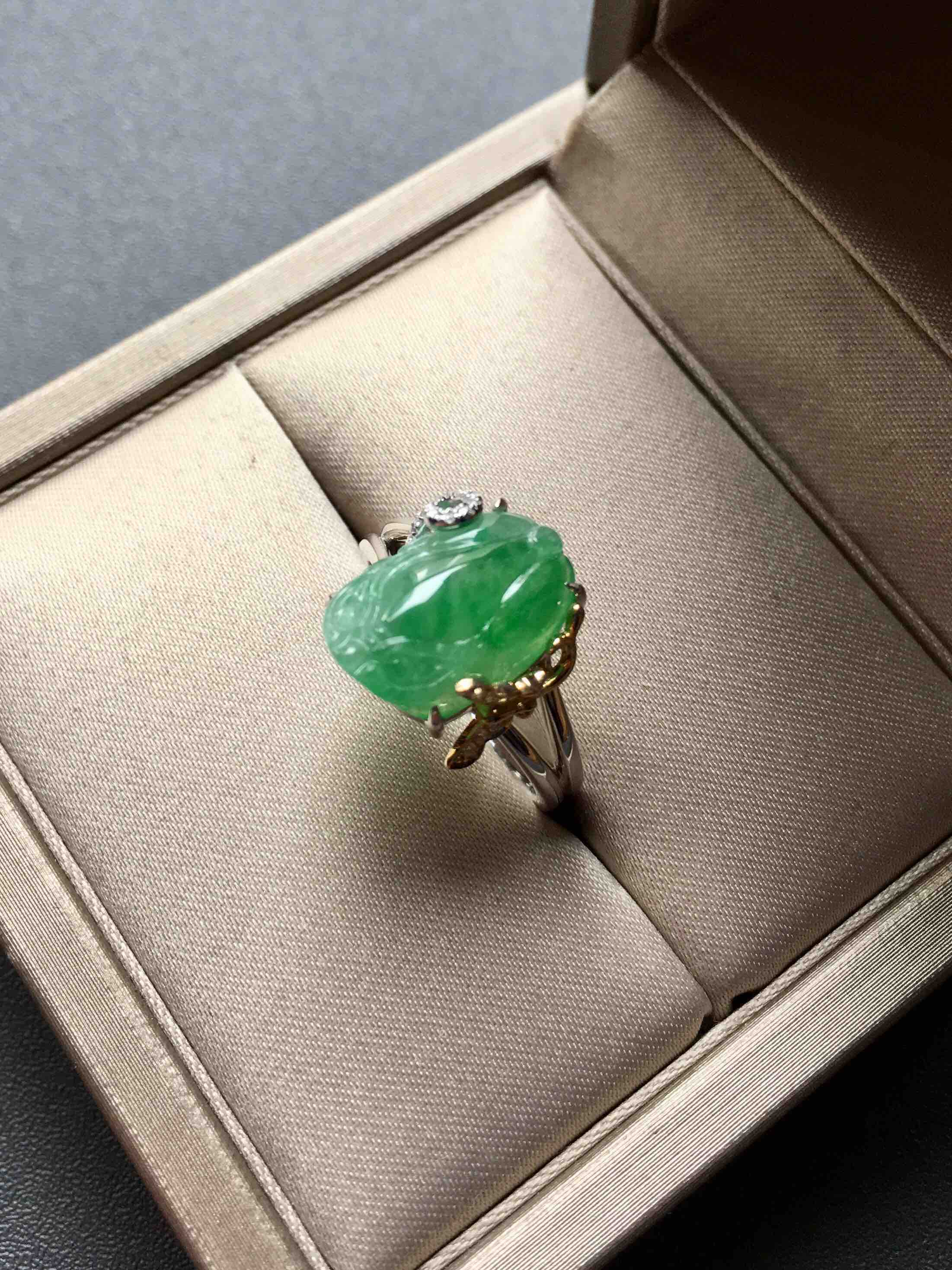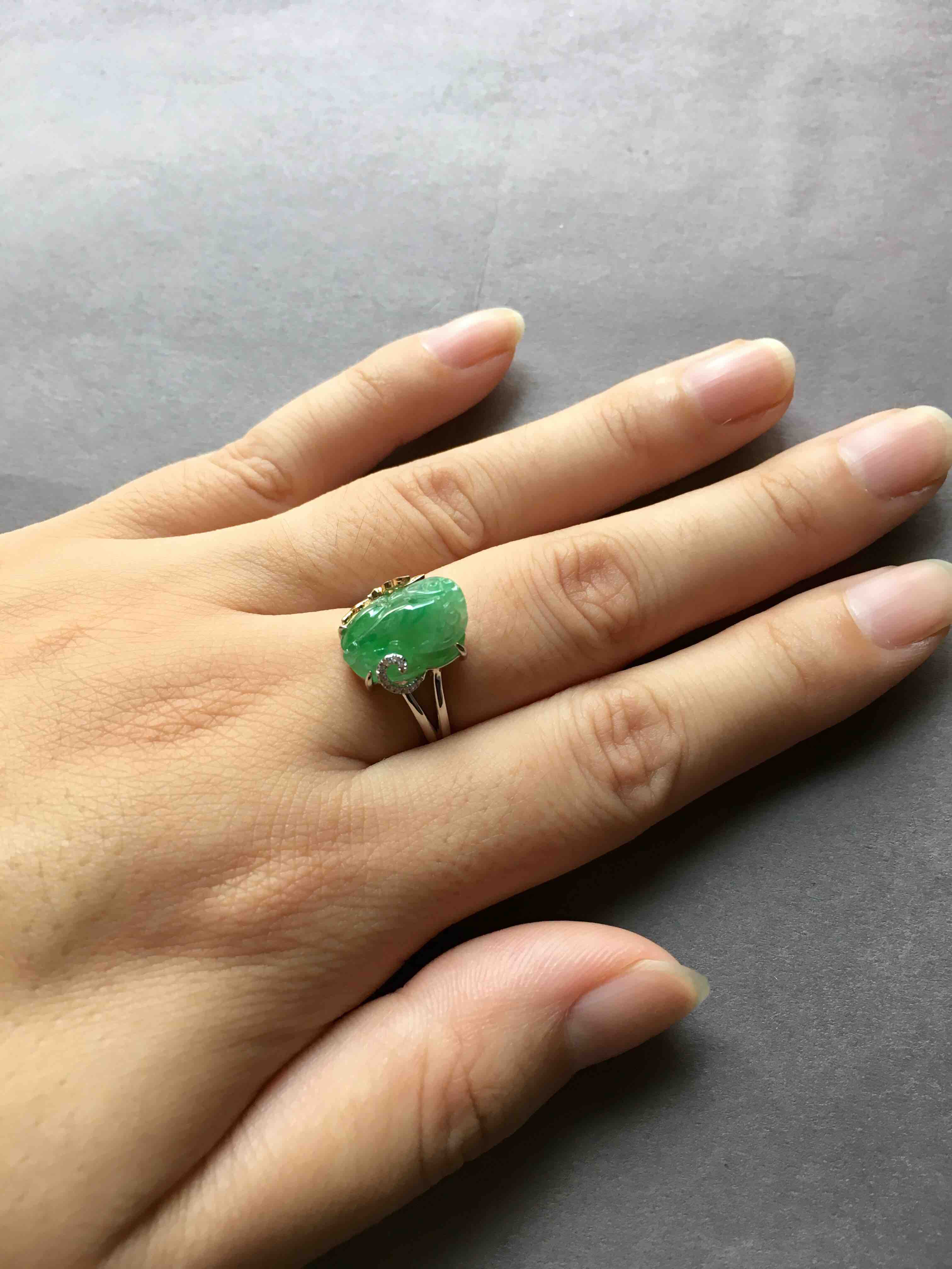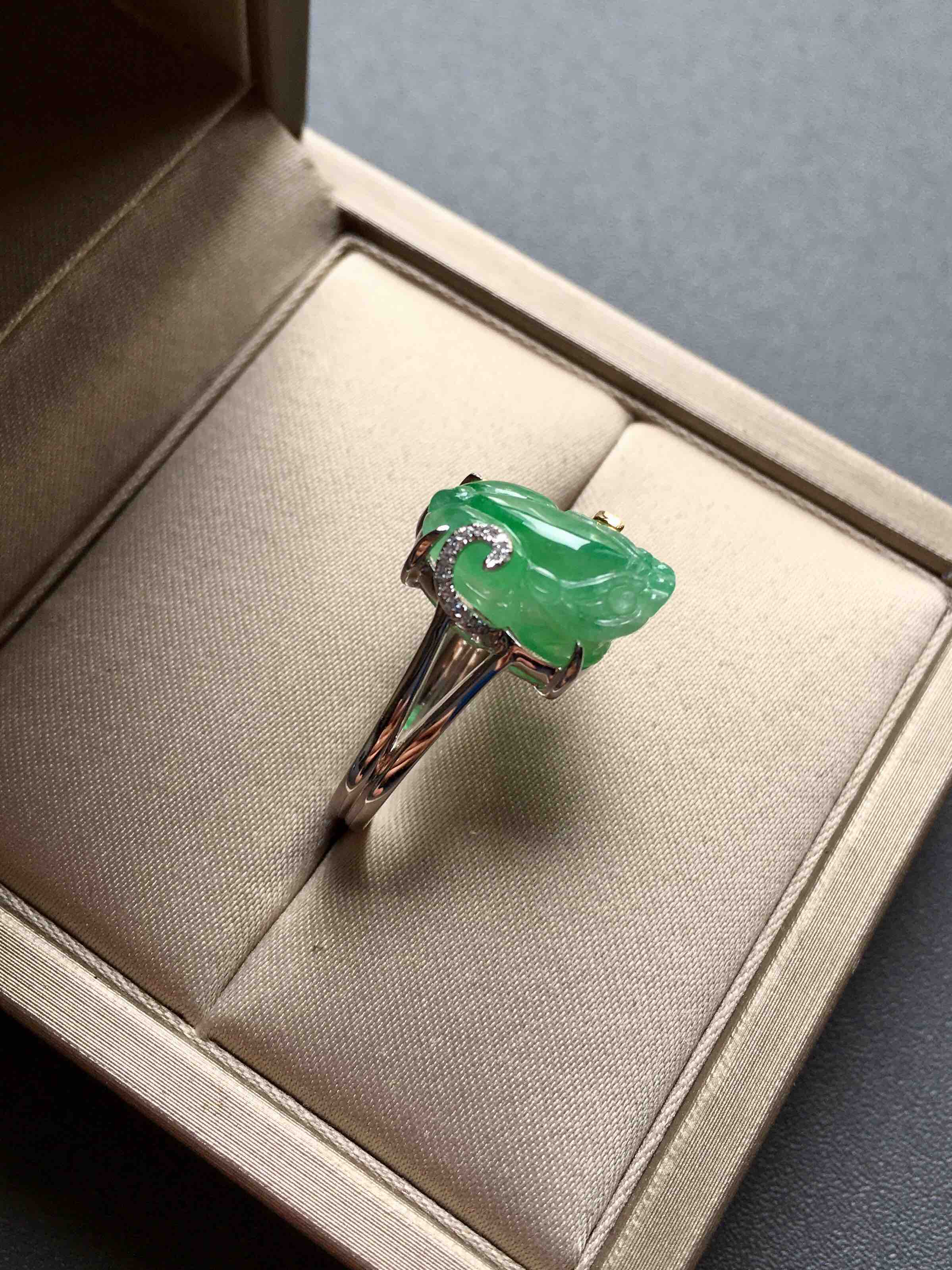 种色俱佳的冰种阳绿翡翠貔貅戒指,貔貅13.7×9.8×5.2mm,种水晶莹剔透,荧光四射,正阳绿艳丽,貔貅尺寸大气饱满,雕工精致,翡翠禄来原创设计,18k白金黄金钻石镶嵌,款式非常特别,侧面看是一个蝴蝶,福迭,圈号13,可改大小