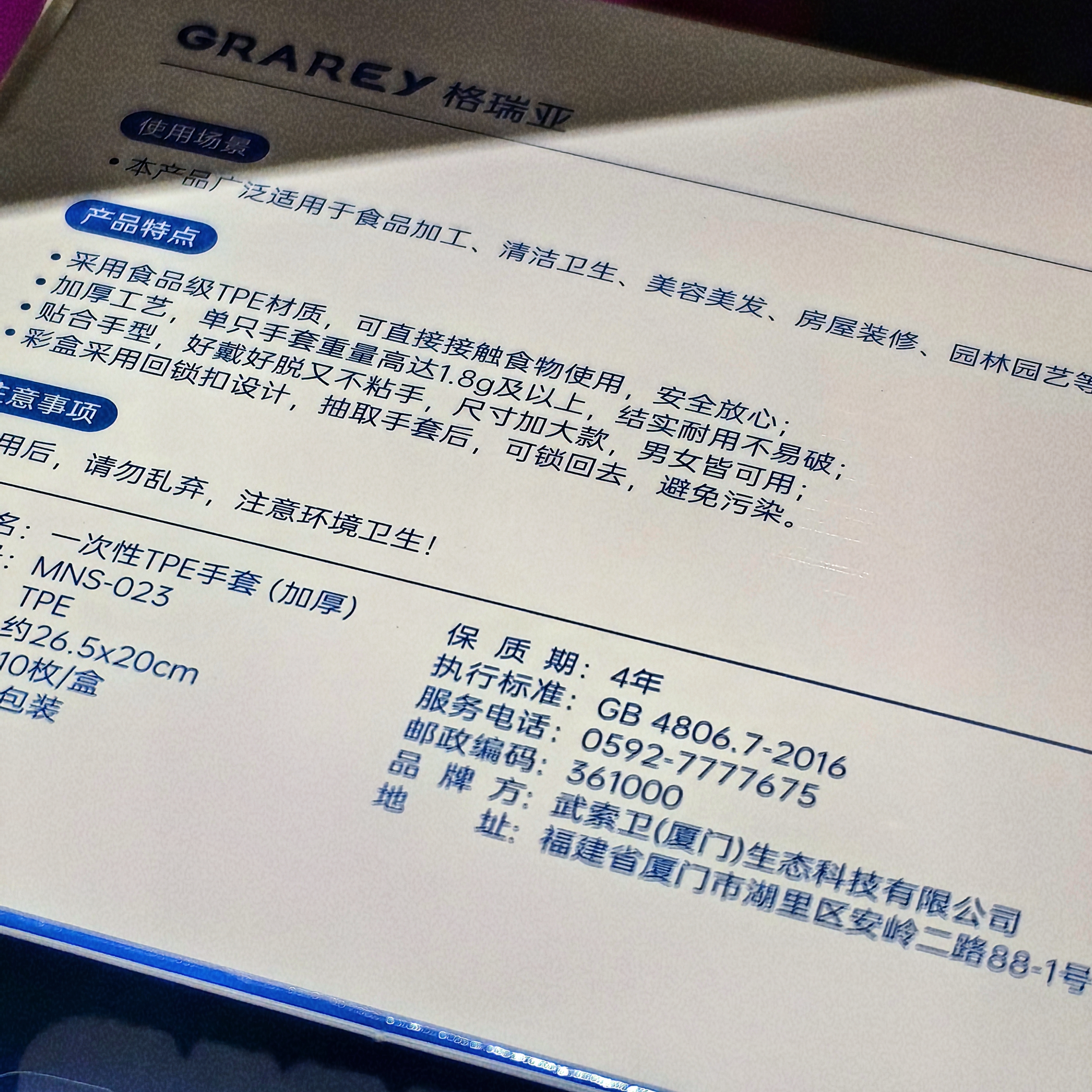 GRAREY的手套是加厚的哦,用的是食品级TPE材质,可以直接接触食物,安全放心,洗菜、洗水果的时候戴着它,不会把手沾湿,防水不透,特别处理像山药、芋头这种容易让人手痒的食材,一定要戴!手套做工细致,平整不皱又不粘,比同类型整整厚了0.4g,结实更耐用!还采用防粘设计,贴身手型,无论是揉面、擀面还是抓取食材,都很轻松方便。防水防油防渗透,不易扯破漏油,戴上来吃小龙虾大闸蟹,妈妈再也不用担心我伤手啦!而且手套韧性很好,不惧酸碱,厨房油污、卫生间马桶、滴漏等容易藏污纳垢的地方,都可以直接上手搞定!