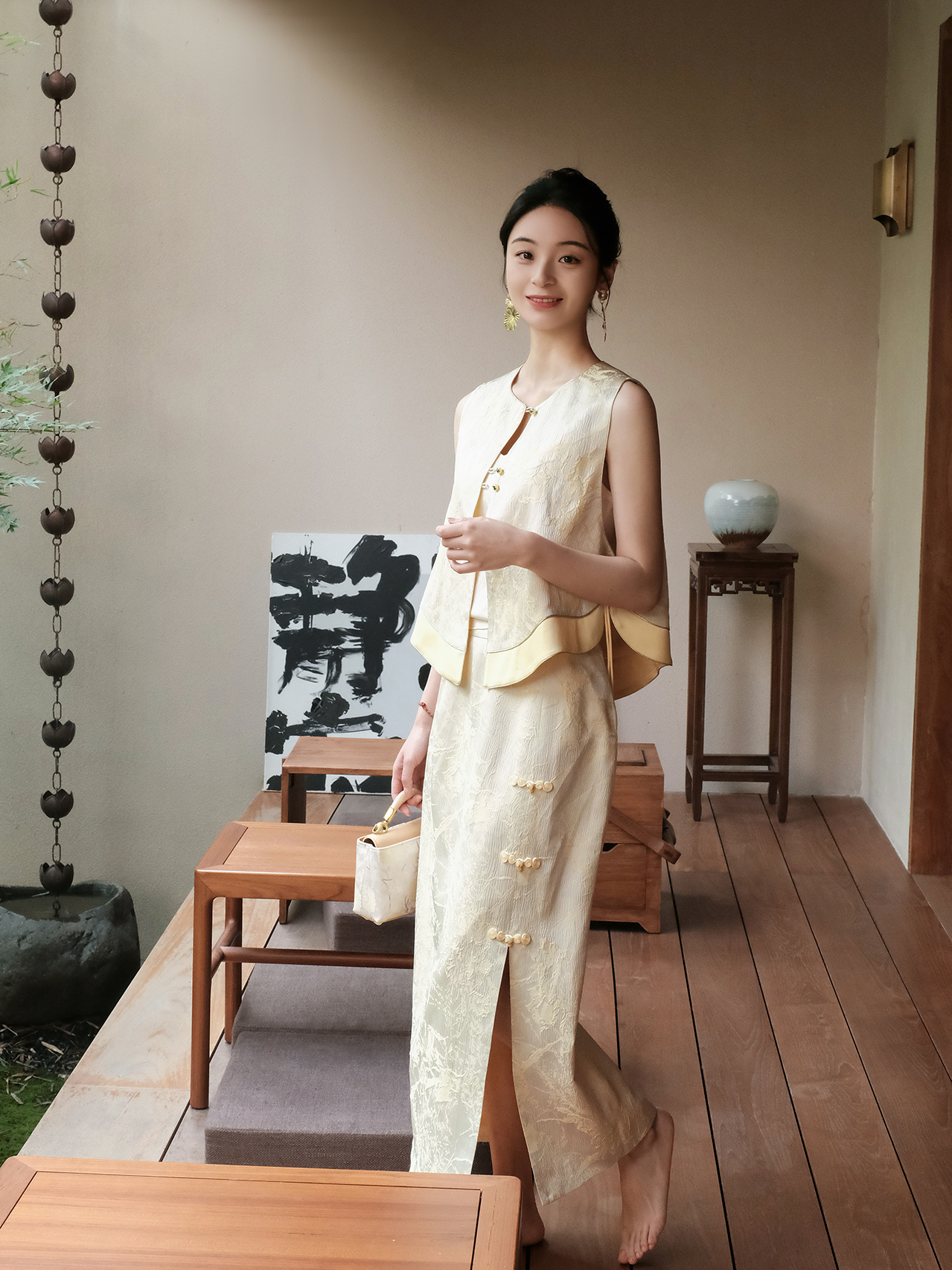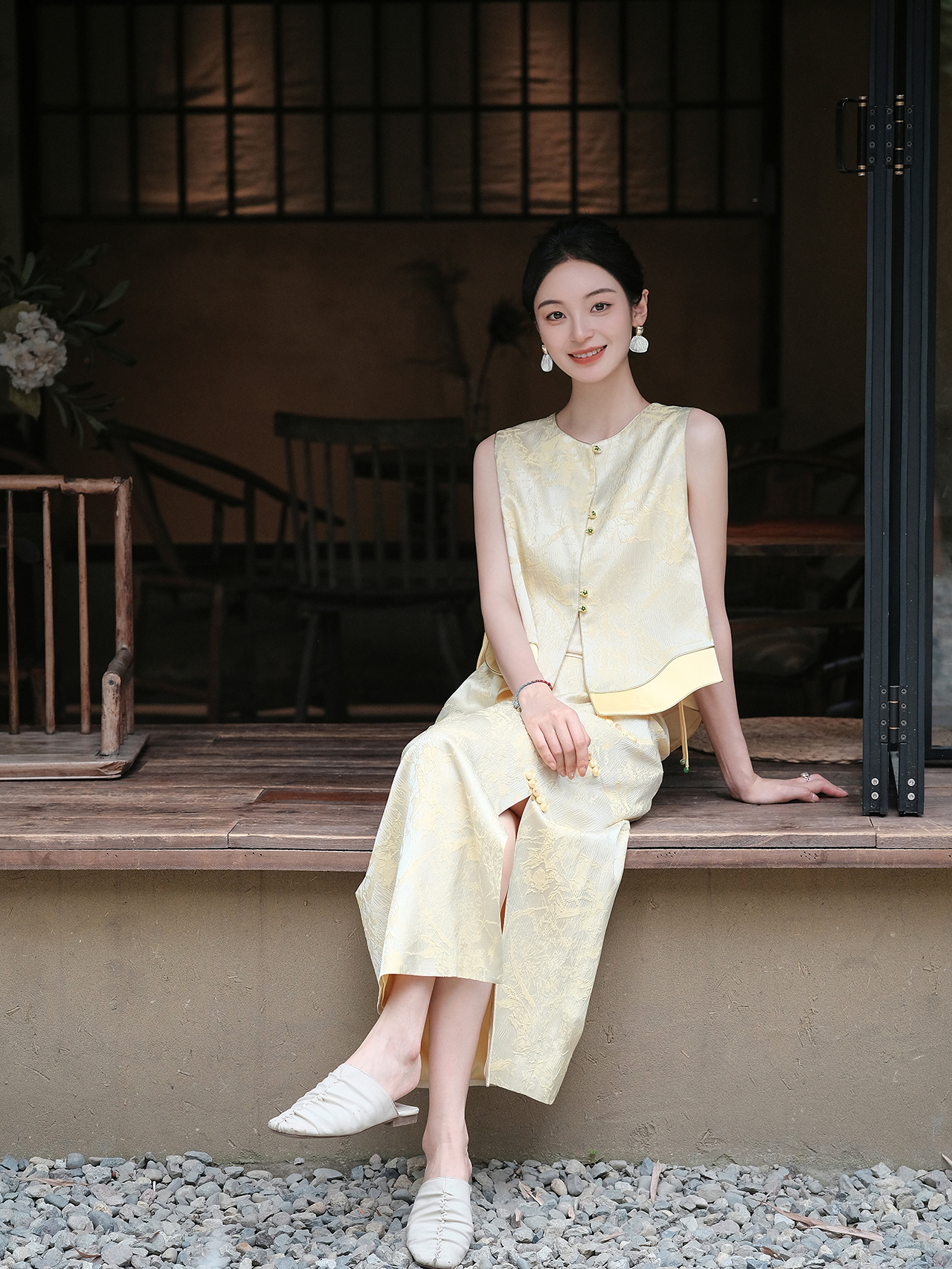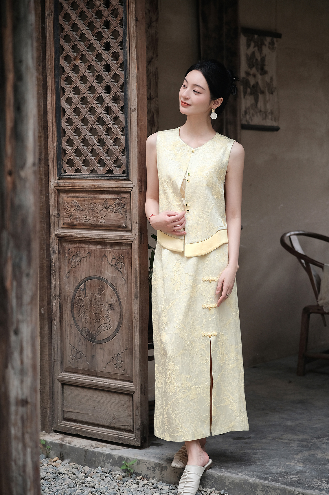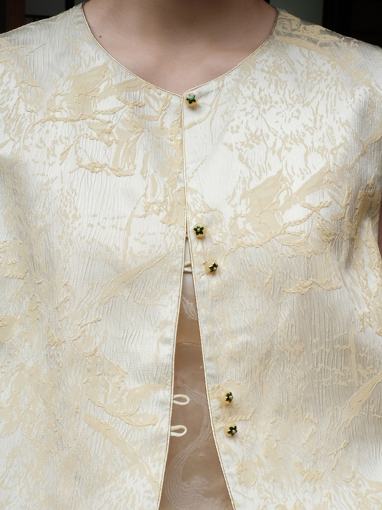 盛唐婧| 新中式真丝双色冠乐皱对襟马甲-黄色