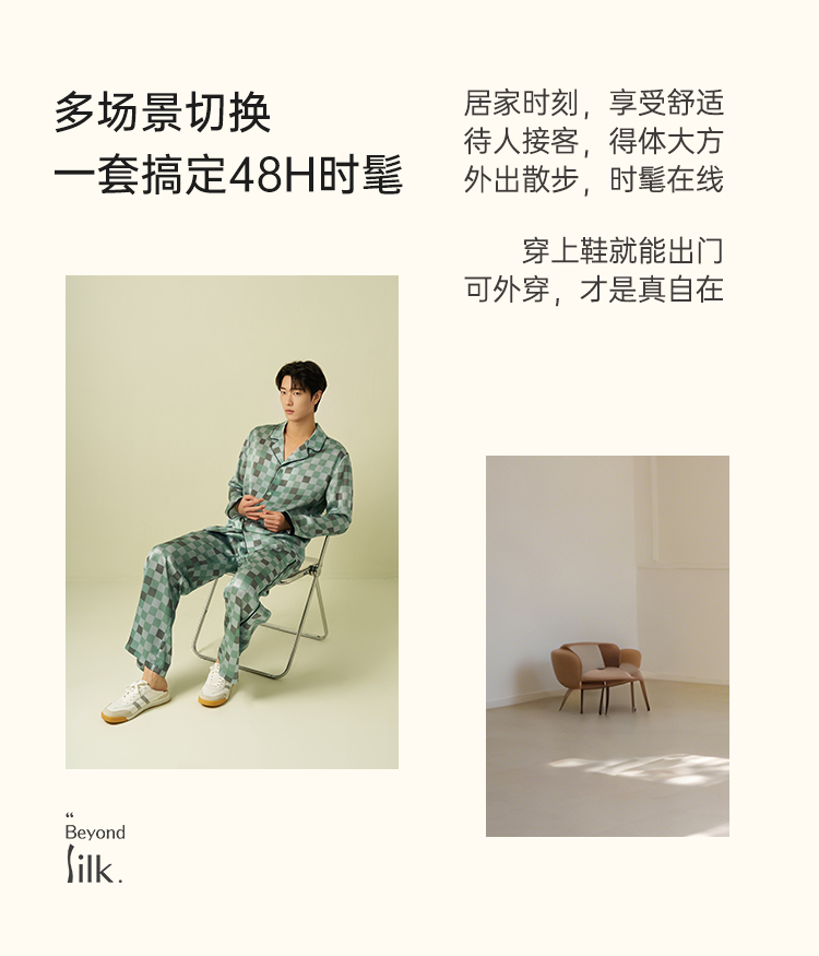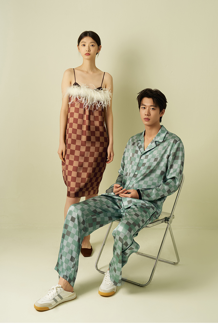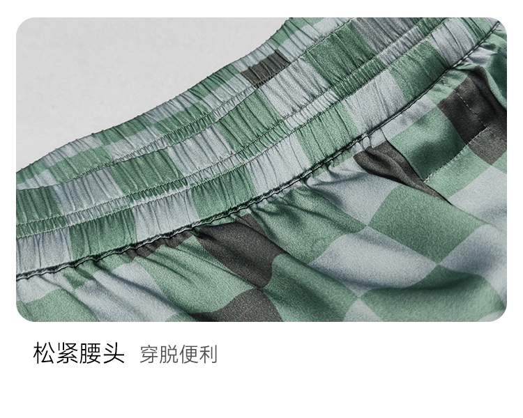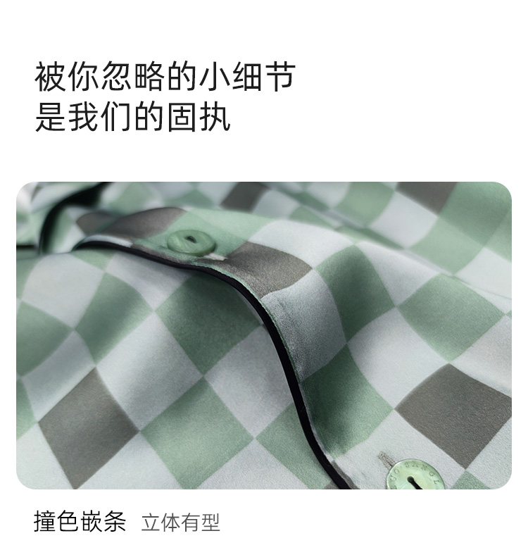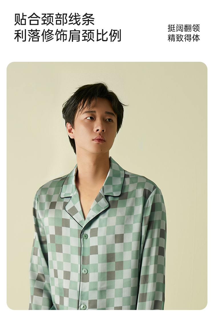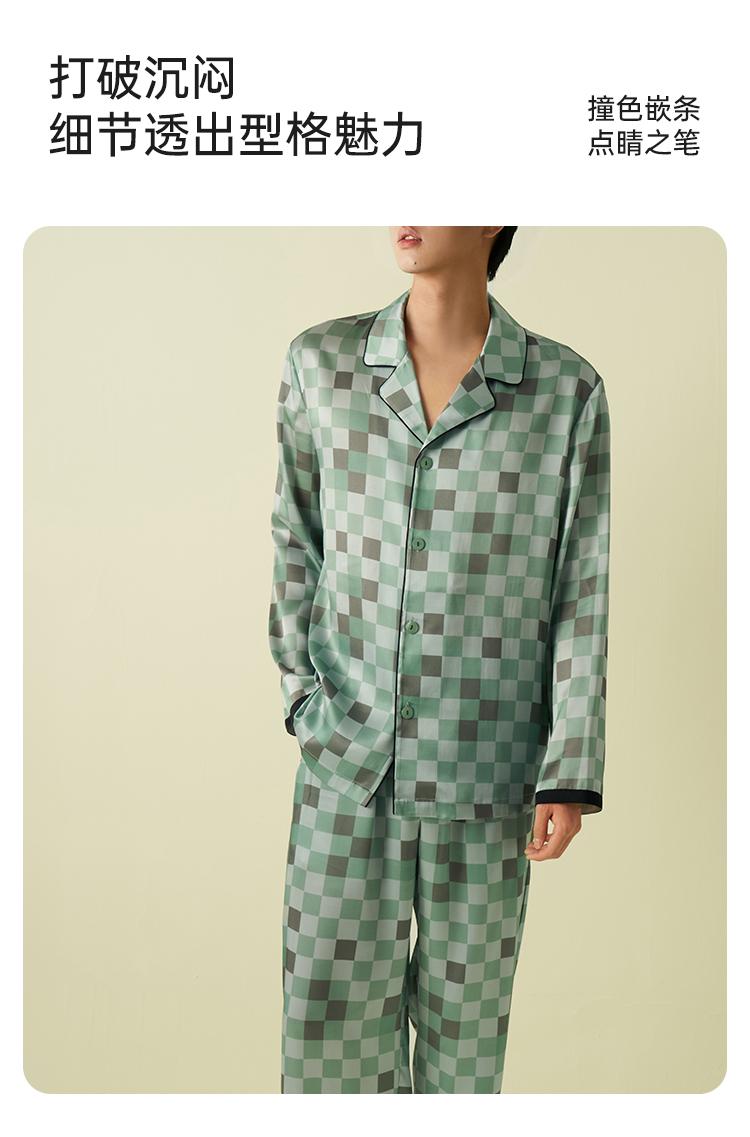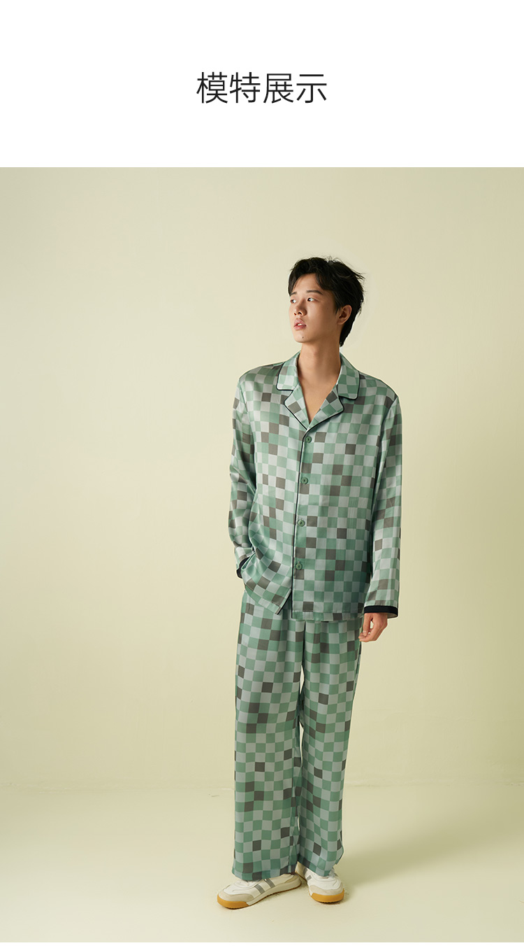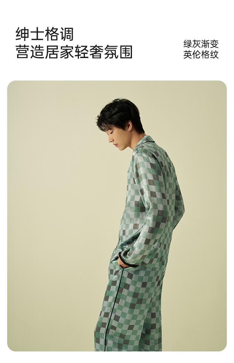 英伦风』桑罗绿灰格纹男士真丝睡衣套装100%桑蚕丝撞色长袖家居服