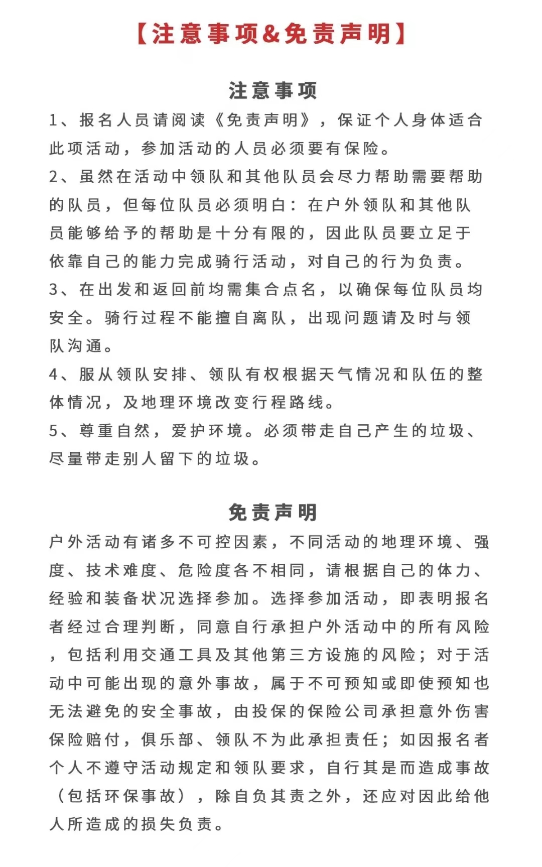 4.天冷请注意防护,参与活动请佩戴骑行装备:头盔、骑行眼镜、手套、水壶等。强烈建议自备或购买个人意外险。