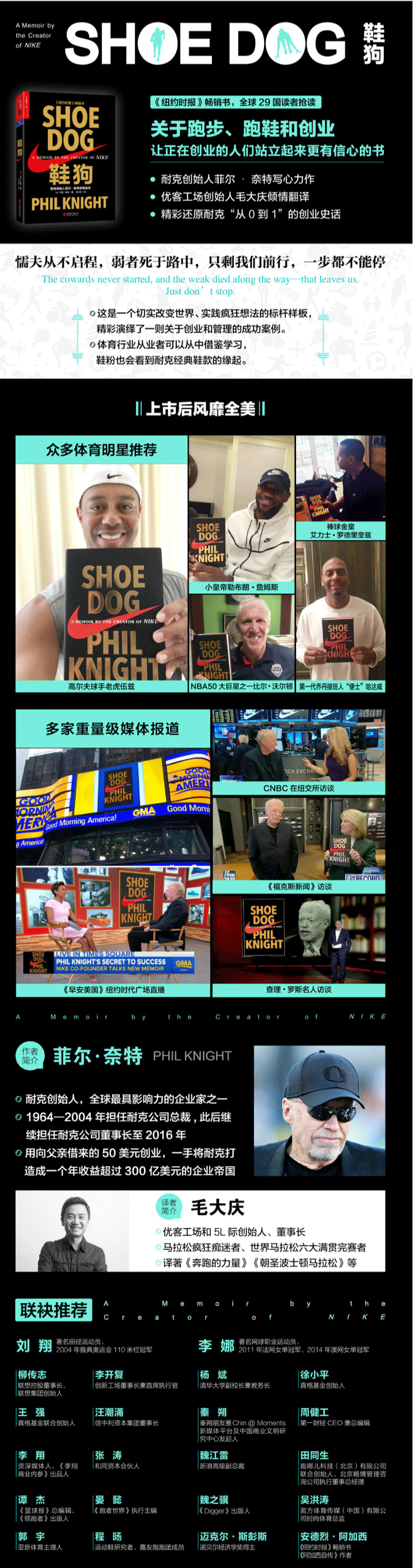 著名田径运动员、2004 年雅典奥运会110米栏冠军刘翔,著名网球职业运动员、2011 年法网女单冠军、2014 年澳网女单冠军李娜,联想控股董事长、联想集团创始人柳传志,创新工场董事长兼首席执行官李开复,真格基金创始人徐小平,真格基金联合创始人王强,信中利资本集团董事长汪潮涌,秦朔朋友圈Chin @ Moments 新媒体平台及中国商业文明研究中心发起人秦朔,第一财经CEO 兼总编辑周健工,资深媒体人、《李翔商业内参》出品人李翔,和同资本合伙人张涛,新浪高级副总裁魏江雷,跑哪儿科技(北京)有限公司联合创始人、北京略博管理咨询公司执行董事总经理田同生,《篮球报》总编辑、《领跑者》出版人谭杰,《跑者世界》执行主编晏懿,《Digger》出版人魏之骥,盈方体育传媒(中国)有限公司时尚体育总监吴洪涛,亚新体育主理人郭宇,运动鞋研究者、嘉友跑跑团成员程旸,《纽约时报》畅销书《双生石》作者亚伯拉罕•弗吉斯,《纽约时报》畅销书《阿加西自传》作者、著名网友运动员安德烈•阿加西,《纽约时报》畅销书《我想念我自己》与《奥布赖恩一家》作者莉莎•热那亚,诺贝尔经济学奖得主迈克尔•斯彭斯 联袂推荐!