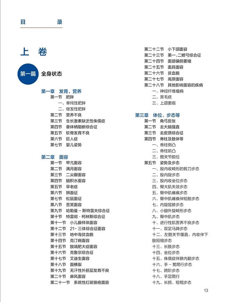 全书共分十九篇,按照诊断学统编教材的先后顺序和分类原则依次排列,专篇列于其后。本书依据大临床、大诊断的基本原则,充分整合临床各科疾病的诊断知识与技术,尤其是利用可视化图像,将疾病的特征性病态图像直接呈现给医生和医学院校师生。这种特有的形象性、直观性、准确性和简洁性表达,不仅传递出大量的病情信息,更有着文字无可比拟的真实与生动,也蕴藏着文字无法表达的信息,在很大程度上也留住了疾病的原汁原味。相关研究证明,独特的视觉体验更容易在⼈的⼤脑中留下深刻印象,其亮眼、⼊⼼的“国际语⾔”作⽤,让全世界的专业⼈⼠都能看得清、读得懂,其携带的⼤量信息,以及在全球范围内传播的速度及便捷度,已超出⼈们的想象。其视觉冲击⼒的教化效果可能⽐任何⾔语表达都显著。加之在专业基础上对图⽚特征精准概述的⽂字,更是抓住疾病的本质,⾔简意深地概括病态图像的内涵。真知灼⻅,掷地有声;点睛之笔,多能引发共鸣。加上图⽂结合的叠加效应,对学深悟透,融会贯通,多能获得事半功倍之效。总之,本书作为⼀套适⽤于临床各科医⽣和医学院校师⽣的⼤型实⽤性诊断类参考书,特⾊鲜明,“有图有真相”,以临床特征性病态图⽚为重点,内容涵盖临床各科的常⻅病、罕⻅病。对加快年轻医⽣的成⻓和提⾼医⽣诊疗⽔平的作⽤不容低估。不怕不信,就怕不读。本书将临床各科疾病的诊断知识与技术进⾏整合,不仅有利于临床医⽣尽快了解临床诊断学的全貌,亦能促进本学科⽔平的发展及提⾼。因为任何⼀个临床学科都有其局限性,医⽣的专业知识储备多是本学科或 相近学科的内容,即使是本学科的⼀些少⻅病及罕⻅病知识,也可能是年轻医⽣知识储备以外的东西。更别说其他学科的相关内容……