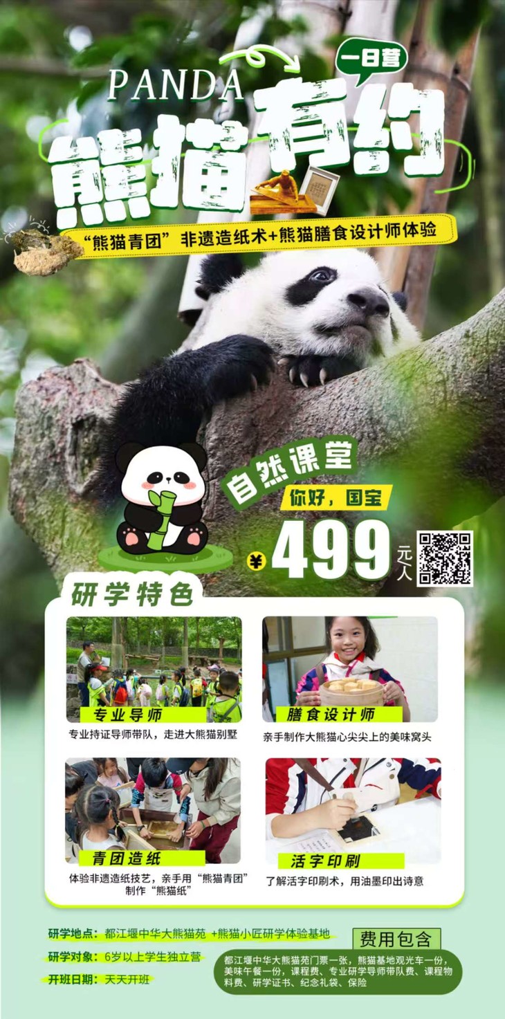 1人成团【都江堰-熊猫有约一日研学】走进大熊猫别墅,“熊猫青团”非遗造纸术,化身熊猫营养师,制作熊猫窝窝头,含大熊猫荣誉证书