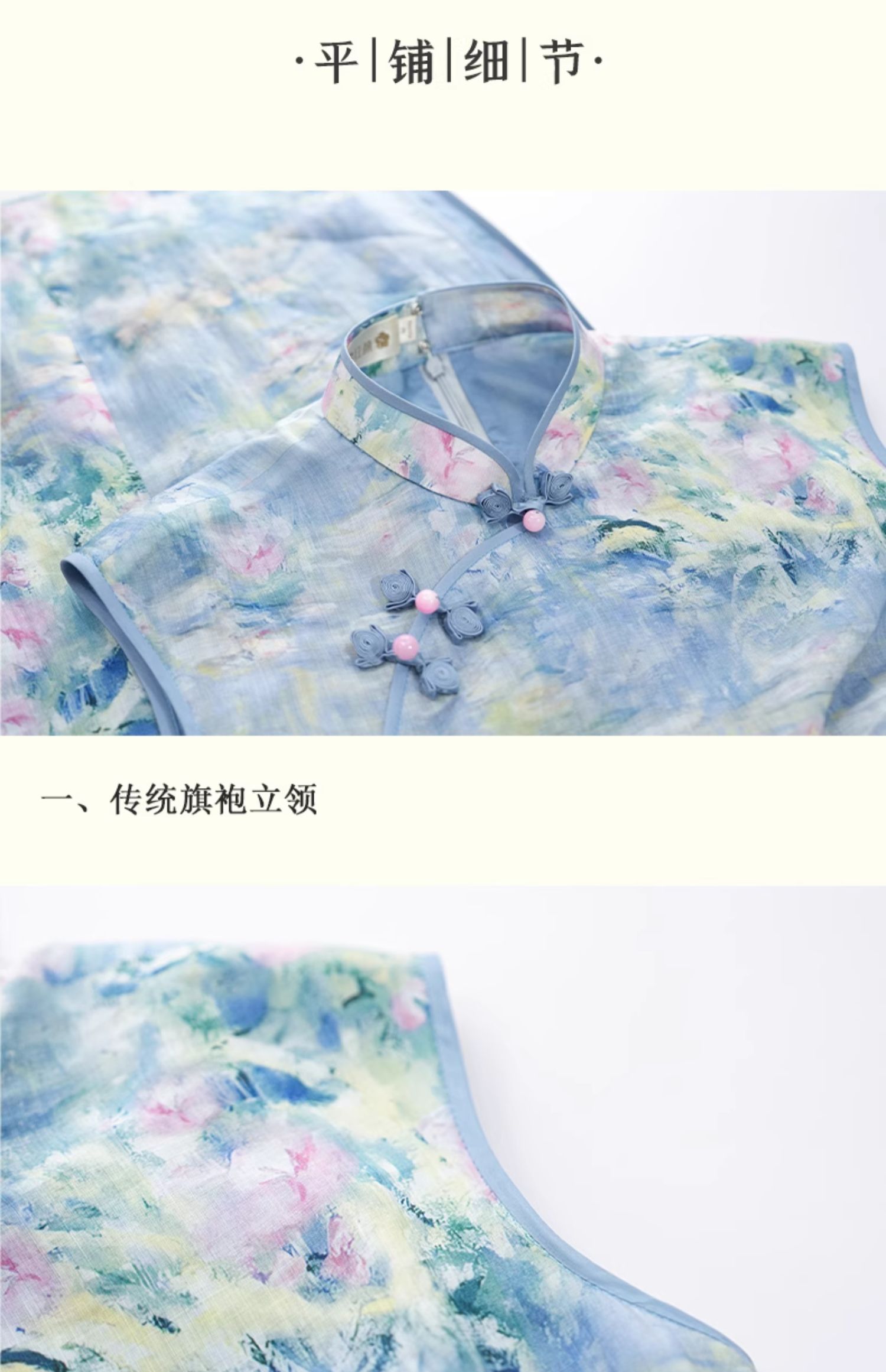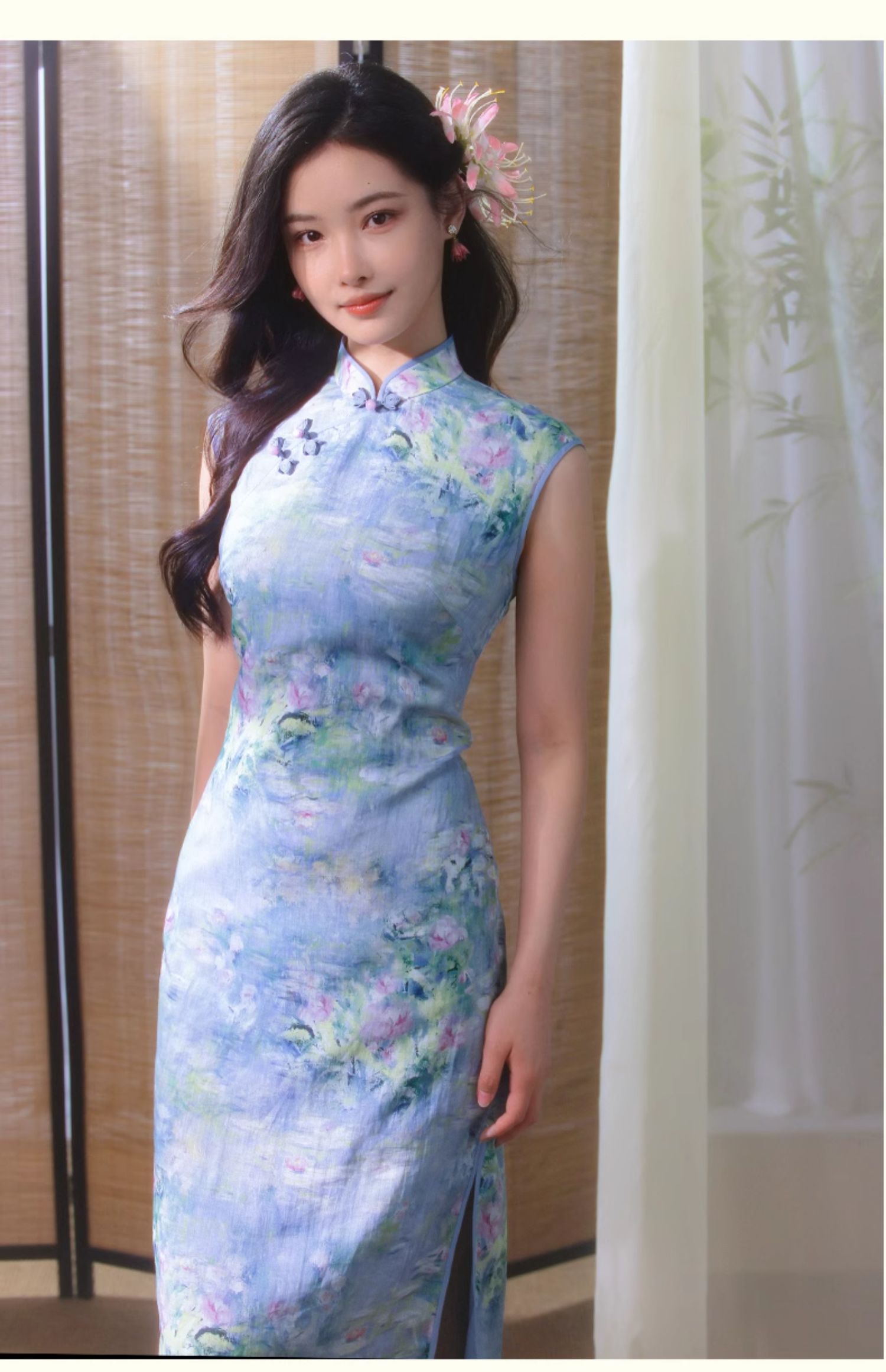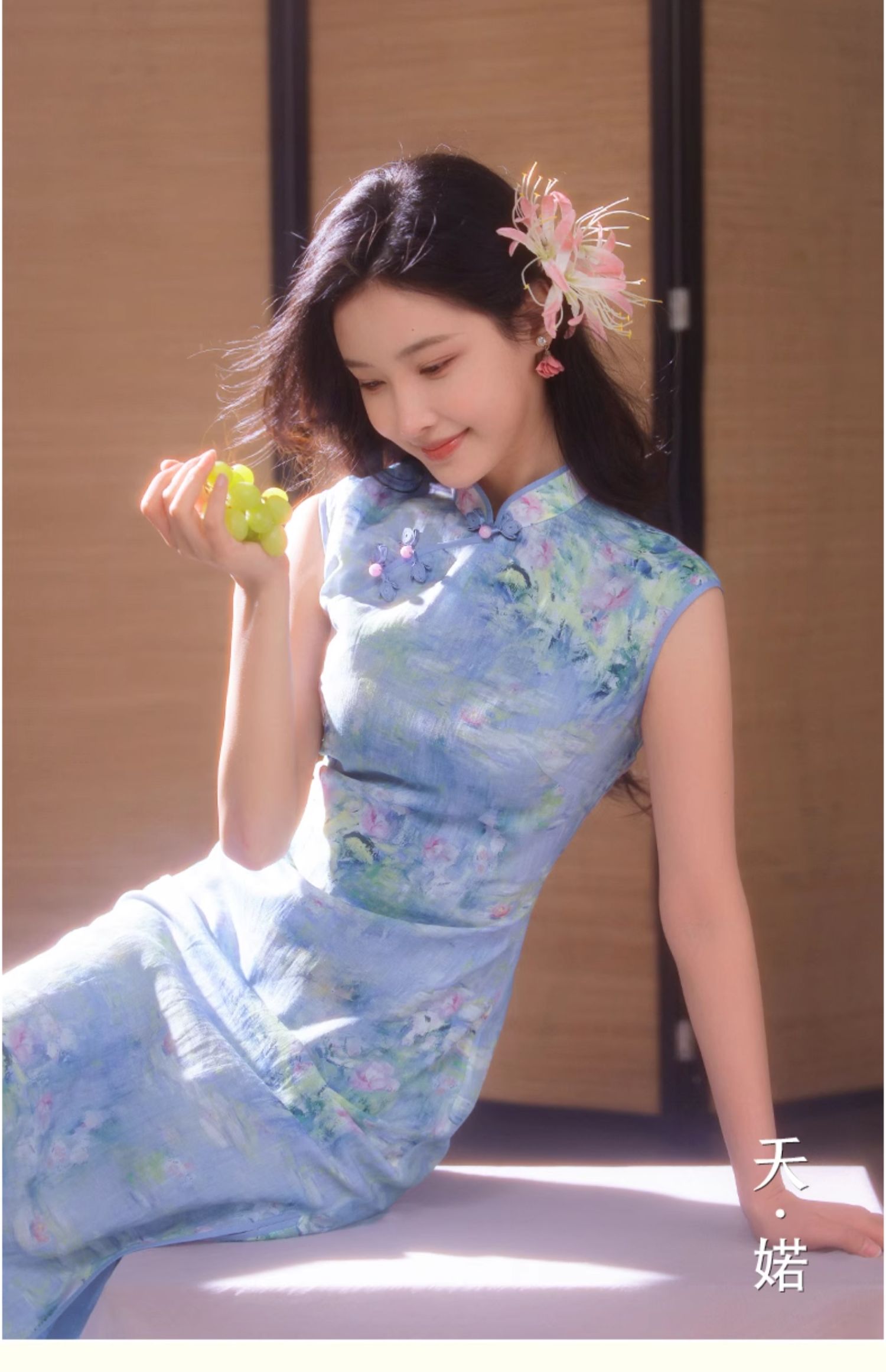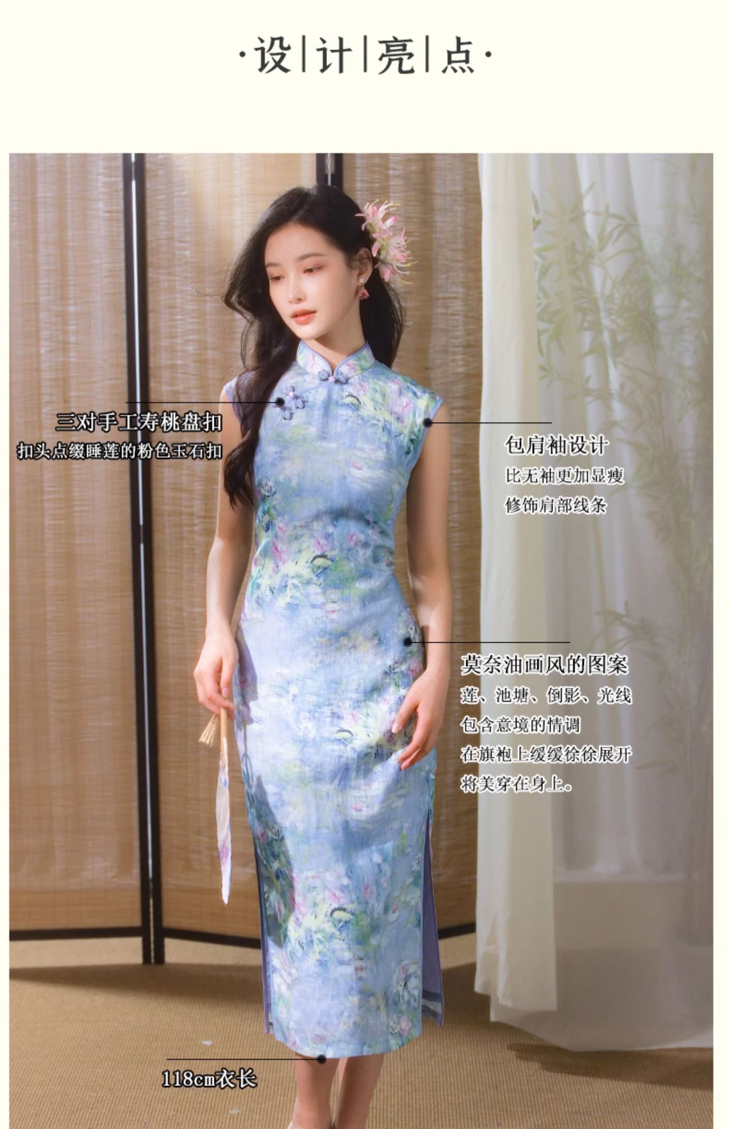 逸红颜天婼2025夏新款略宽松版天然植物草色染莫奈睡莲天丝麻旗袍