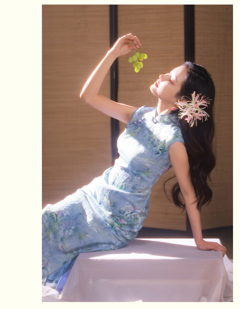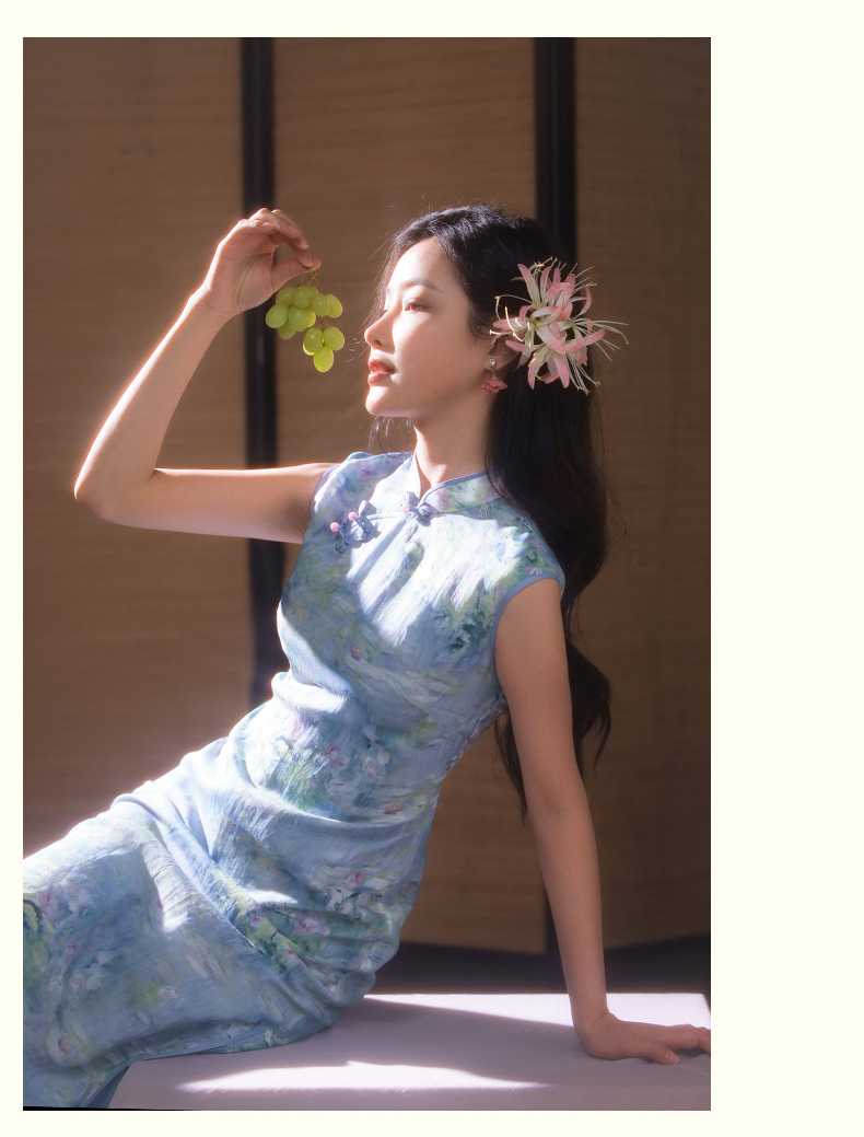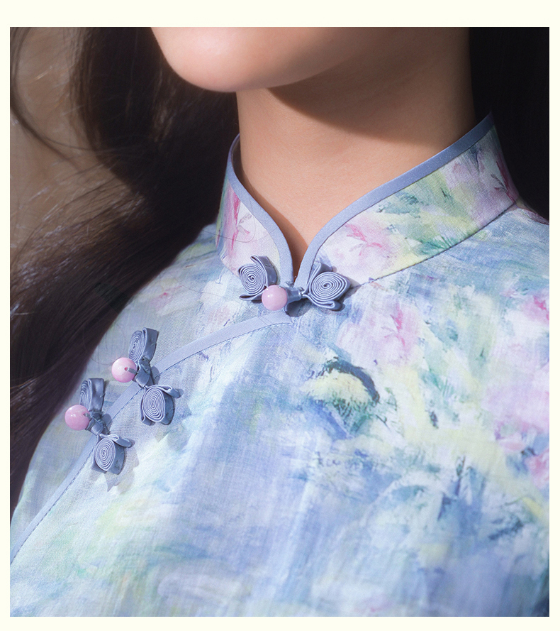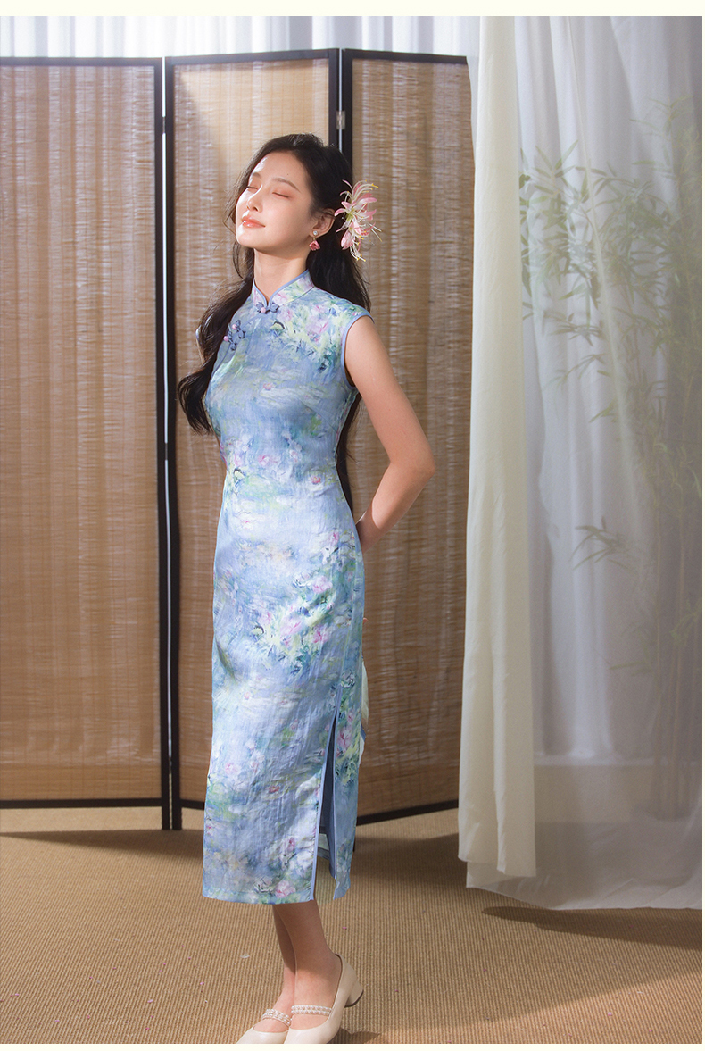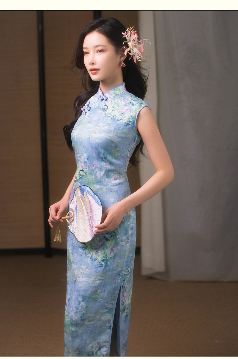 逸红颜天婼2025夏新款略宽松版天然植物草色染莫奈睡莲天丝麻旗袍