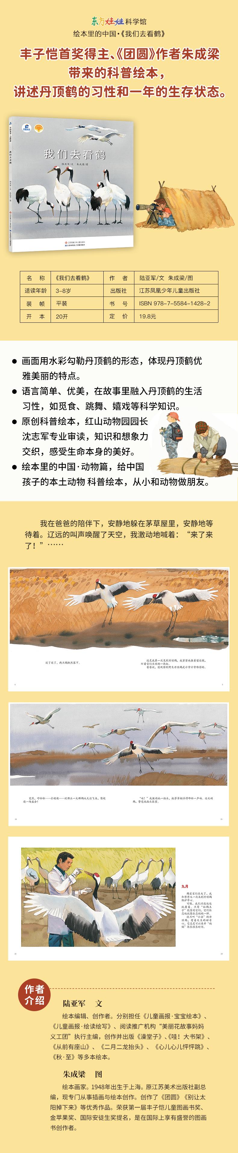 生命是一场爱的守候。故事以孩子的视角记录了和父亲一起看丹顶鹤的过程,安静的清晨,孩子依偎在父亲身旁等待着从未见过的鹤群,耳边是父亲轻柔的叮咛,眼前是辽阔静谧的自然风景,天空、海滩、大地。突然,随着一声又一声清亮的鸣叫,孩子兴奋的也跟着呼喊起来,在手中紧握不放的望远镜里,看到了洁白优雅的丹顶鹤结伴而来。此时,晨光漫天,一只又一只的丹顶鹤头顶着光,脚踩着泥,或踱步、或展翅、或舞动、或觅食,美好和谐的画面里,孩子还看到守护着鹤妈妈和鹤宝宝的鹤爸爸,就像自己也被爸爸保护着那样。丹顶鹤们最终满足的飞走了,孩子也满足的收起望远镜和爸爸一起前往保护中心,认识还在孵化中的丹顶鹤。在饲养员像妈妈一样日夜的用心陪伴守护下,鹤宝宝破壳而出并顺利长大,一直到它们学会飞翔,在寒冬来临前结伴飞往温暖的地方,来年的春天,再见。 无论是人类还是动物,在生命的历程中都包含着不同的阶段,有时是靠近、有是远观、有时是放手、有时是分别、有时是等待……然而,不管是什么,因为爱的陪伴和守候,总有希望和自由。