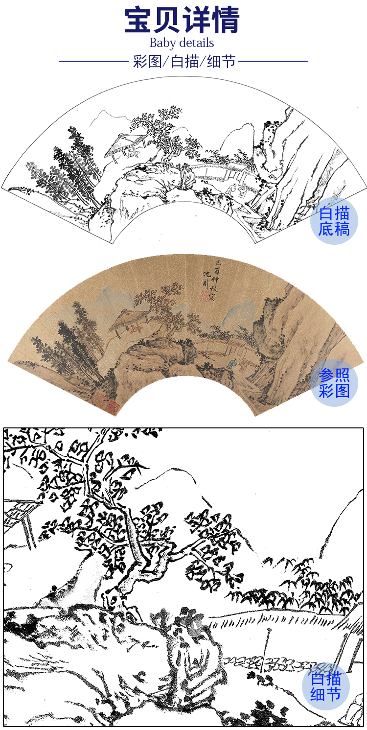 工笔画白描底稿 山水扇面小品 明 沈周 SR14