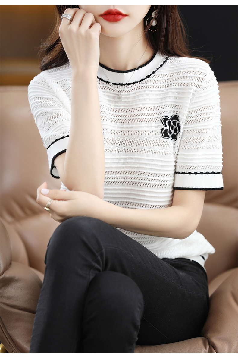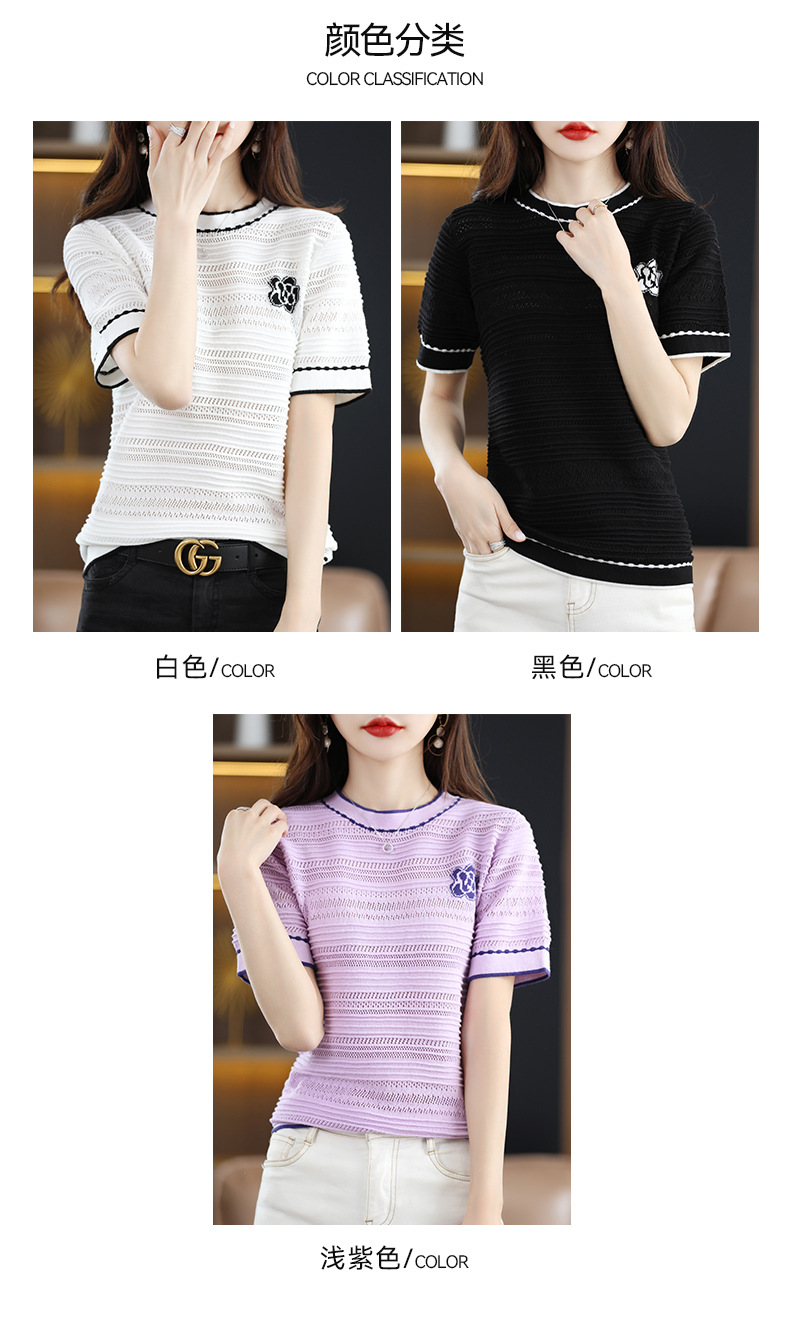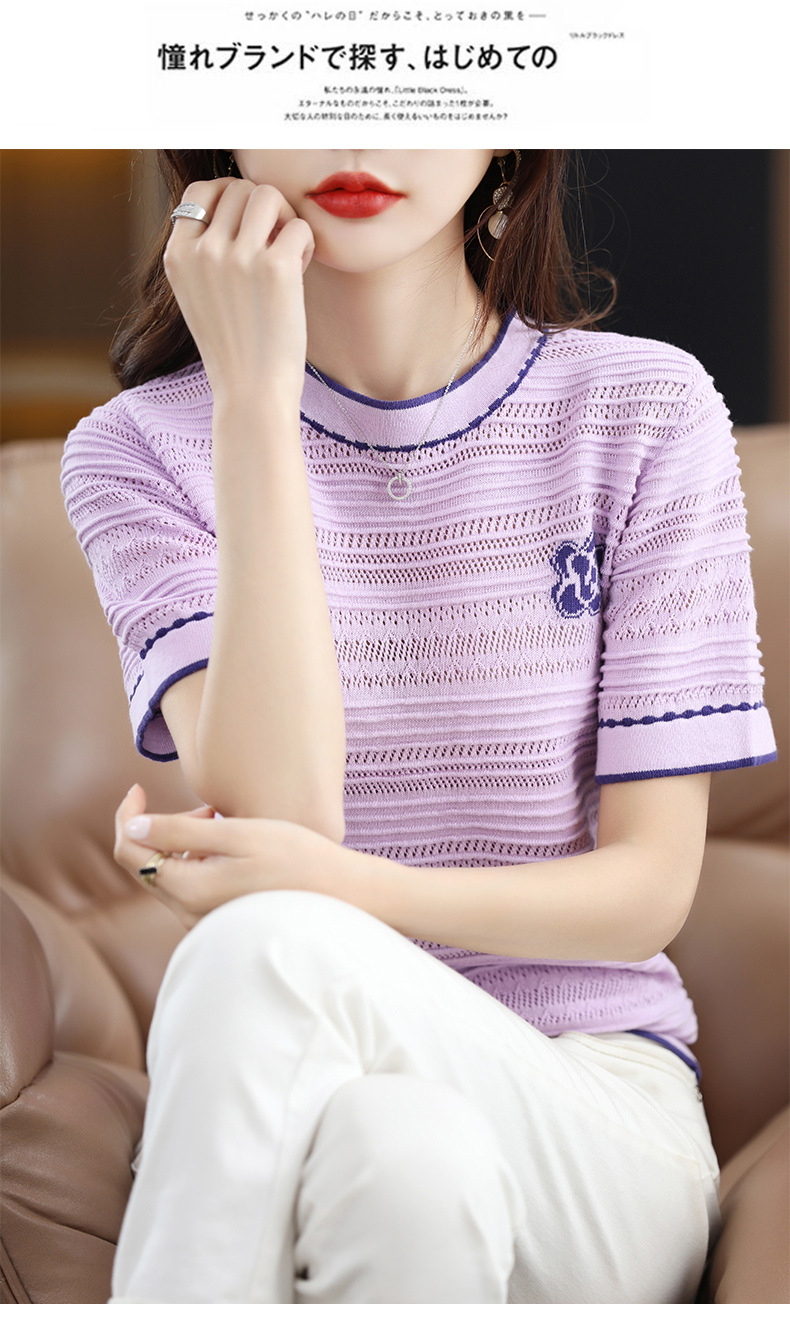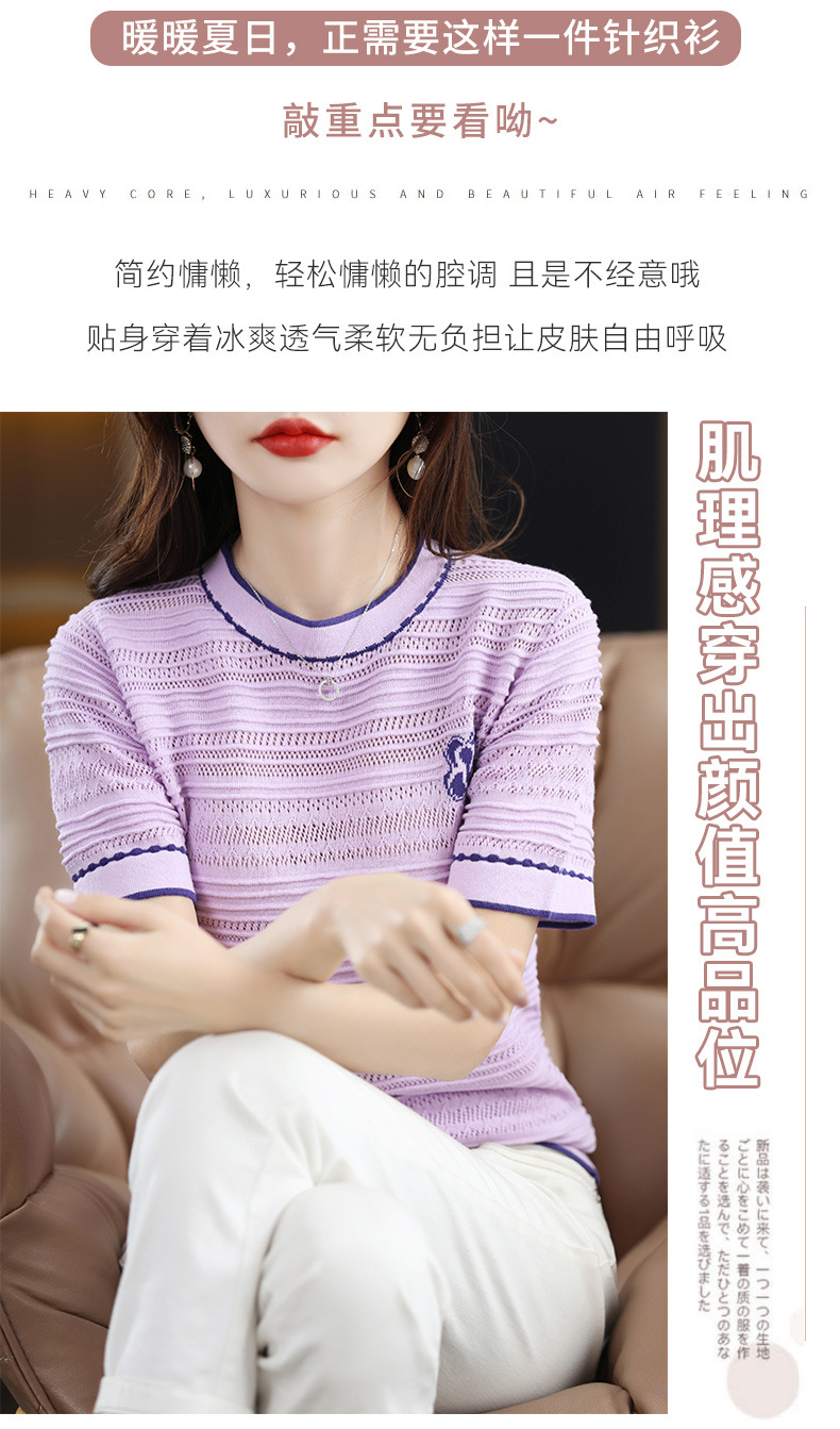 QHJY-JY1029镂空夏新款圆领t恤短袖女上衣时尚全棉线薄款洋气打底棉麻针织衫