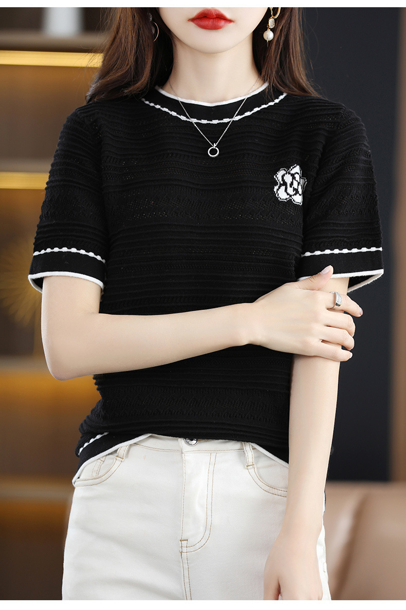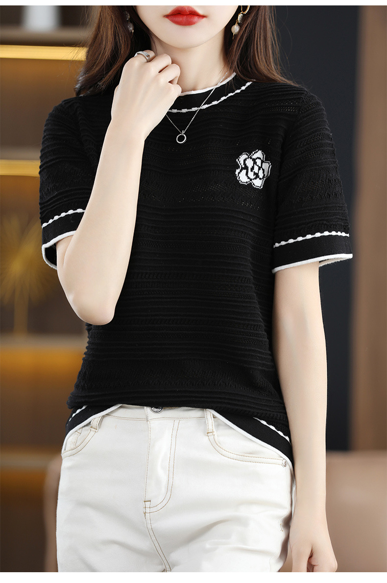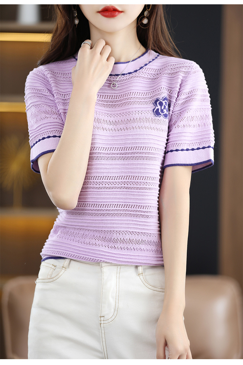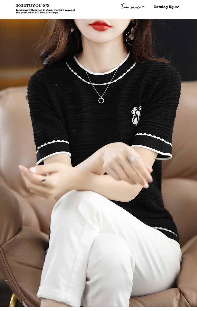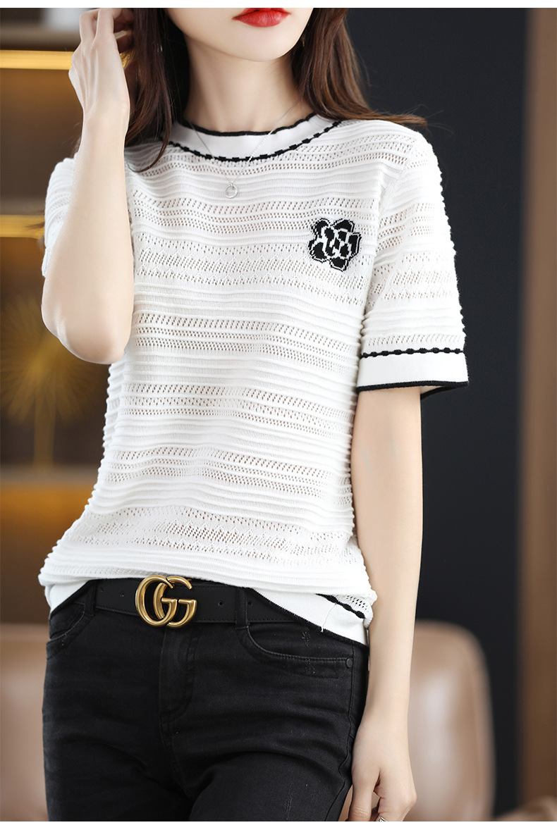 QHJY-JY1029镂空夏新款圆领t恤短袖女上衣时尚全棉线薄款洋气打底棉麻针织衫