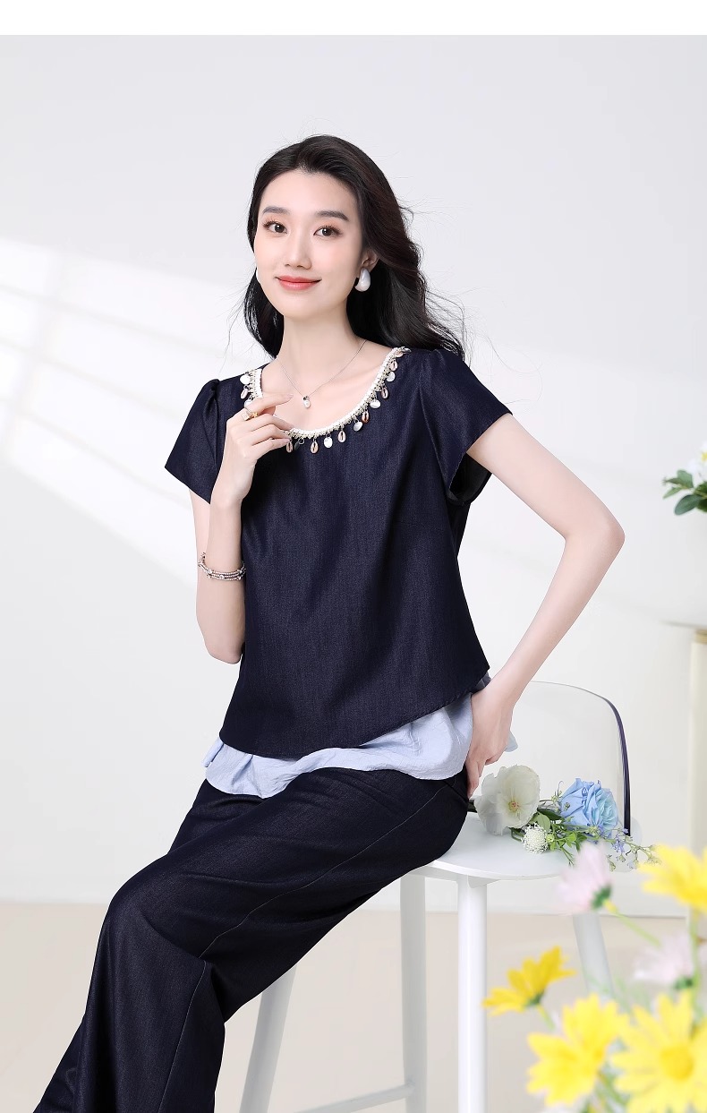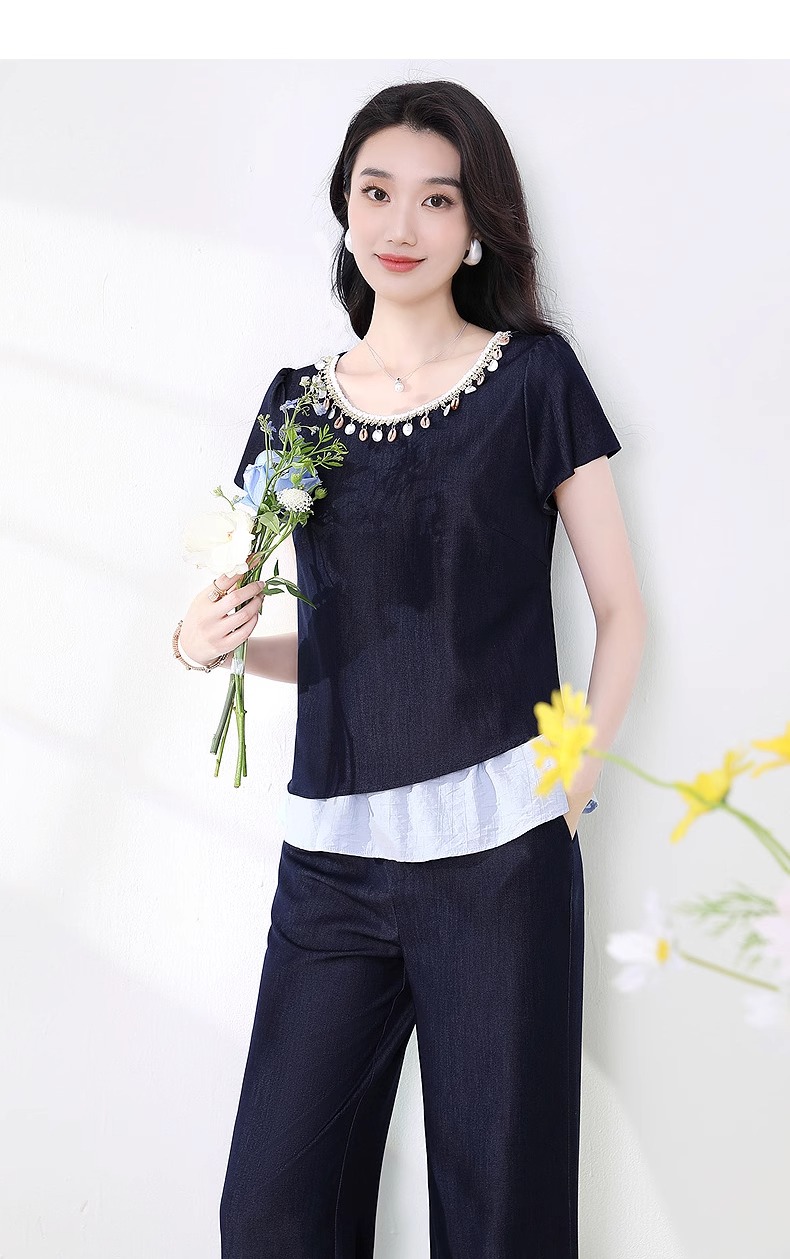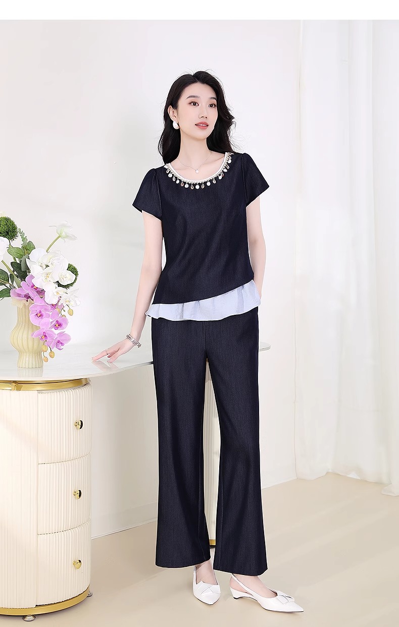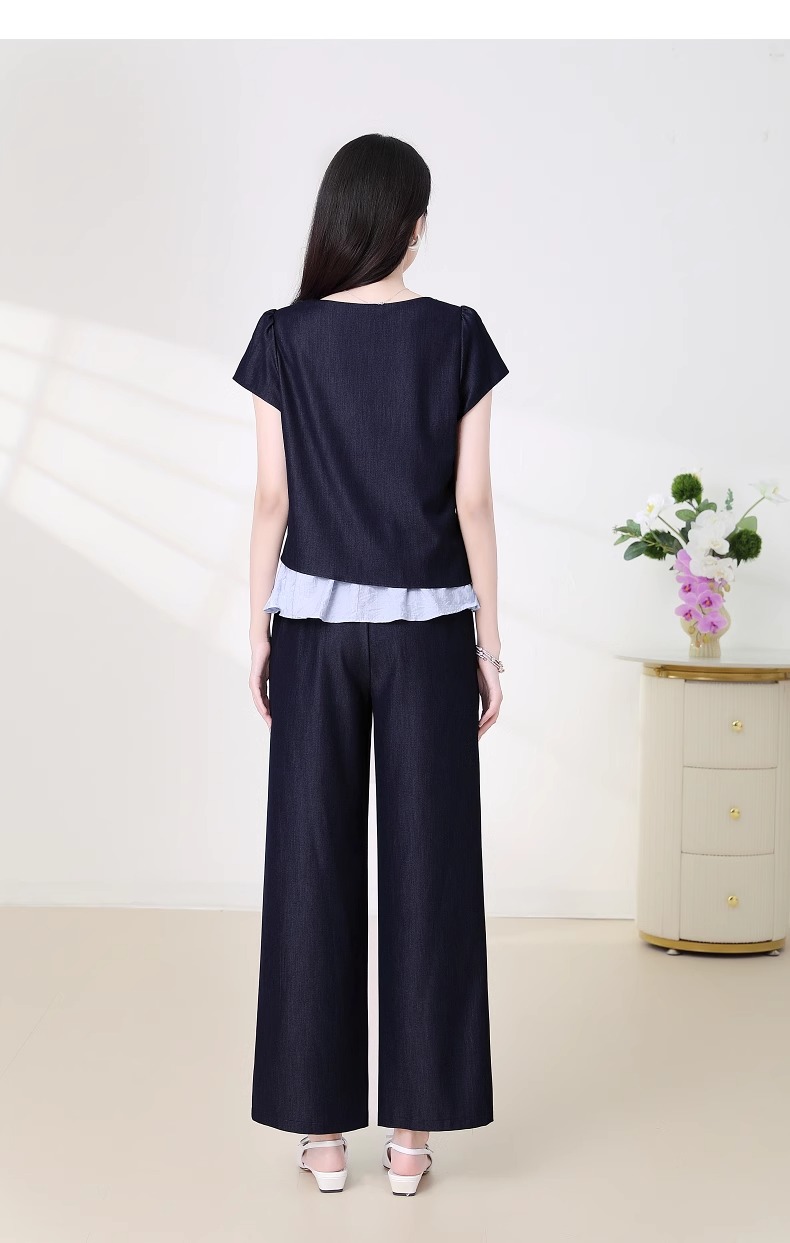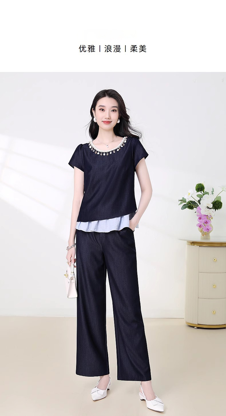 全新升级【铂金会员293/天猫399/差价106】(99846)洛诗琳撞色牛仔通勤套装女2025新款夏季圆领上衣阔腿裤两件套