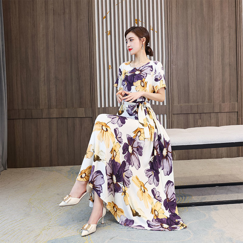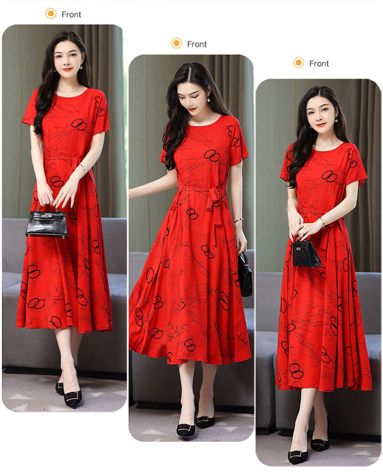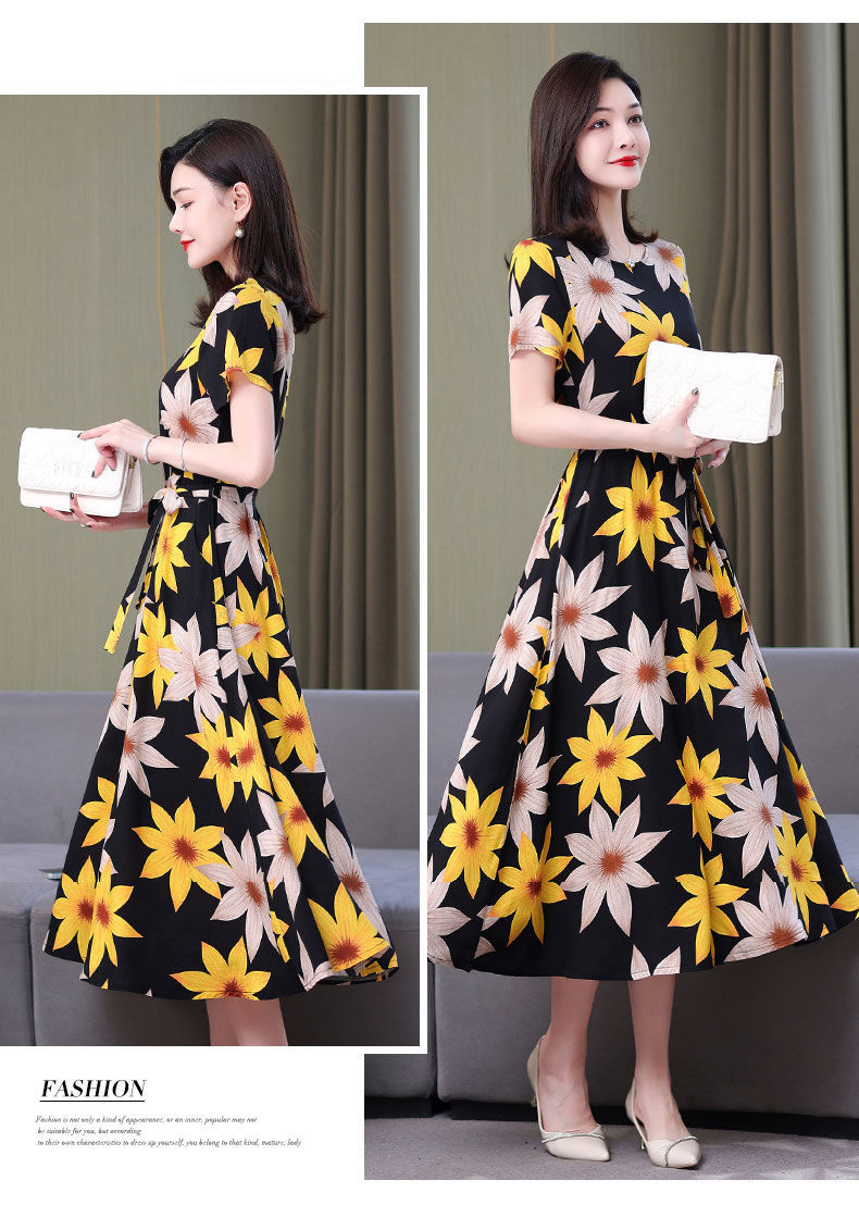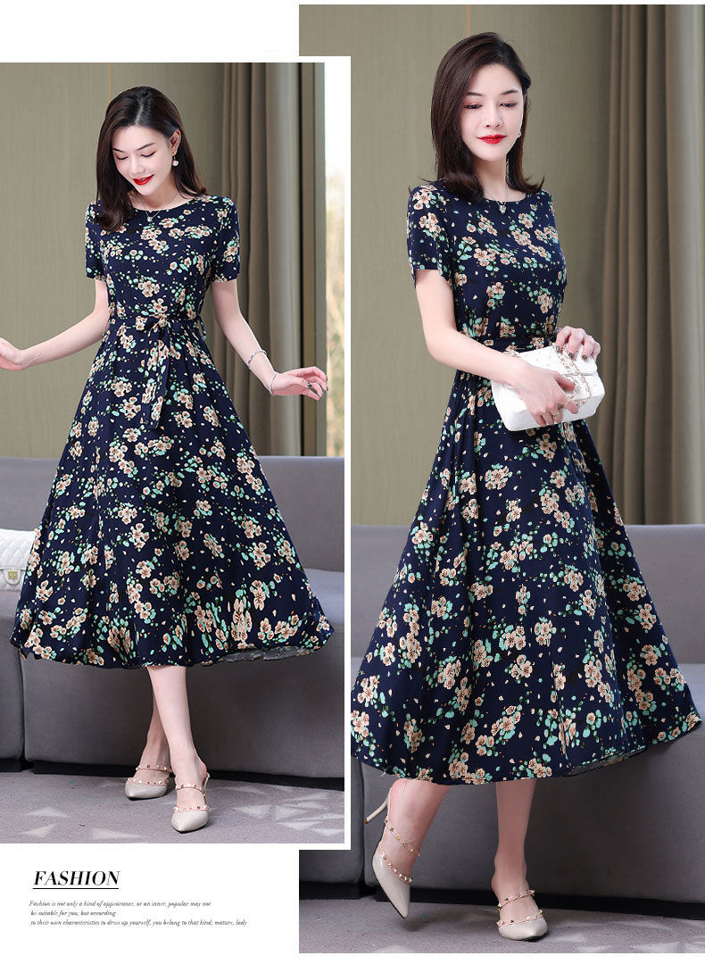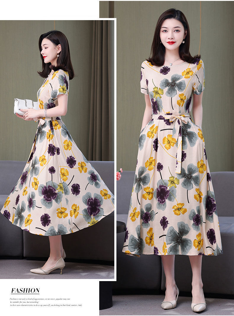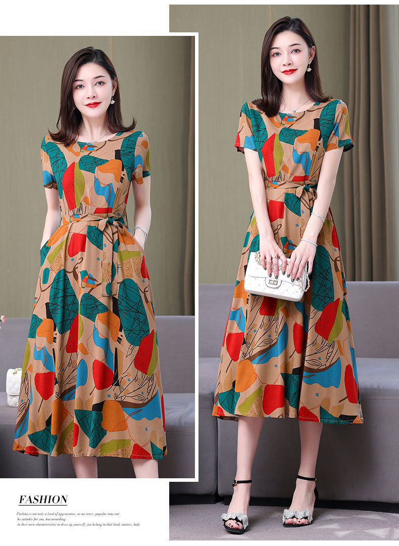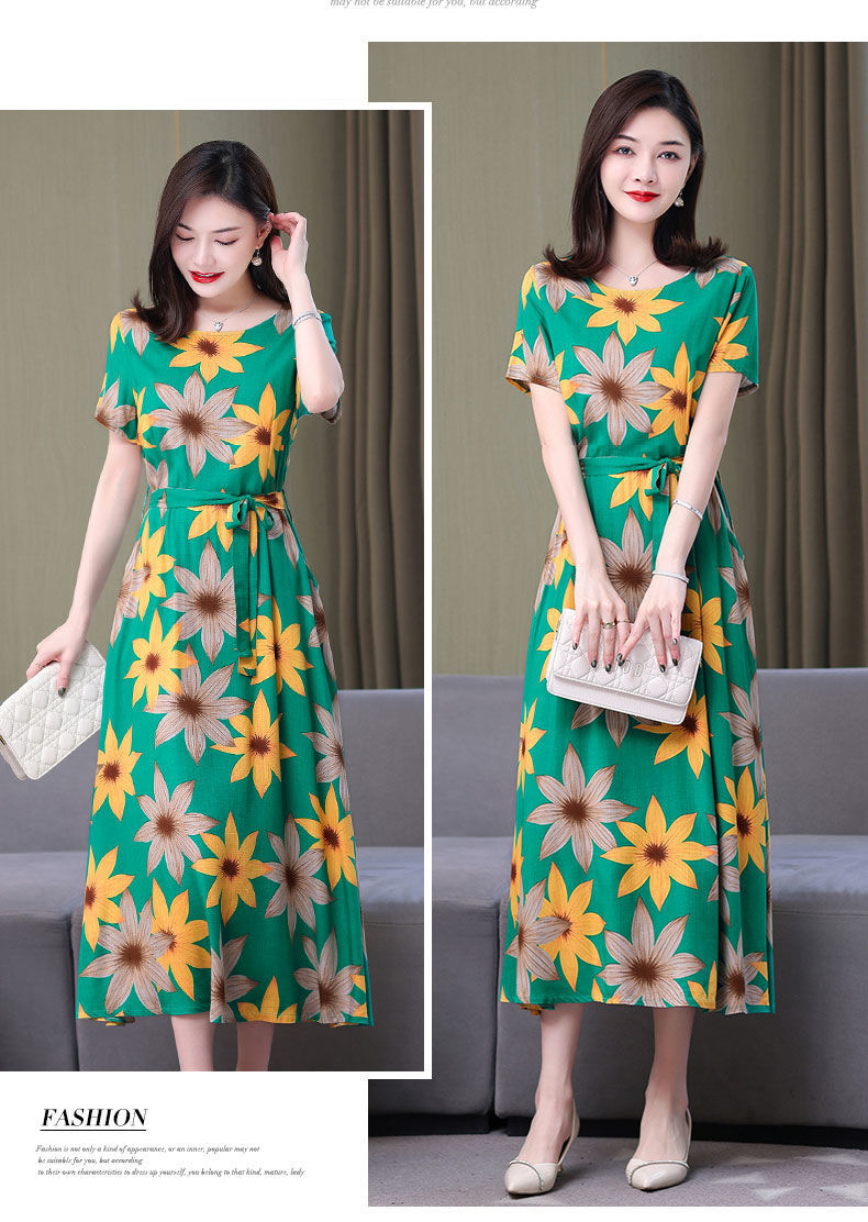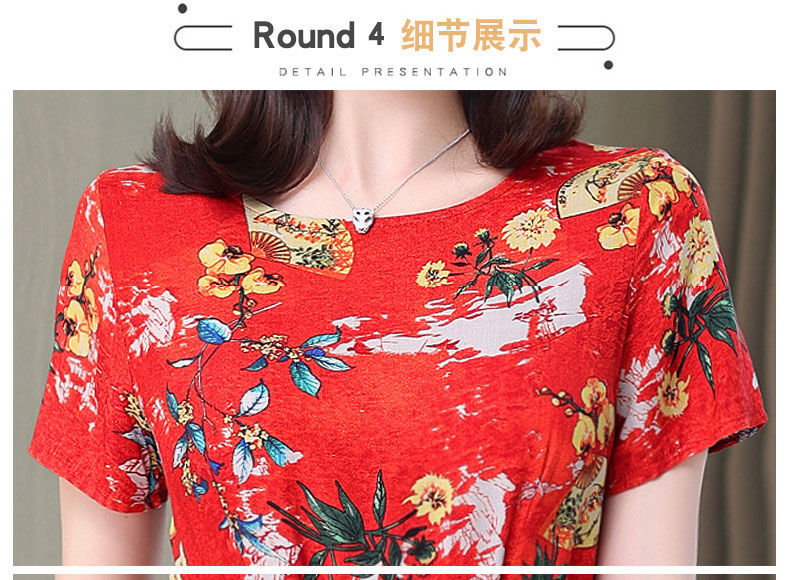 棉绸连衣裙女夏装大码阔太太妈妈装印花过膝大摆长裙