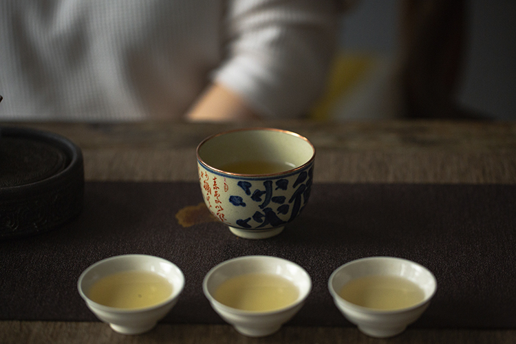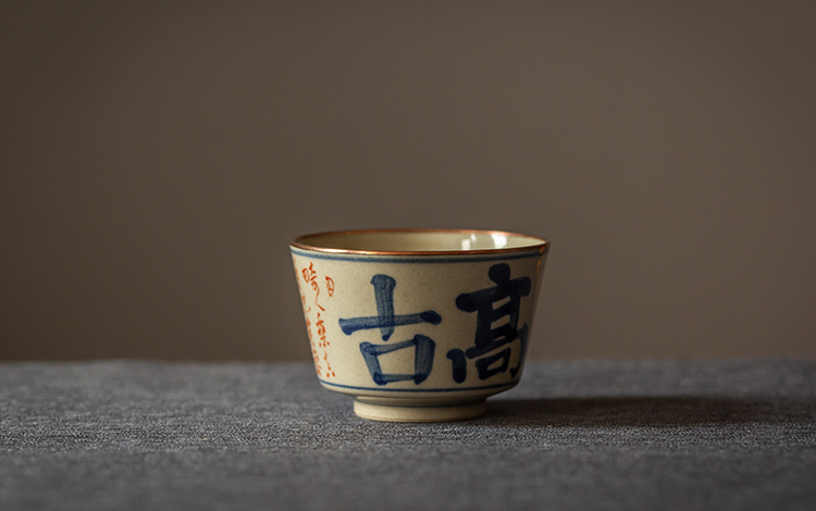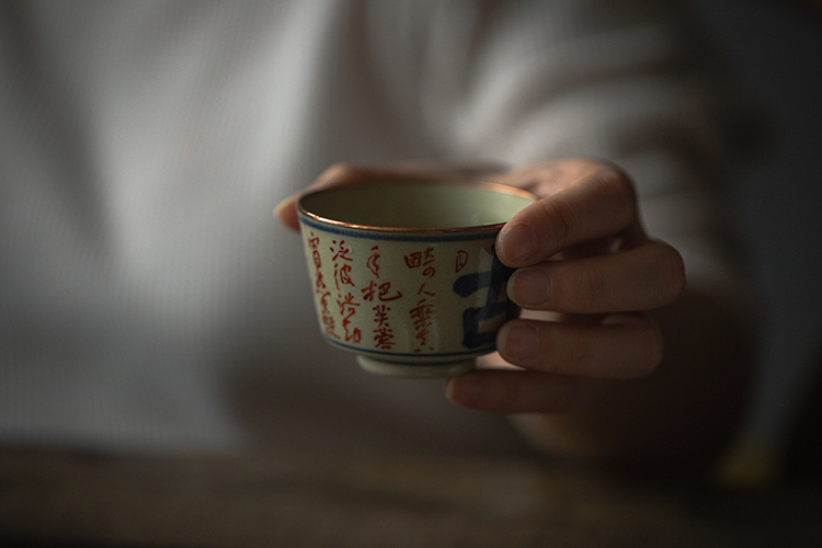杯身上的诗文手绘使用了釉下青花叠加釉上的技法,