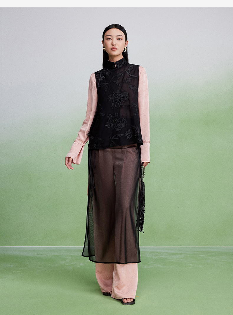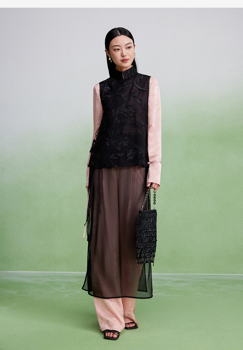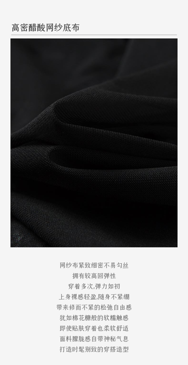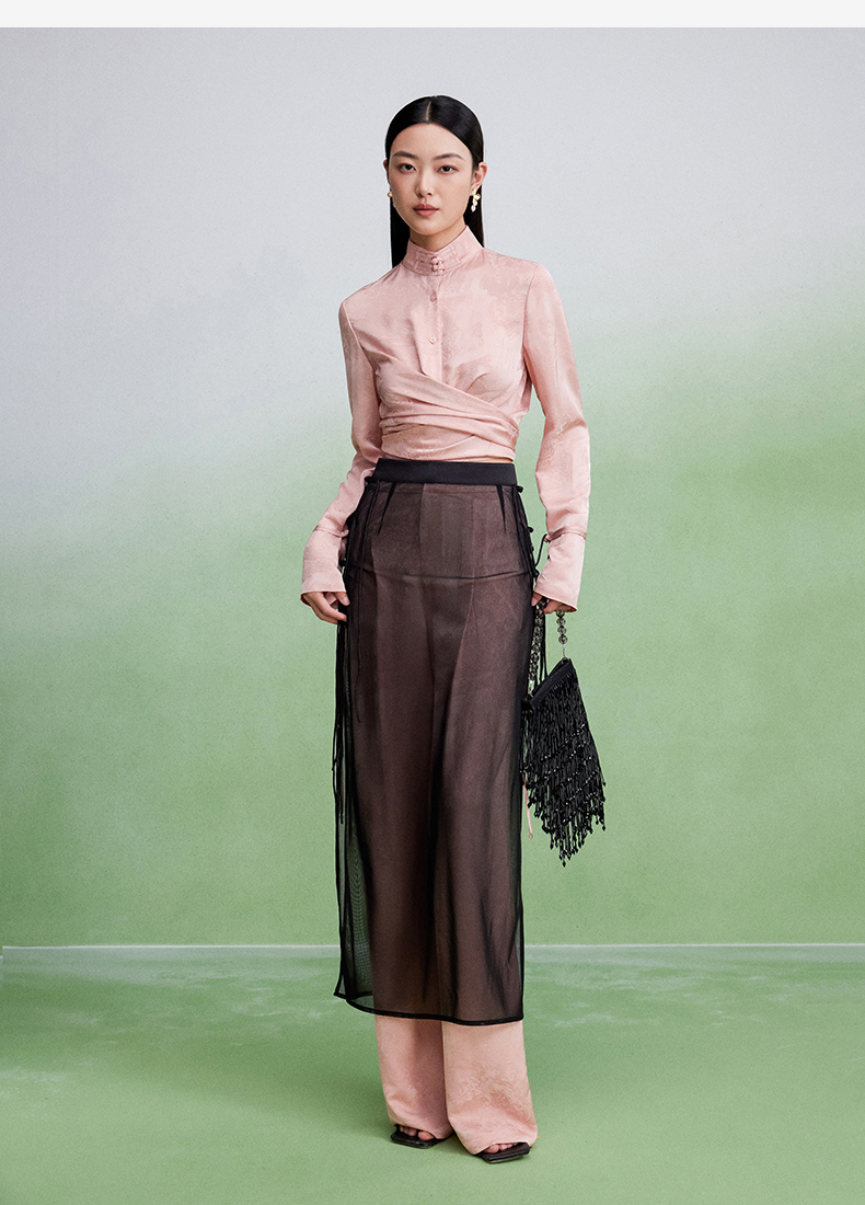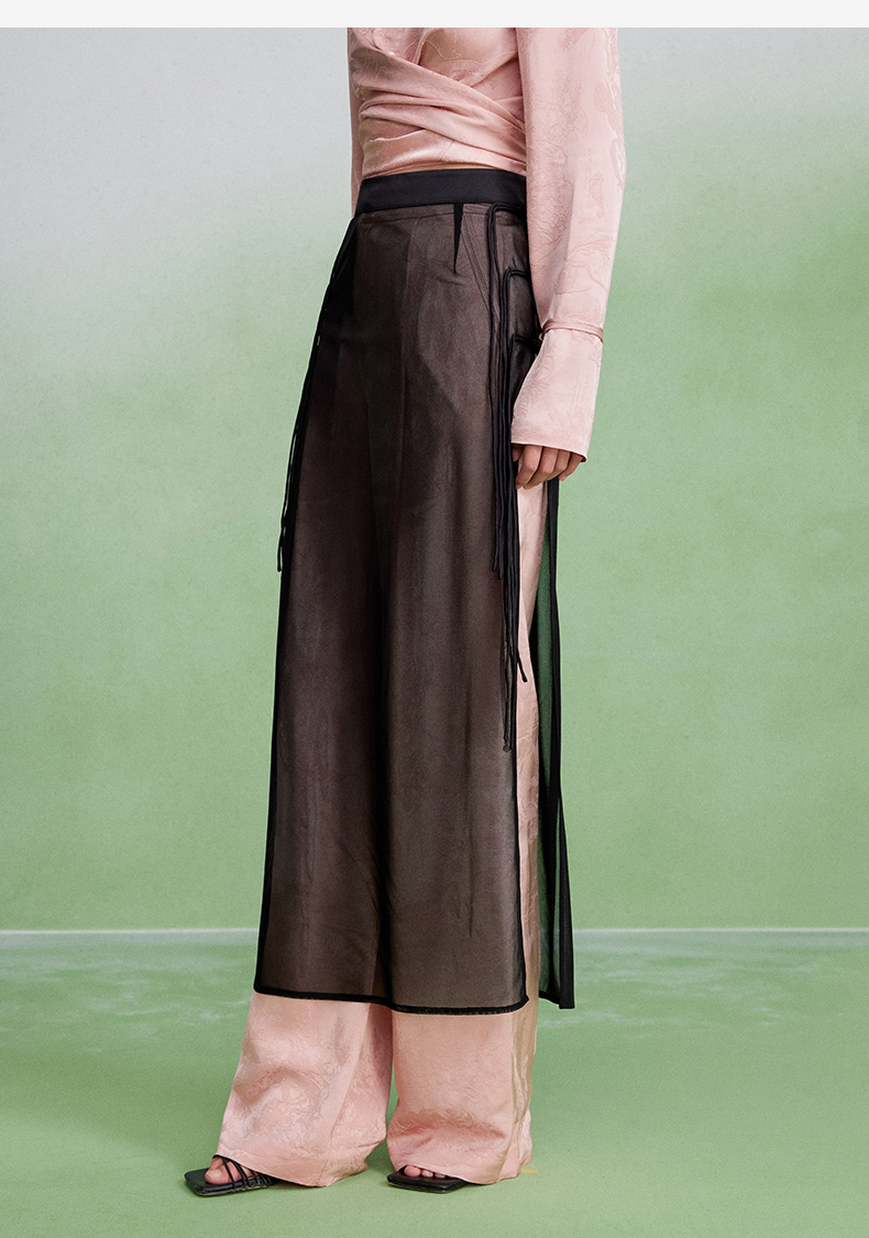 西嘉新中式醋酸网纱高腰气质拼接直筒叠穿半裙