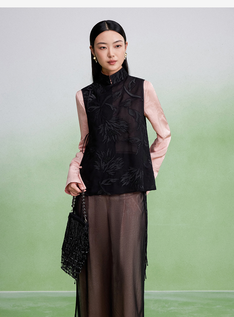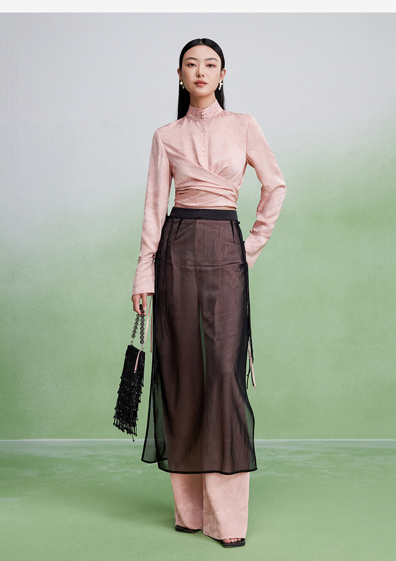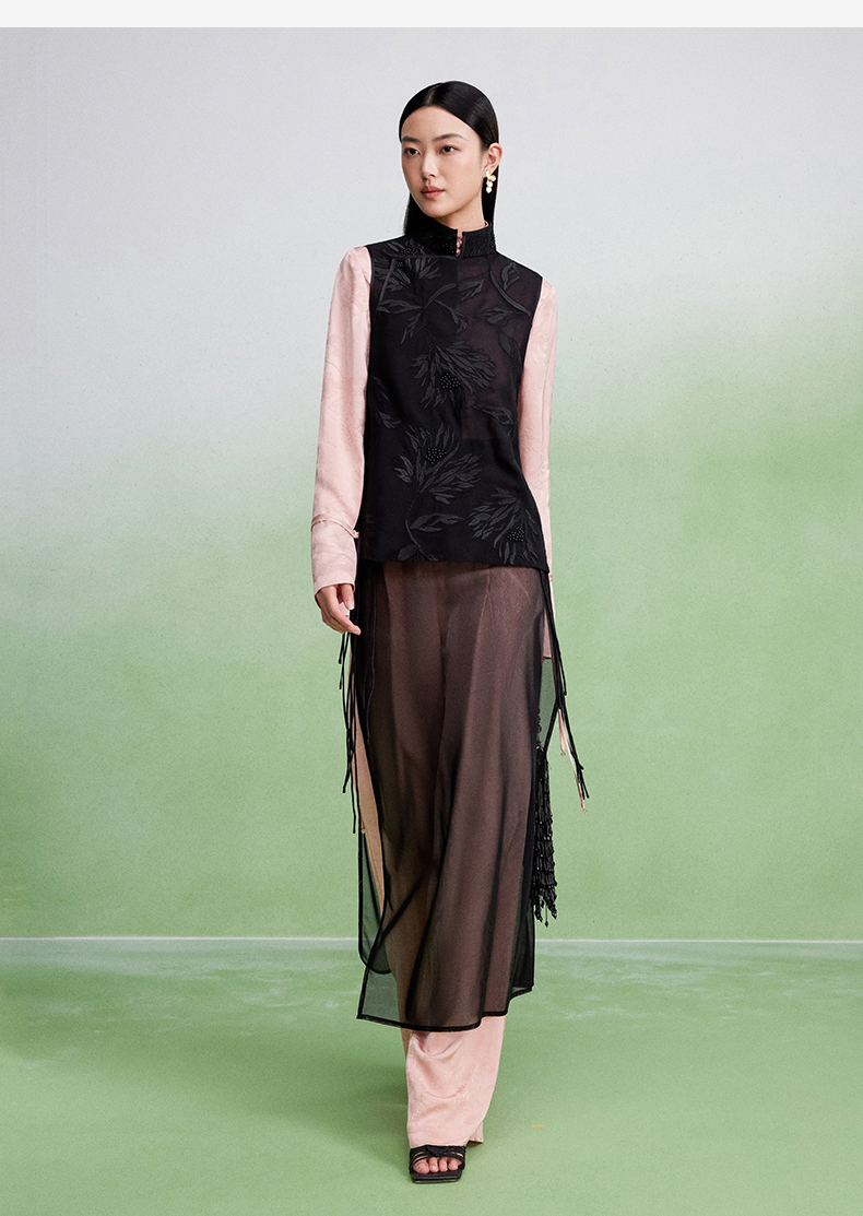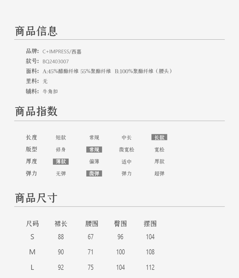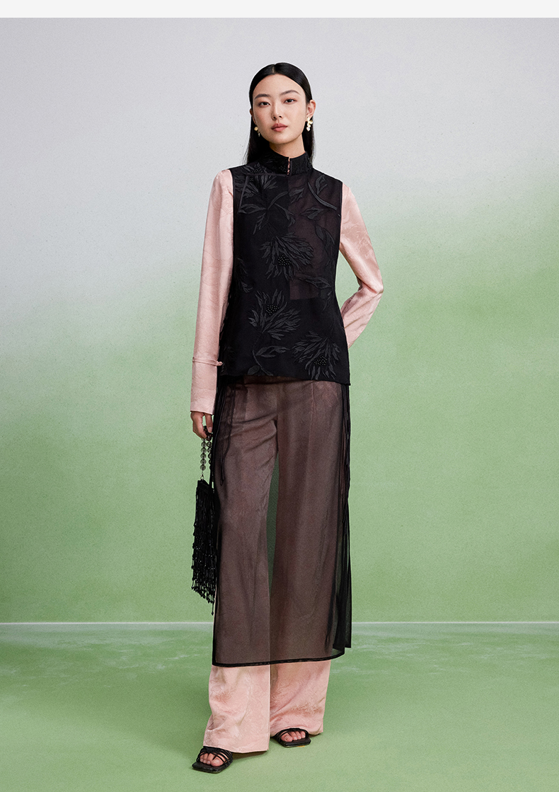 西嘉新中式醋酸网纱高腰气质拼接直筒叠穿半裙