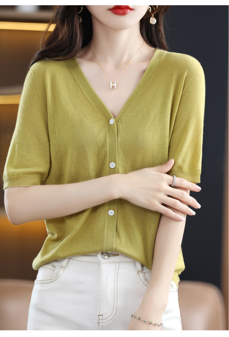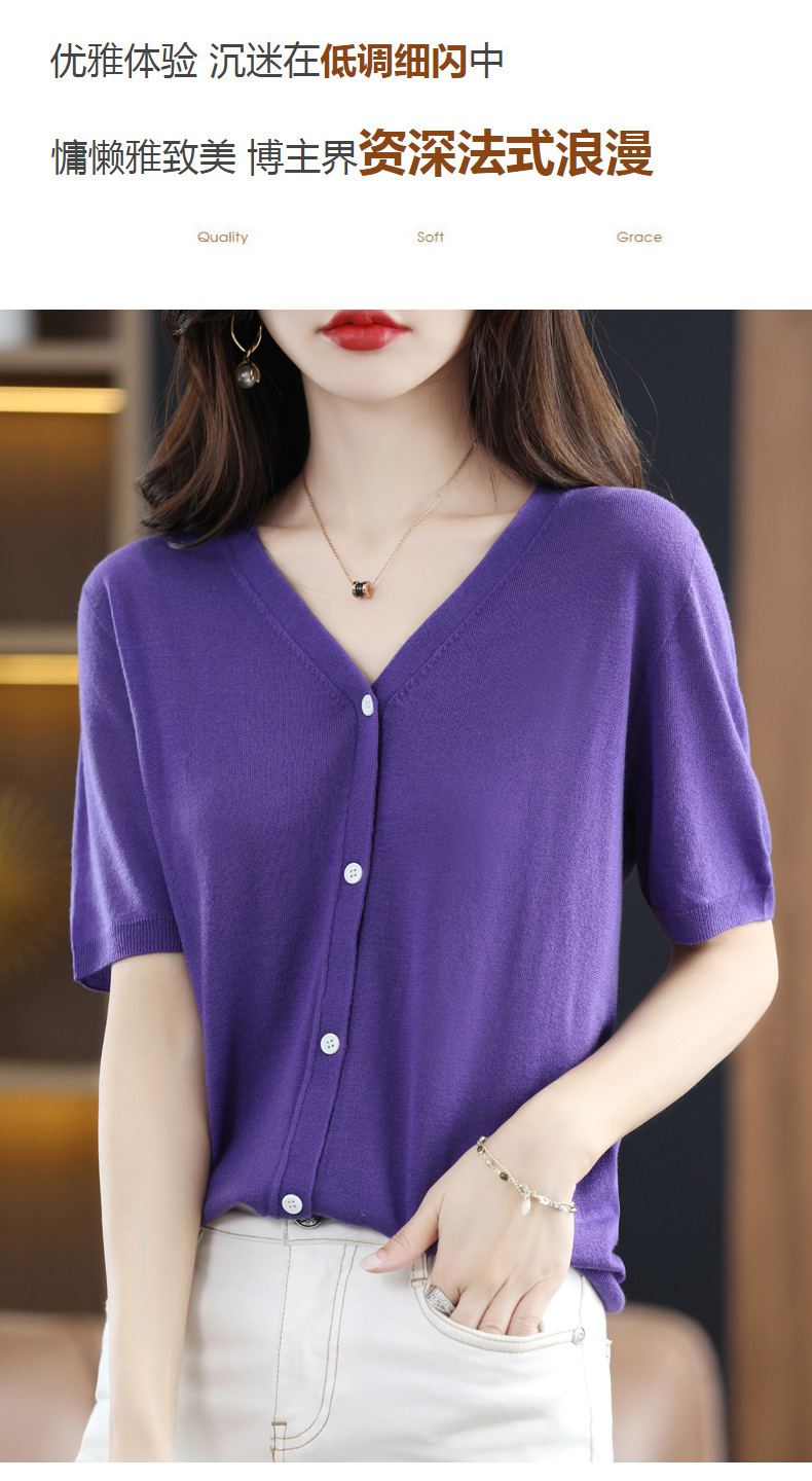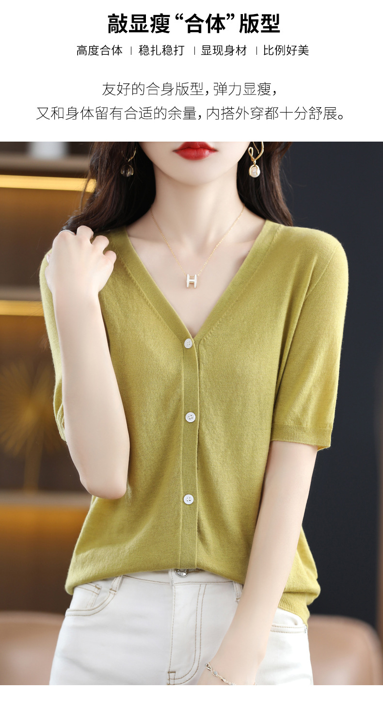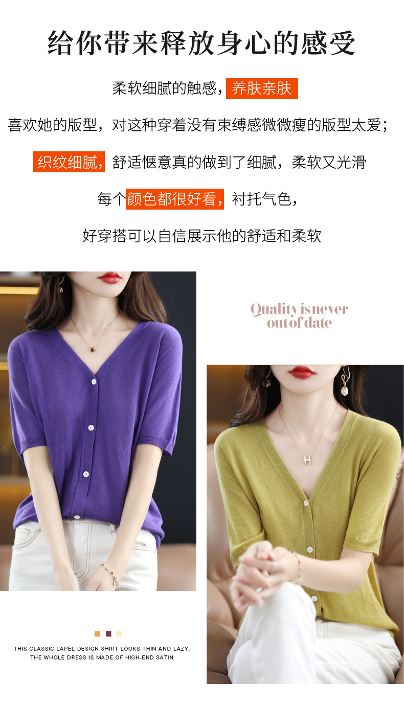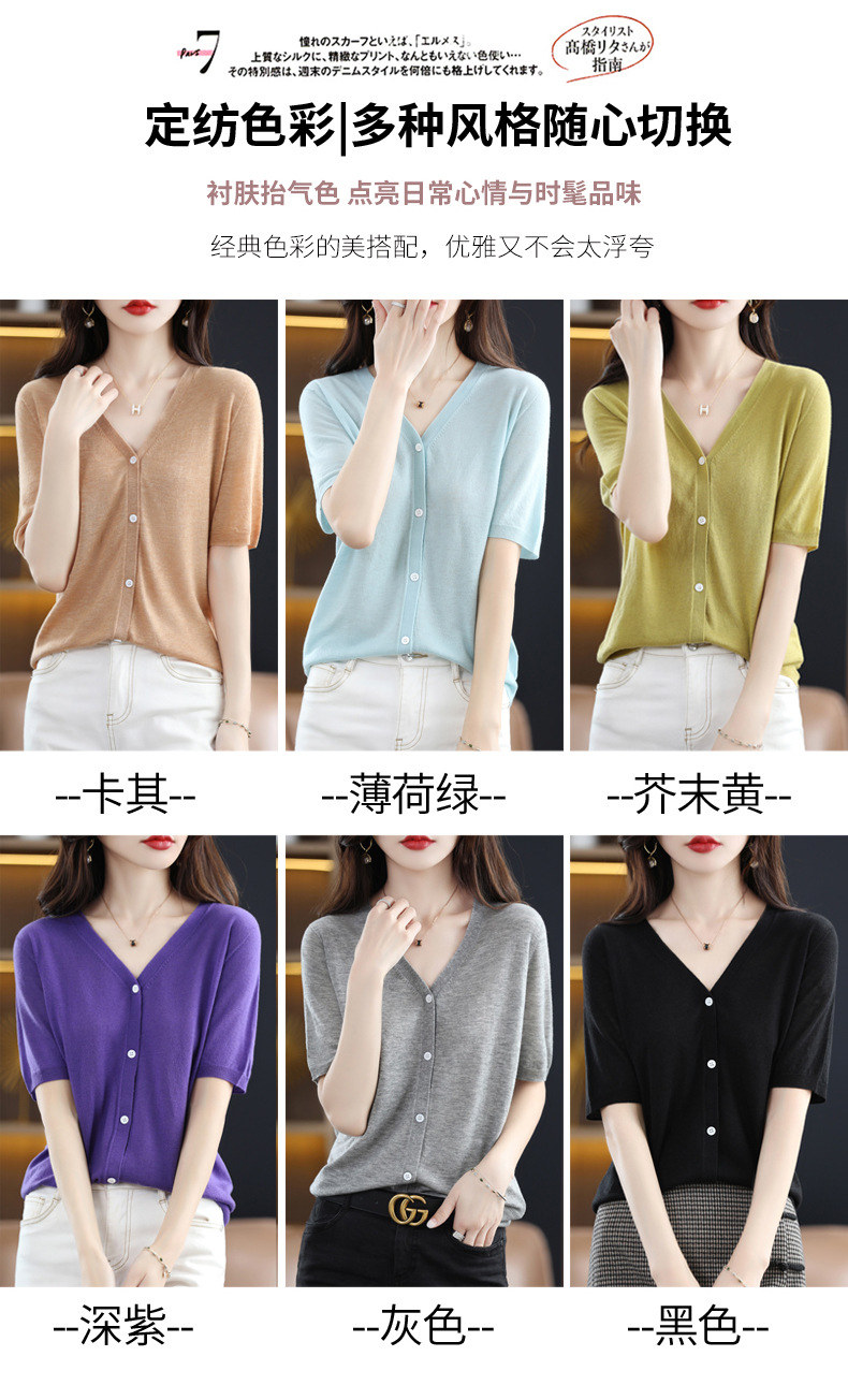 QHJY-JY22105女装夏季新款中袖打底针织衫外套薄款半袖v领羊毛开衫宽松衣