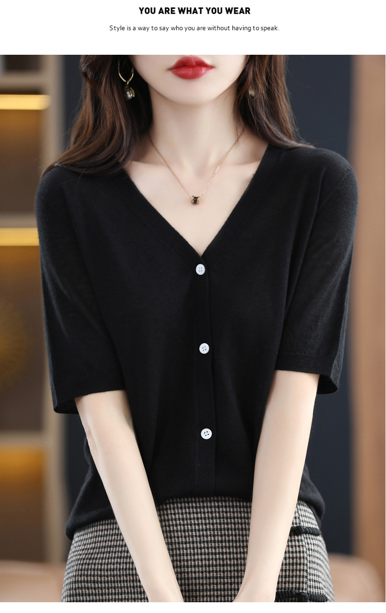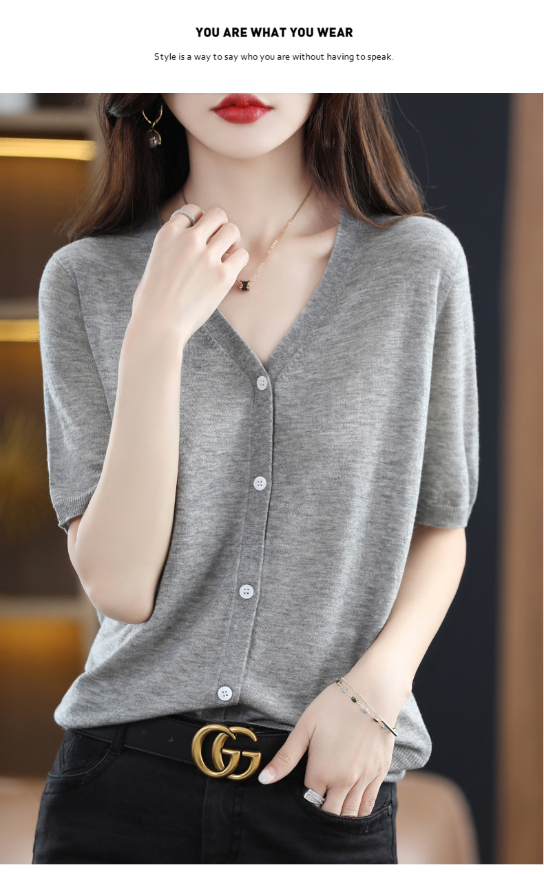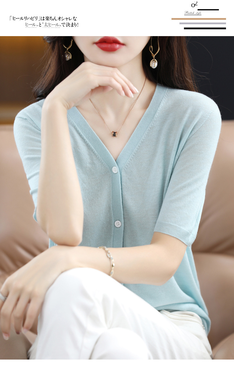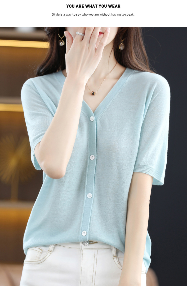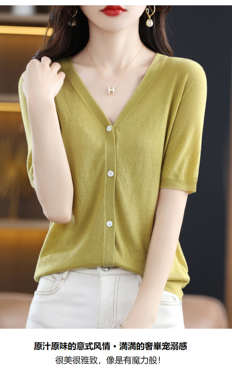 QHJY-JY22105女装夏季新款中袖打底针织衫外套薄款半袖v领羊毛开衫宽松衣