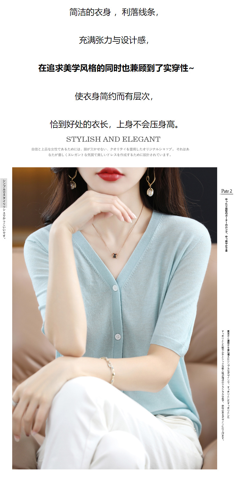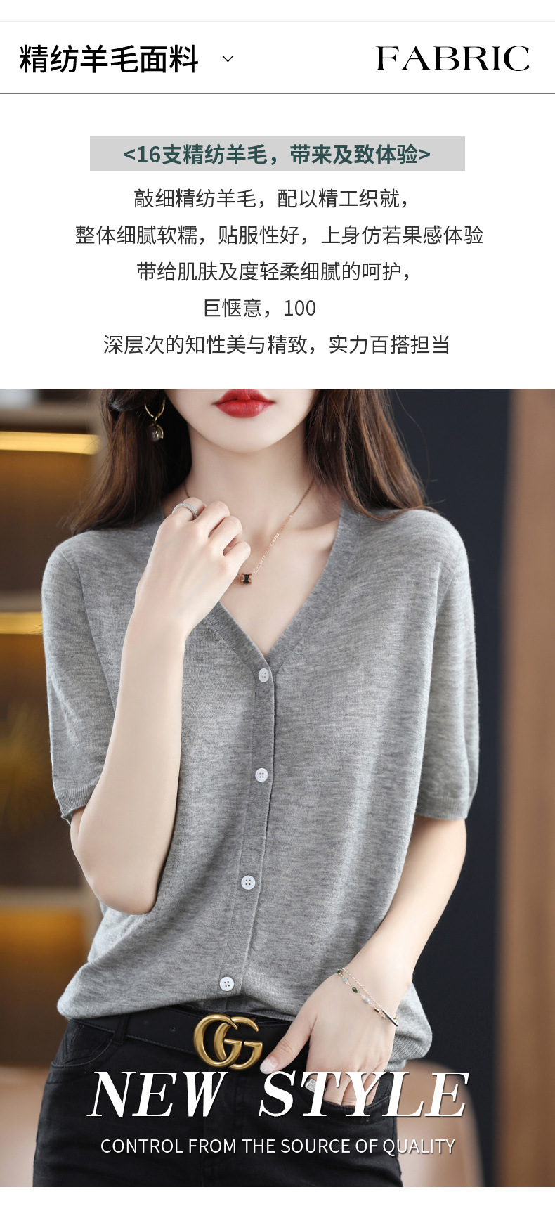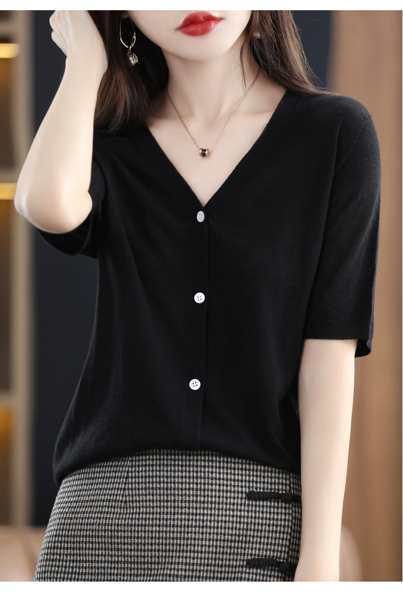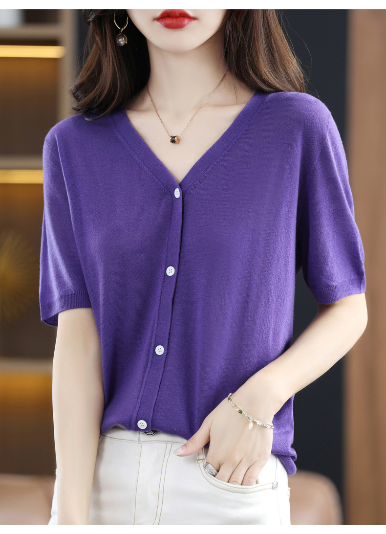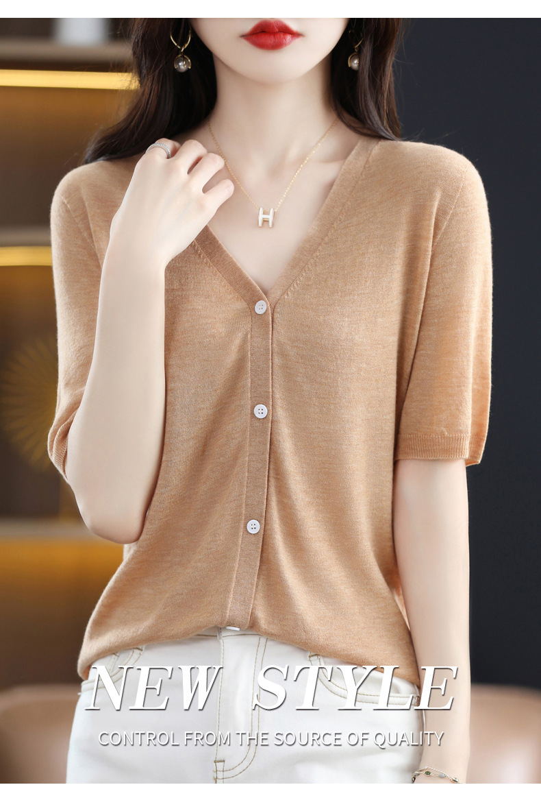 QHJY-JY22105女装夏季新款中袖打底针织衫外套薄款半袖v领羊毛开衫宽松衣