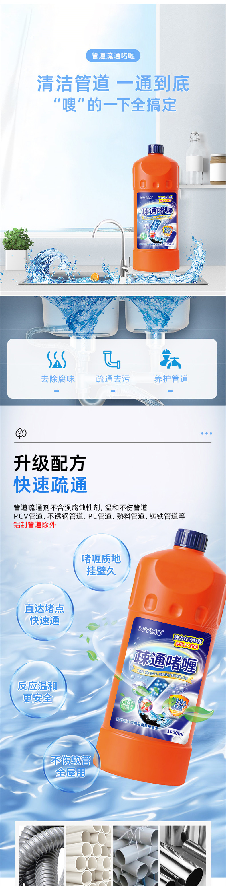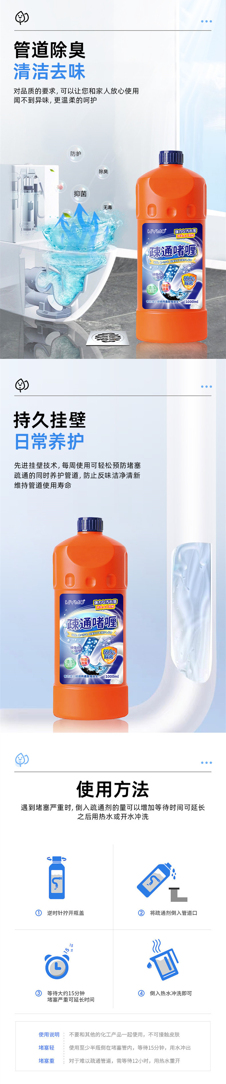 【管道疏通不求人】速效管道疏通家用厨房专用管道通1000ml厨房下水道油污疏通剂清洁。ry