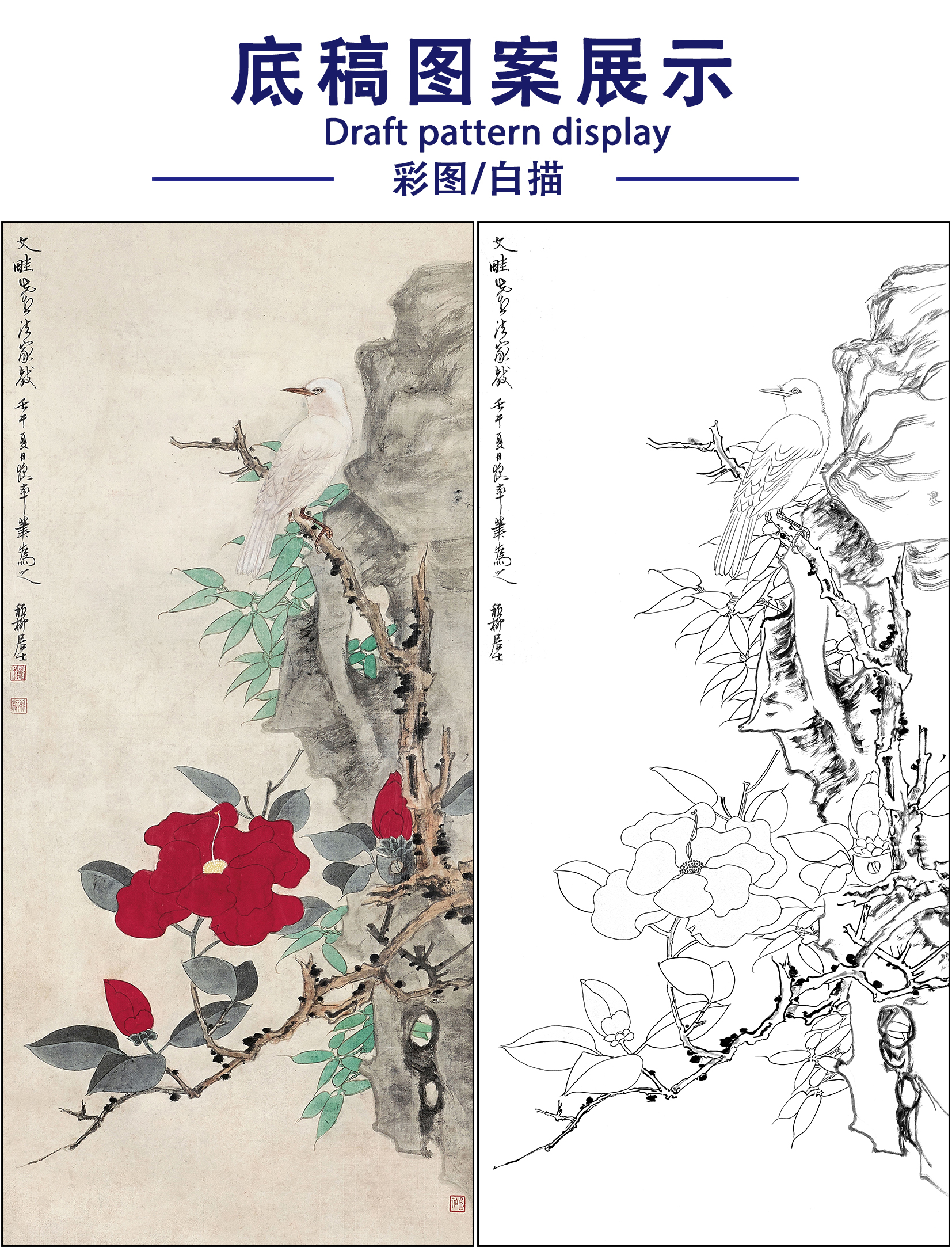 谢稚柳花鸟工笔画白描底稿《富贵白头》临摹勾线高清打印稿XZ10