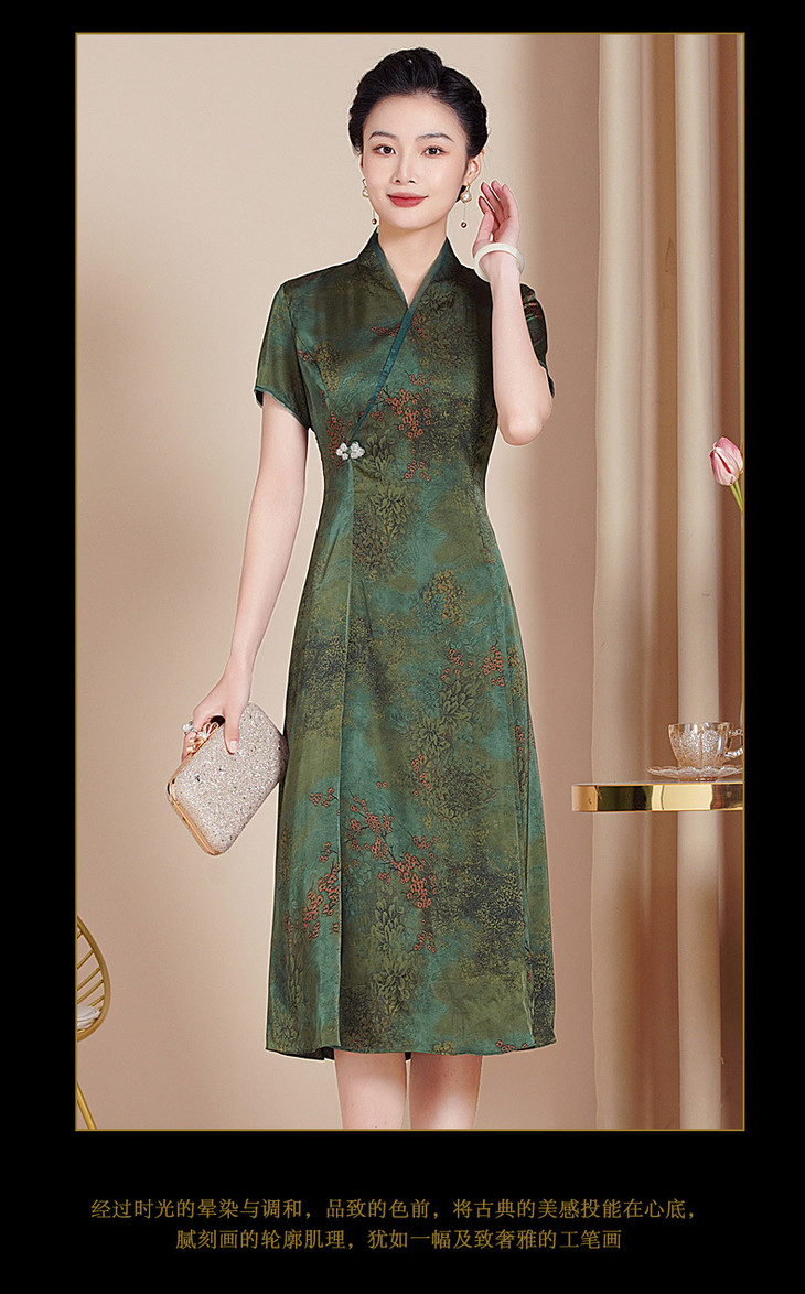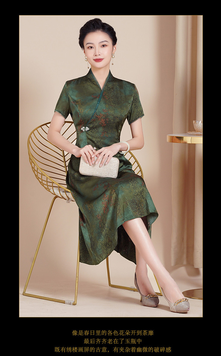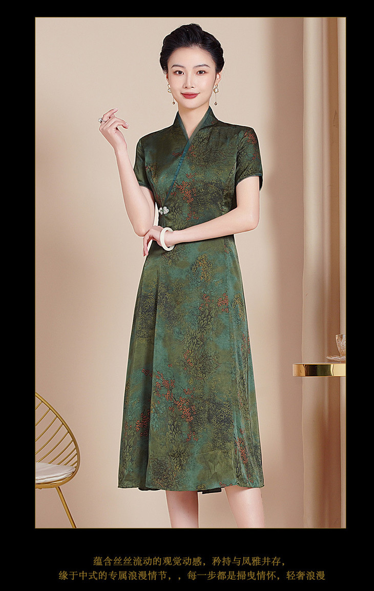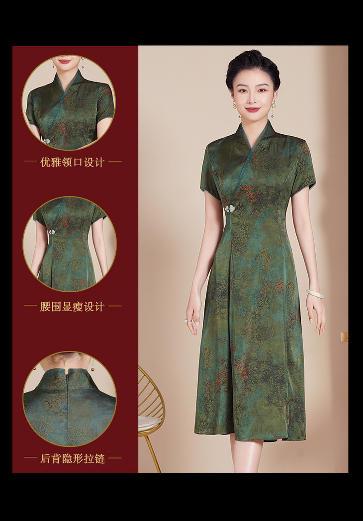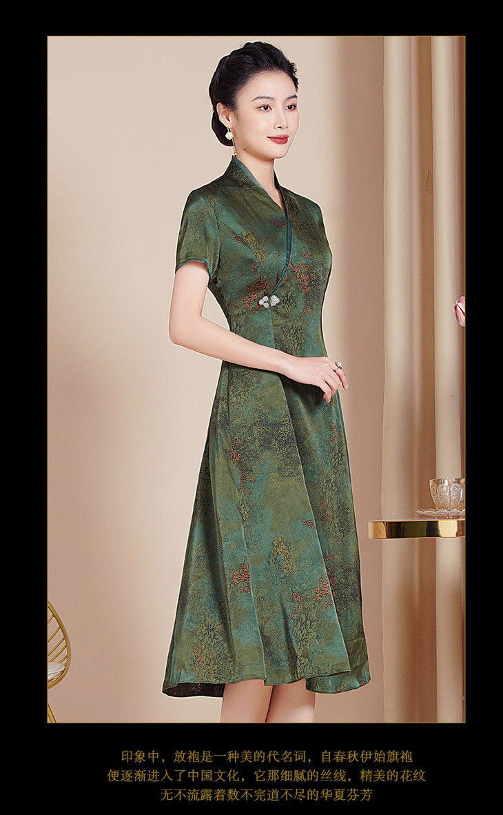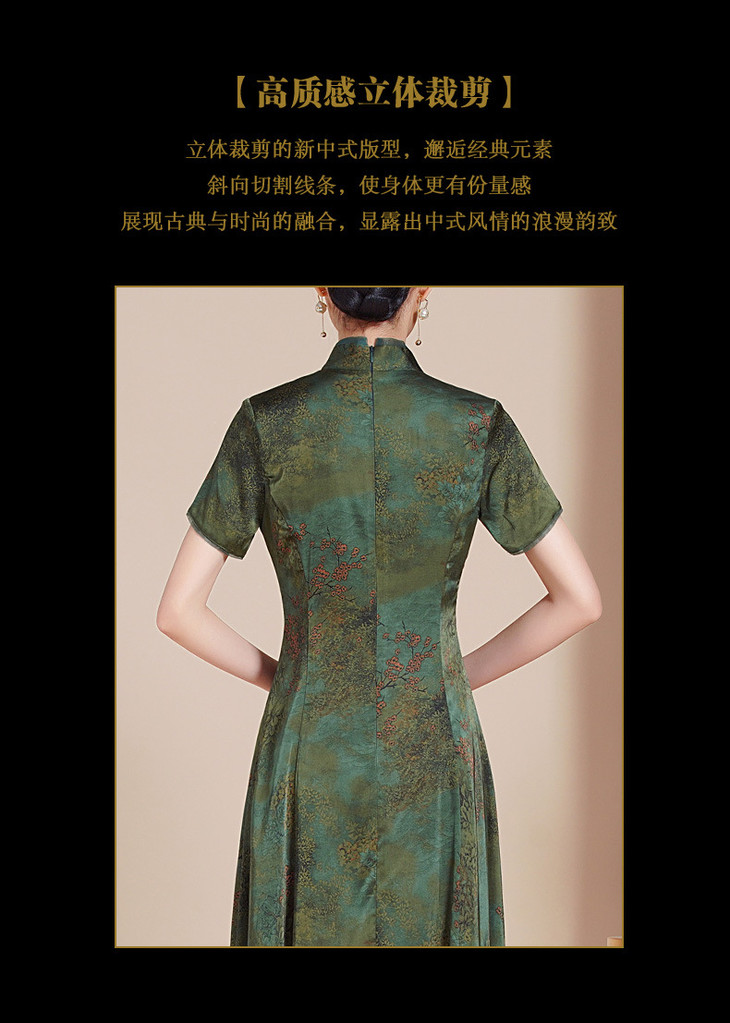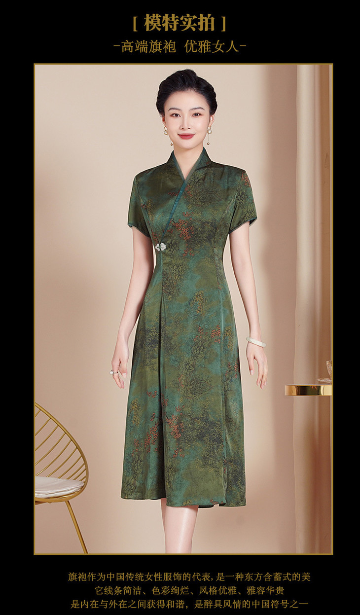 上海旗袍厂改良版墨绿色旗袍女2024新款夏季中长款日常可穿修身新中式连衣裙