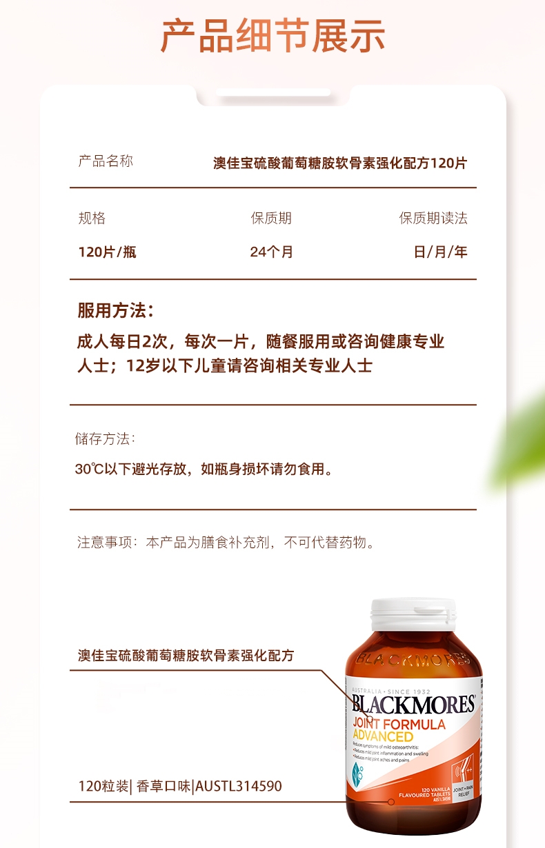 【跨境】澳洲Blackmores 澳佳宝氨糖软骨素加强版钙片 120粒(版本随机) 维骨力成人中老年